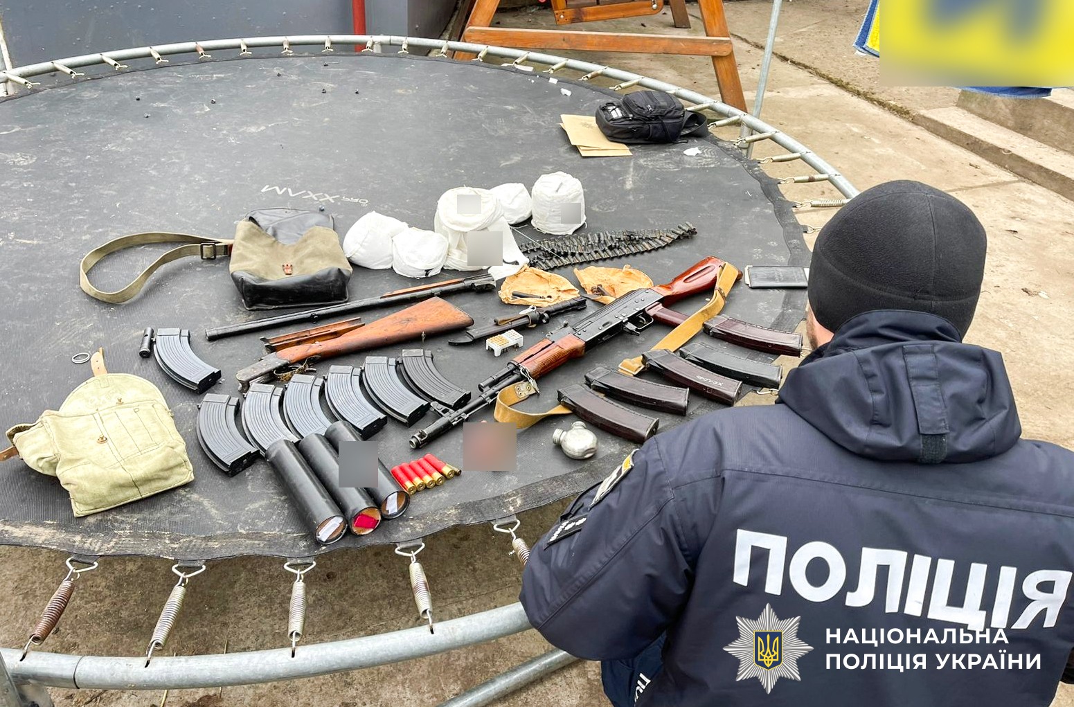 Так, правоохоронці у зловмисників виявили та вилучили: 2 автомати АК-74, комбіновану нарізну рушницю, 2 пістолети з ознаками переробки, мисливську рушницю, 313 патронів різного калібру, 5 кілограмів пороху, 3 бойові гранати та запали до них, 3 димові шашки, 5 штик-ножів, 12 магазинів та комплект до автомата.