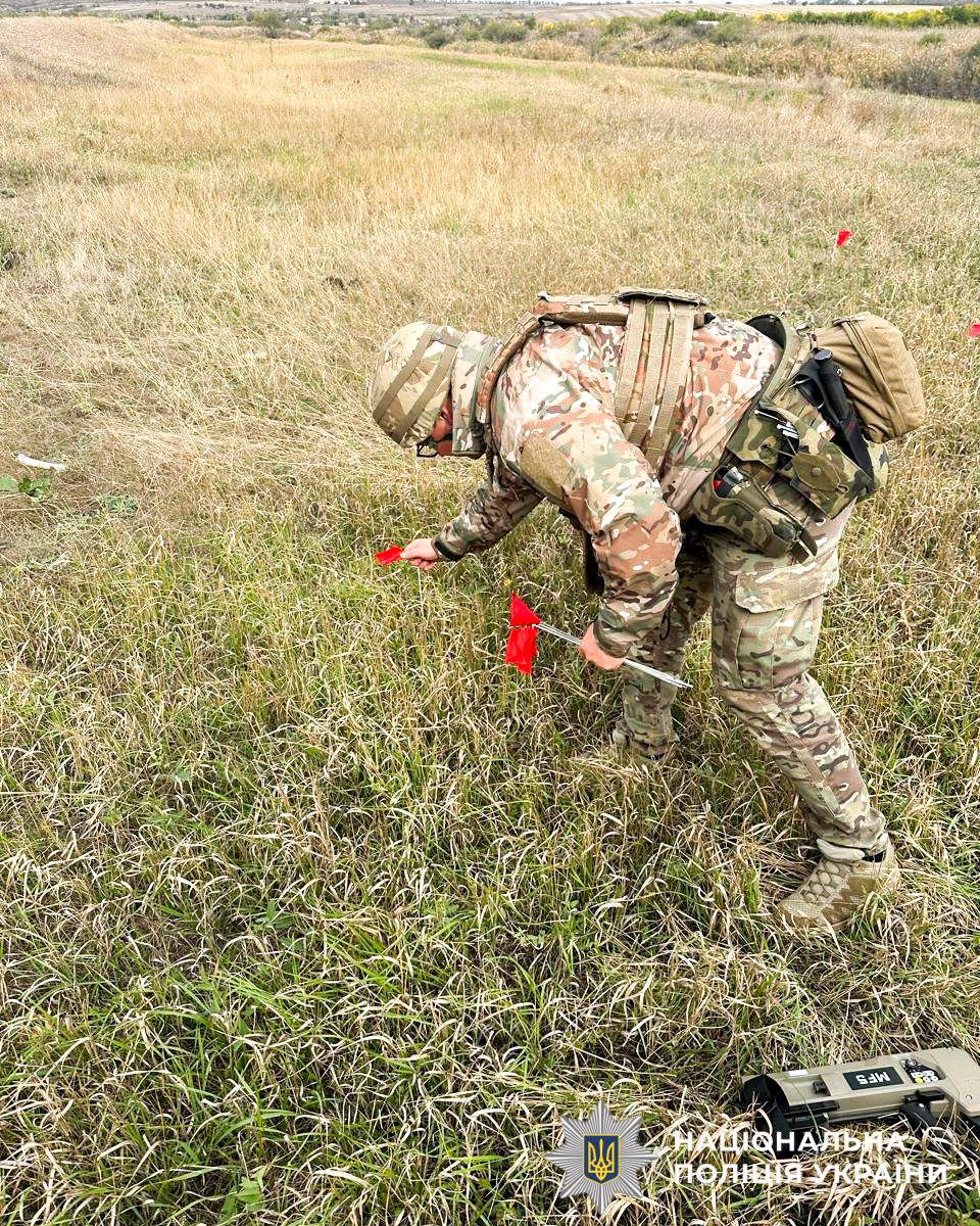 «Місцеві жителі неодноразово зверталися до нас та повідомляли про виявлені протипіхотні міни. Після огляду території за допомогою дрону, ми підносимо вибуховий заряд до небезпечної знахідки, знищуючи її підривом на місці», — розповідає майор поліції Андрій Волянюк.