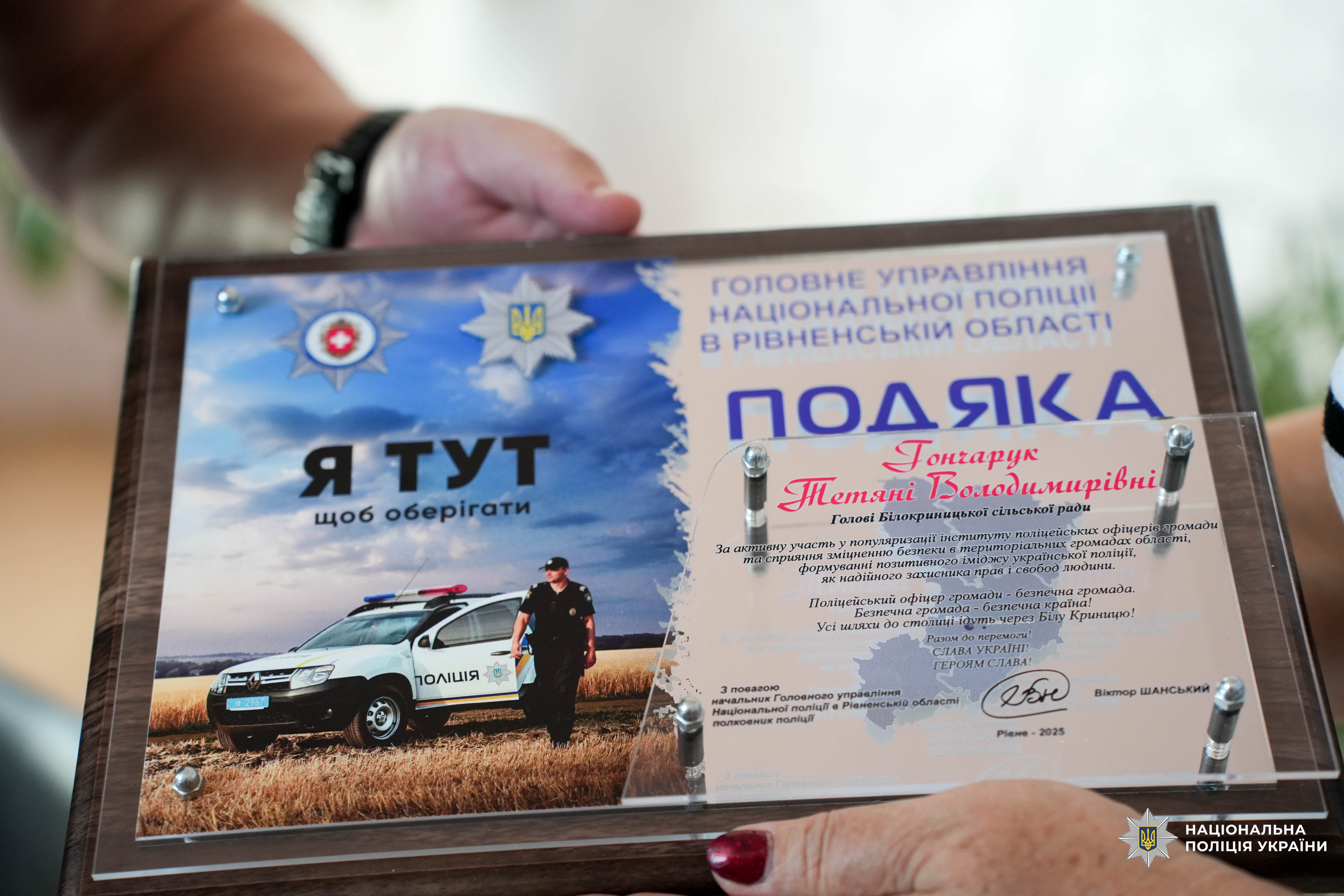 «Безпечна громада - успішна громада»: керівництво поліції Рівненщини відзначило голову Білокриницької громади