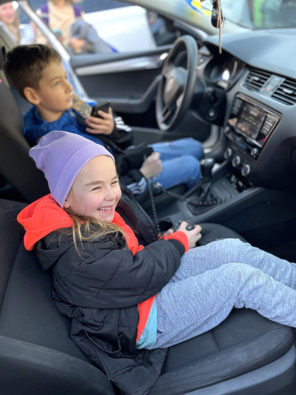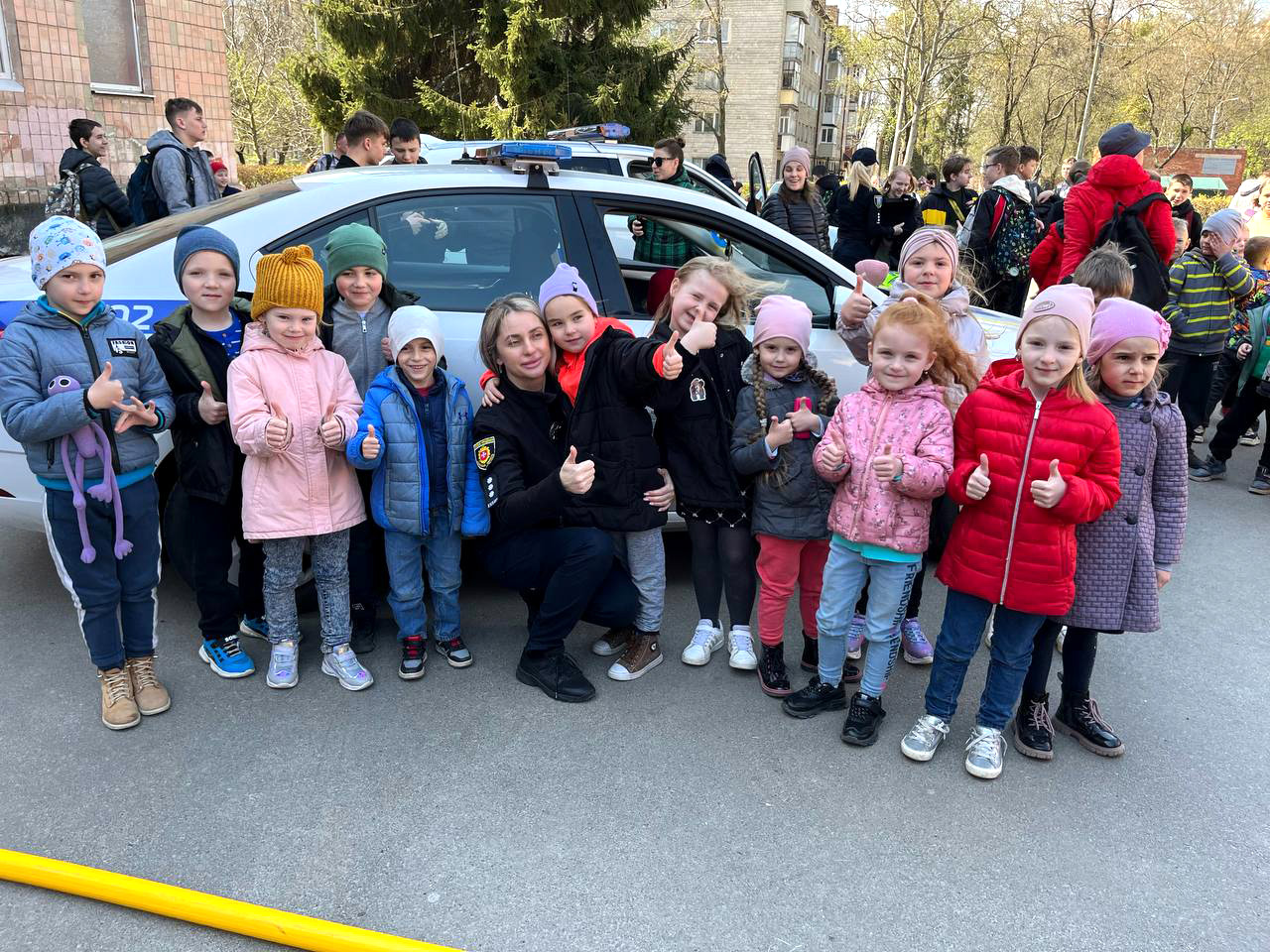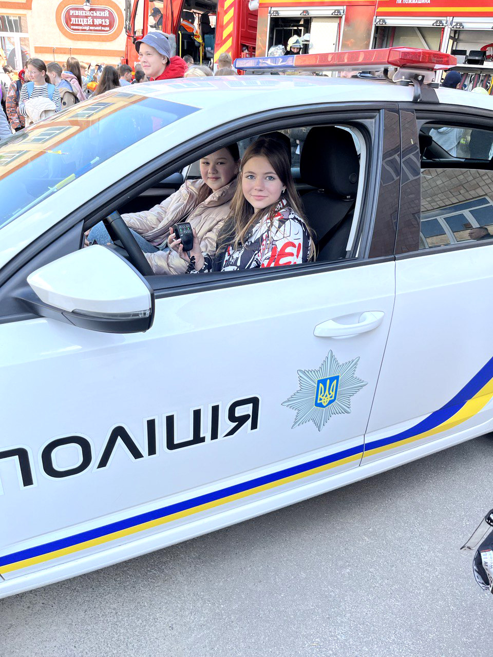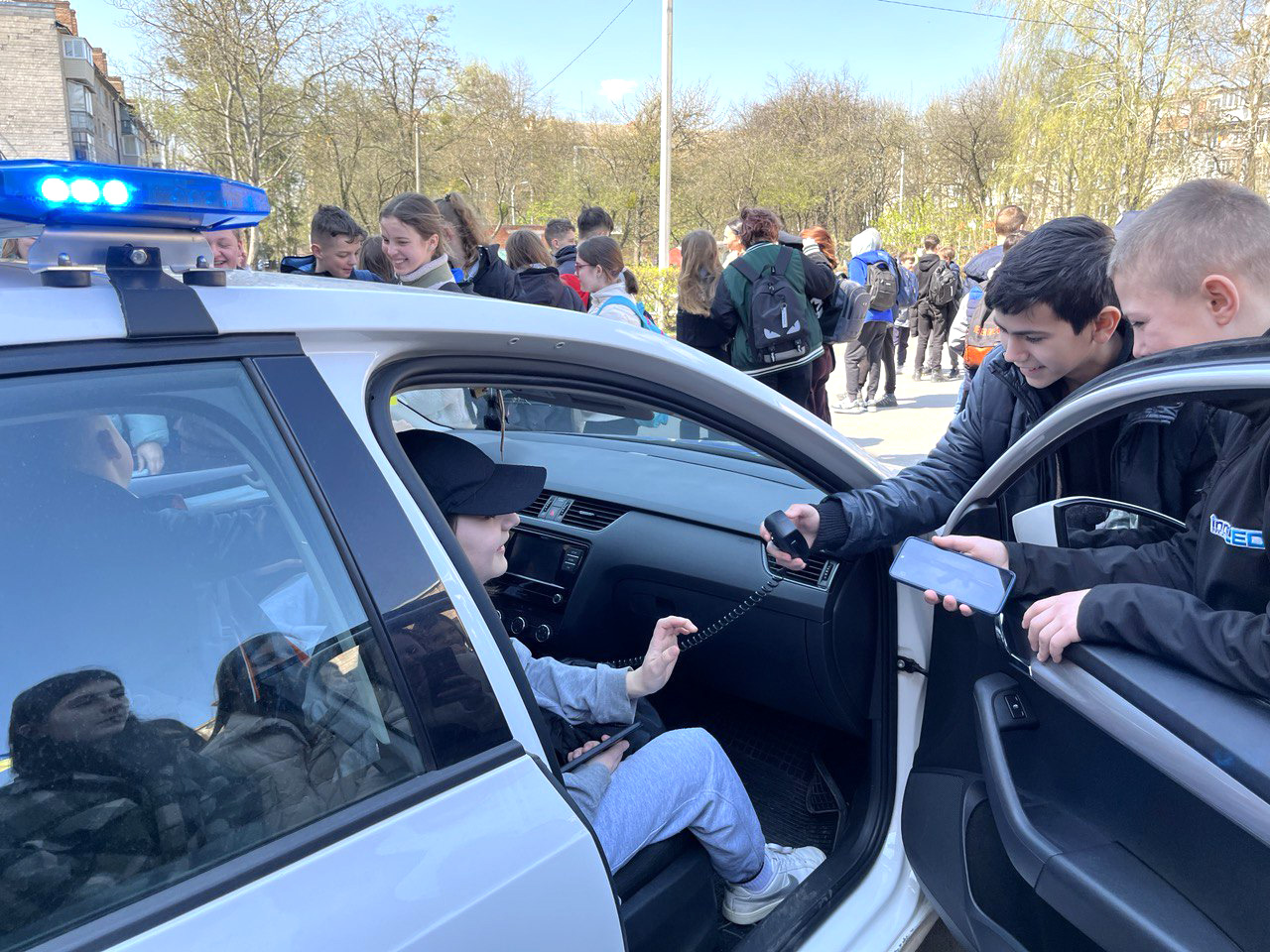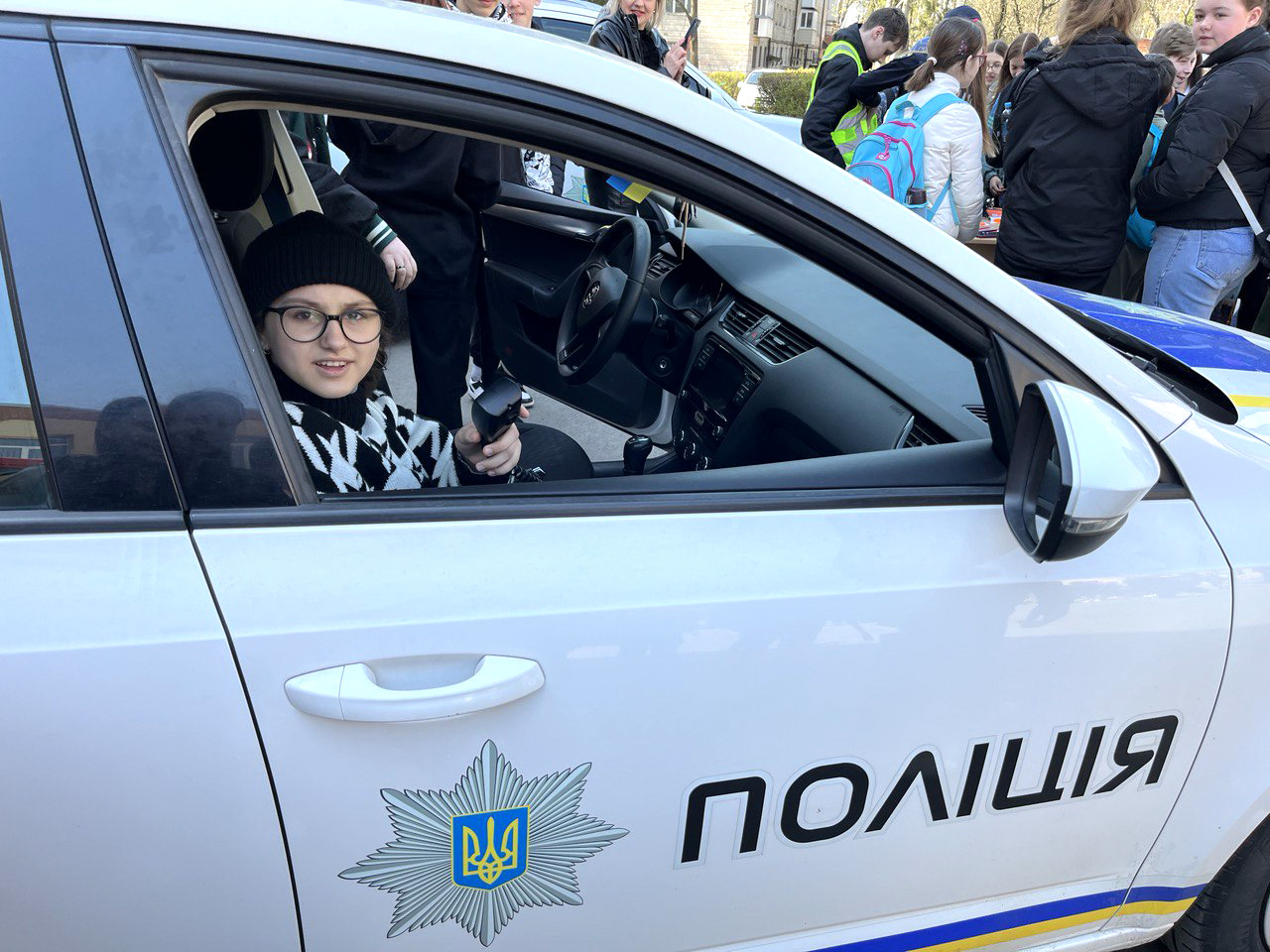 Діти ознайомилися із службовим авто поліцейських: вмикали проблискові маячки та розмовляли гучномовцем.