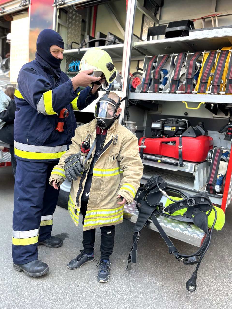 В свою чергу, співробітники ДСНС ознайомили дітей зі спеціальним спорядженням рятувальників та пожежним авто.