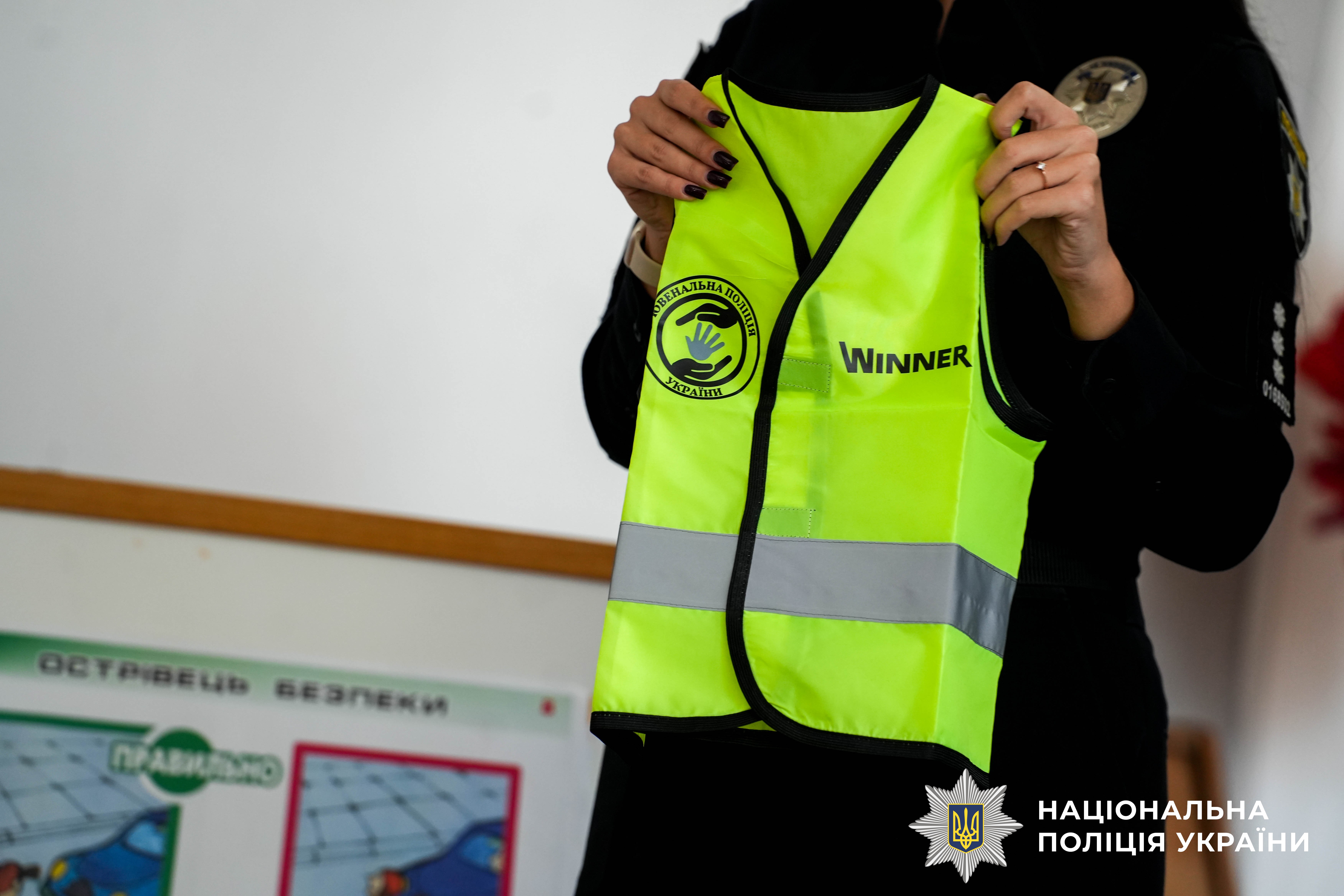 Правоохоронці нагадали дітлахам прості правила безпеки, розповіли вимоги дорожніх знаків, сигнали світлофора та наголосили на обов’язковому носінні у темну пору доби світлоповертальних елементів.