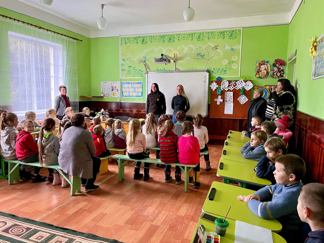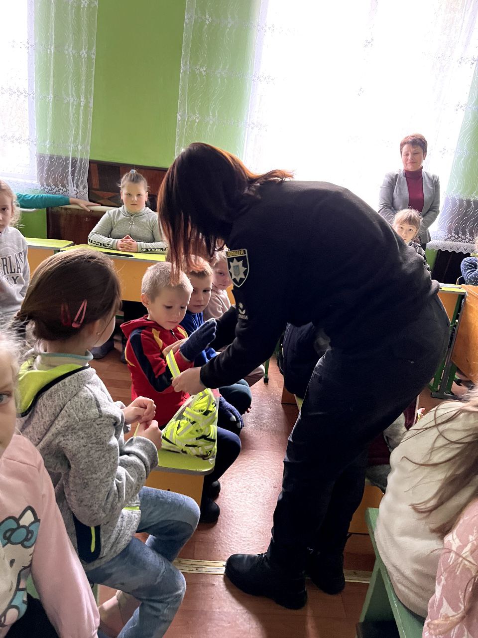 Правоохоронці розповіли дітям про правила безпеки на дорозі: необхідність використання світловідбивальних елементів, які подарували дітям під час зустрічі. Крім того, наголосили про поведінку у зимову пору року біля водойм, заборону спускатися із гірок біля доріг.