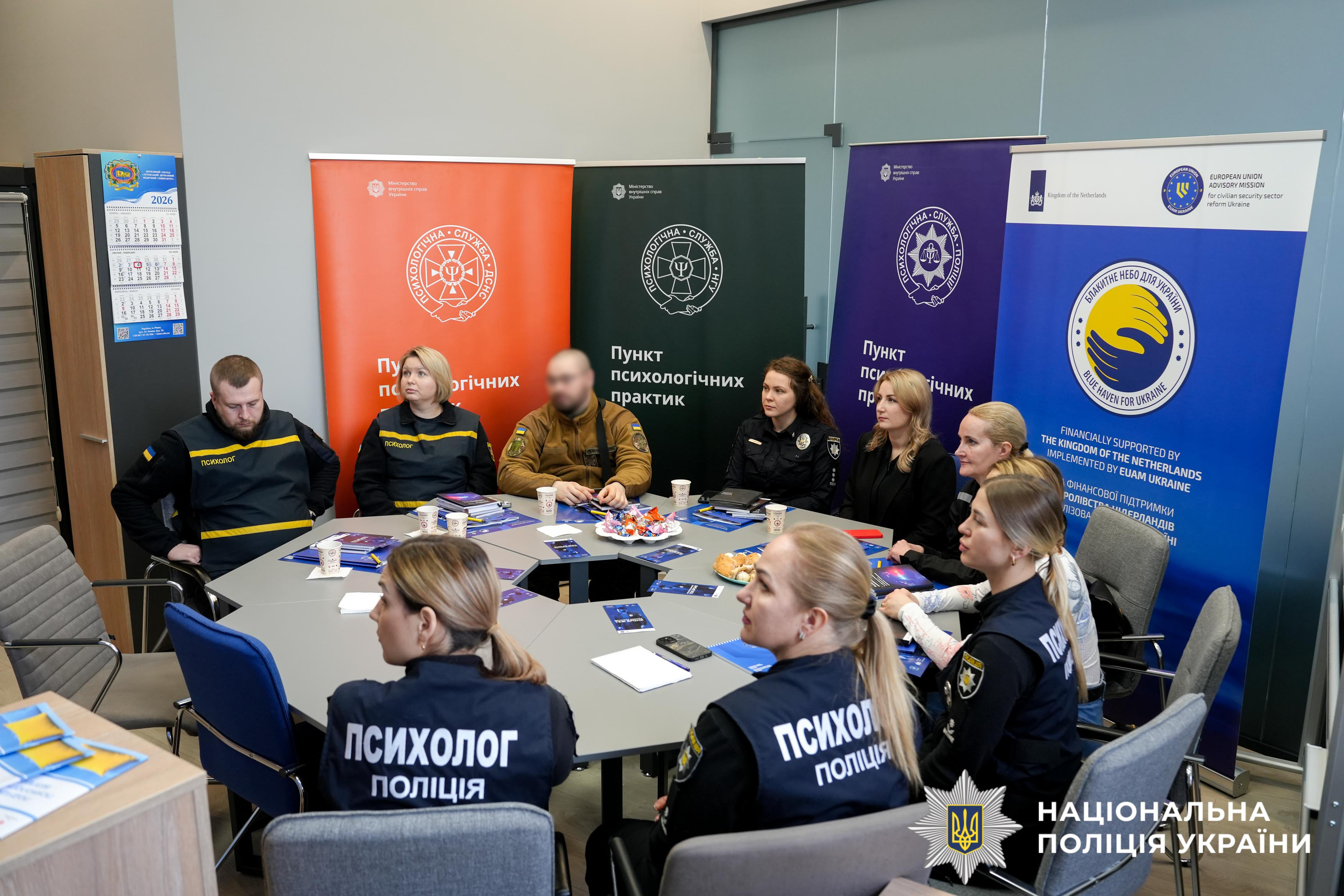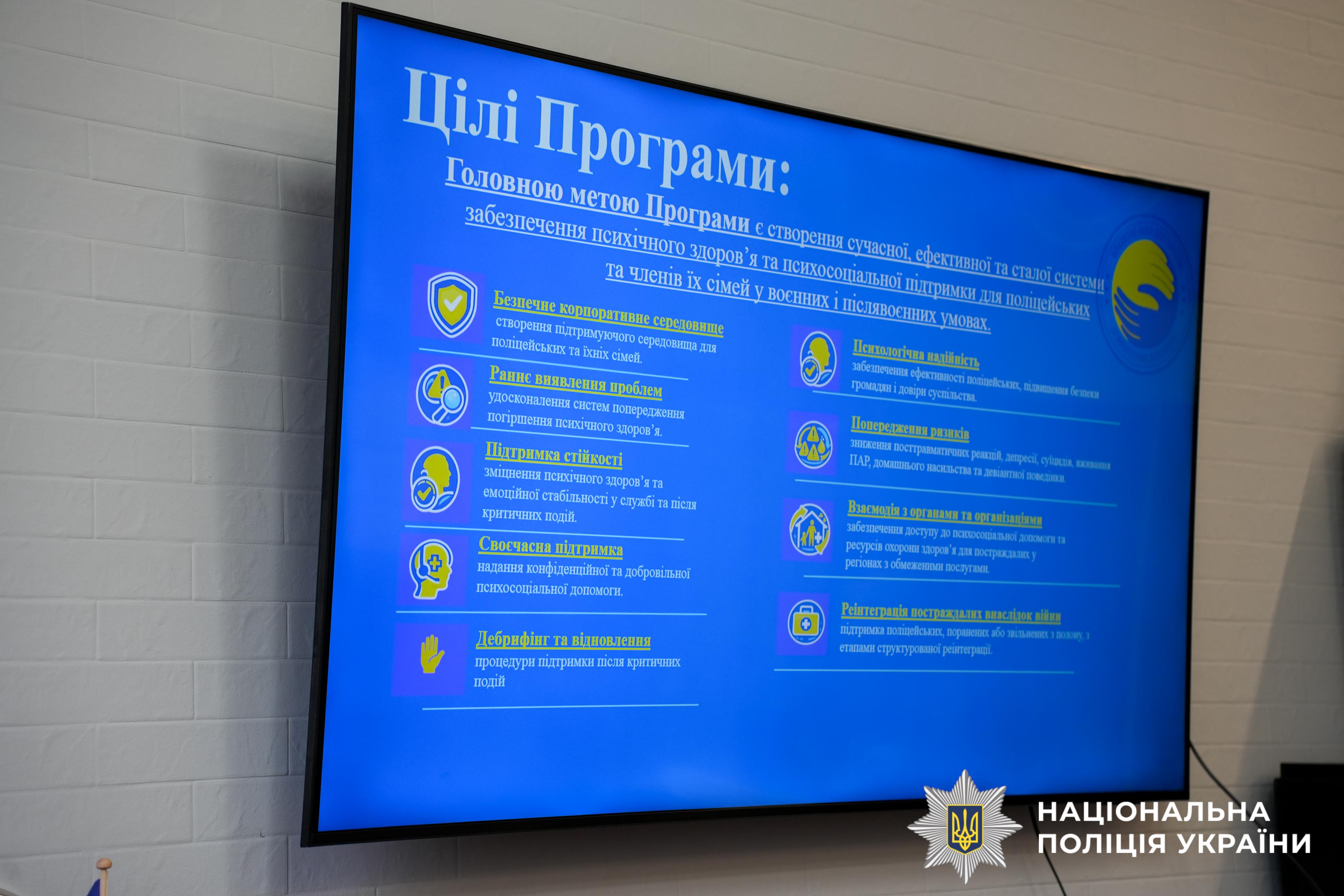 Під час заходу поліцейські-психологи презентували учасникам проктичні аспекти функціонування проєкту психосоціальної підтримки поліцейських, який ґрунтується на принципах колегіально-товариської підтримки, взаємної довіри та професійної взаємодії між колегами.