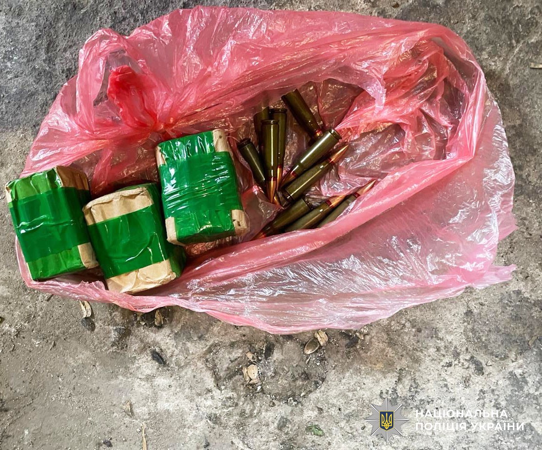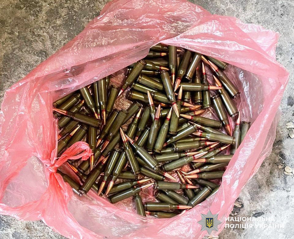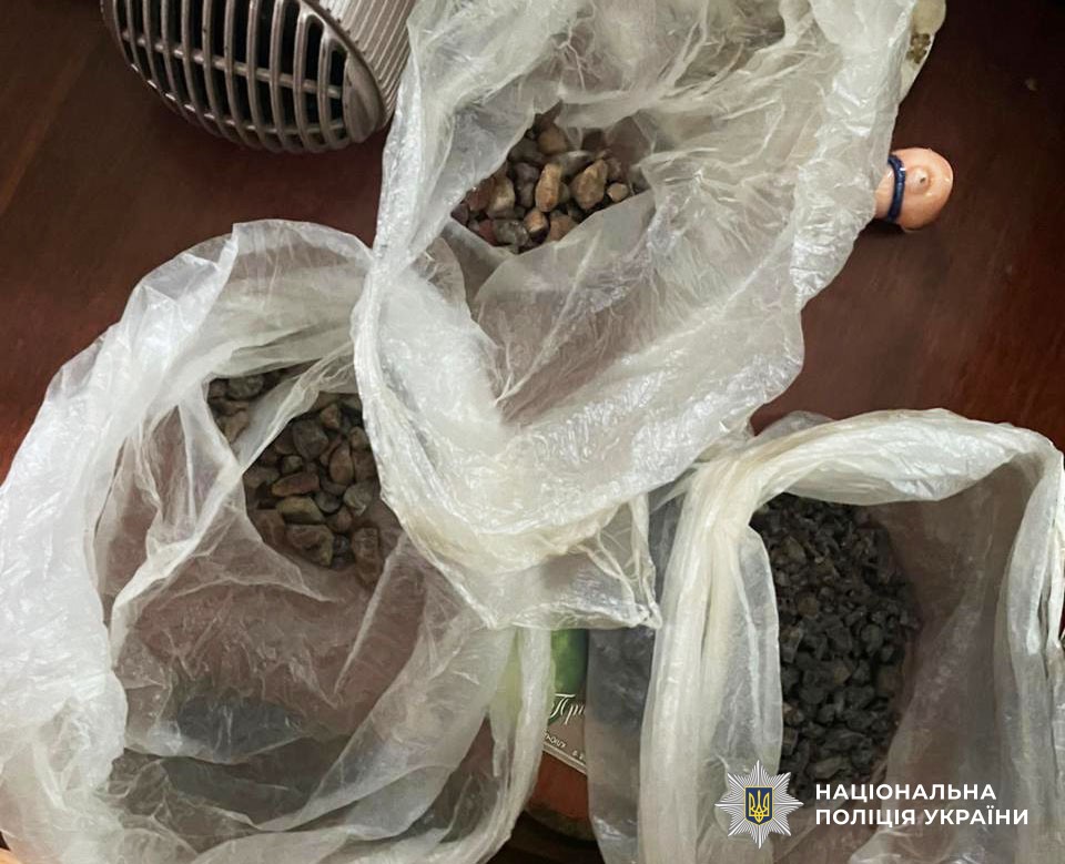 Так, під час слідчих дій у кімнаті будинку працівники поліції виявили та вилучили бурштин-сирець, а у підсобному приміщенні — «сонячне» каміння та 106 патронів різного калібру.