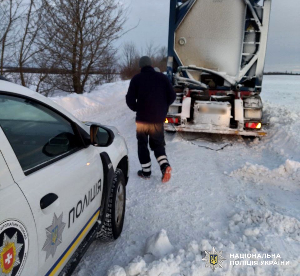 А до поліцейського офіцера Боремельської тергромади, що на Дубенщині, днями звернулися місцеві жителі: на автодорозі через снігові замети не можуть розминутися фура і автобус. Вантажівка «застрягла» і заблокувала рух.
