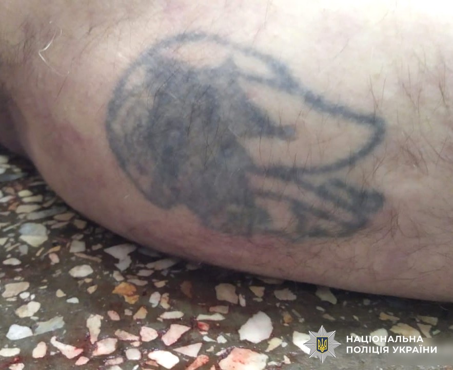 На вигляд чоловіку— 40-50 років, зріст 180 см, середньої тілобудови, волосся сиве коротке, обличчя овальне. На правому плечі татуювання.
