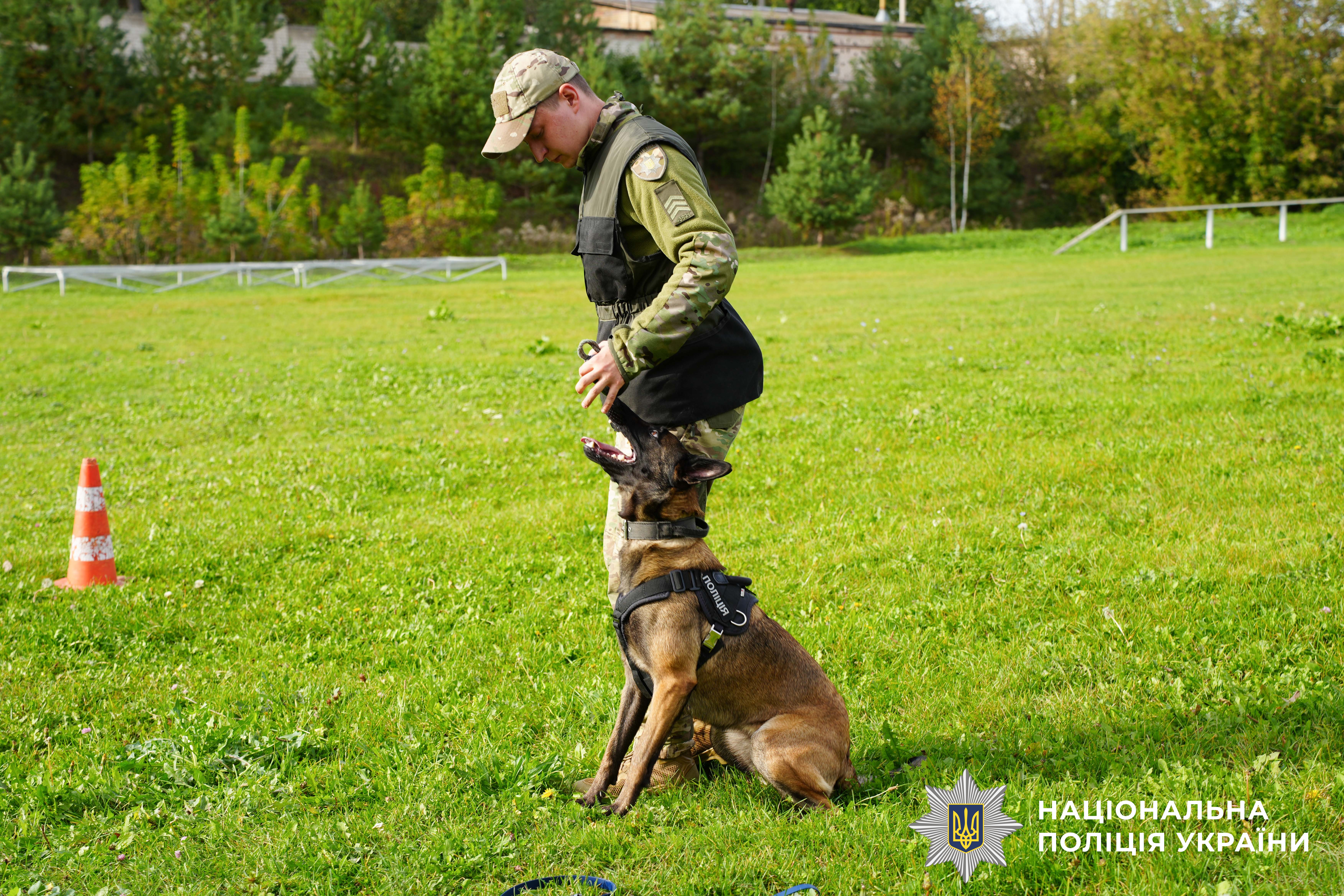 Молодший інспектор-кінолог Віталій Полтавченко разом зі своєю напарницею бельгійською вівчаркою «Хані» продемонстрували навички слухняності, а потім — працювали з пораненими.