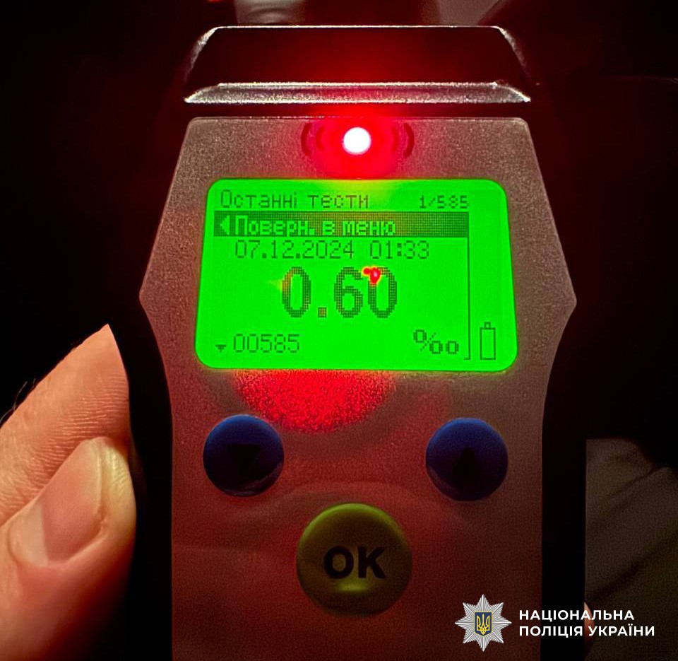 Під час спілкування з керманичем, 18-річним здолбунівчанином, правоохоронці виявили у нього ознаки алкогольного сп’яніння, що і підтвердив прилад «Драгер» — 0,60 проміле. Крім того, у нього не було посвідчення водія.