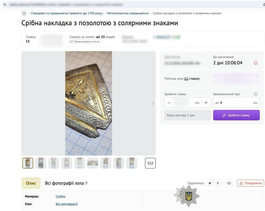 Поліцейські встановили особу, яка розмістила на спеціалізованому онлайн-аукціоні лот під назвою «Срібна накладка з позолотою з солярними знаками».