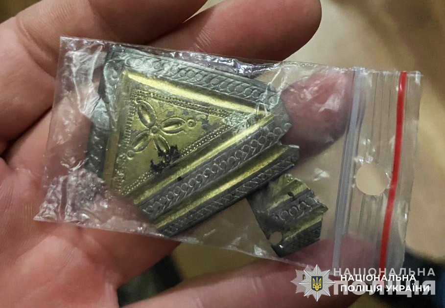 Порушник намагався продати унікальну трикутну срібну накладку, густо декоровану штемпелем, черню та ртутним золоченням. Керівництво Національного музею історії України звернулося до правоохоронців, коли виявили оголошення на одному з онлайн-аукціонів.