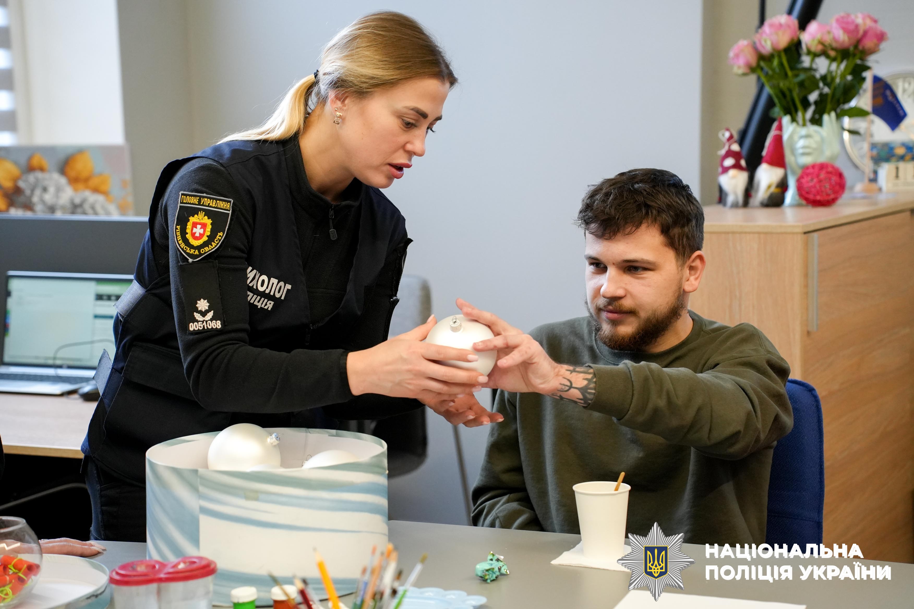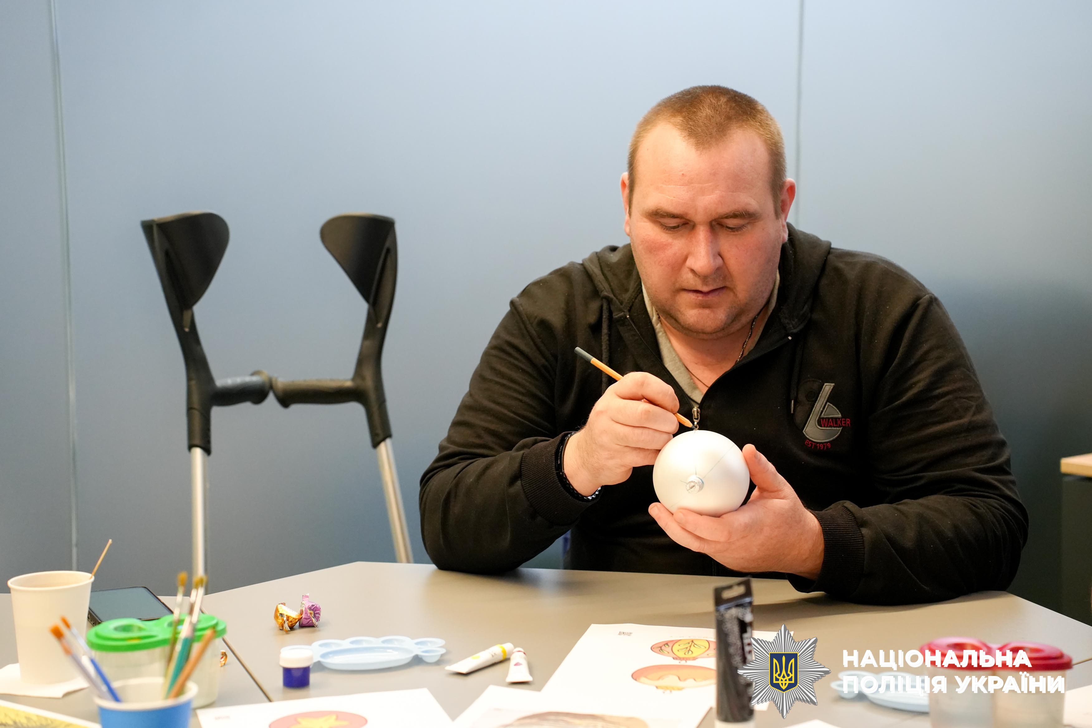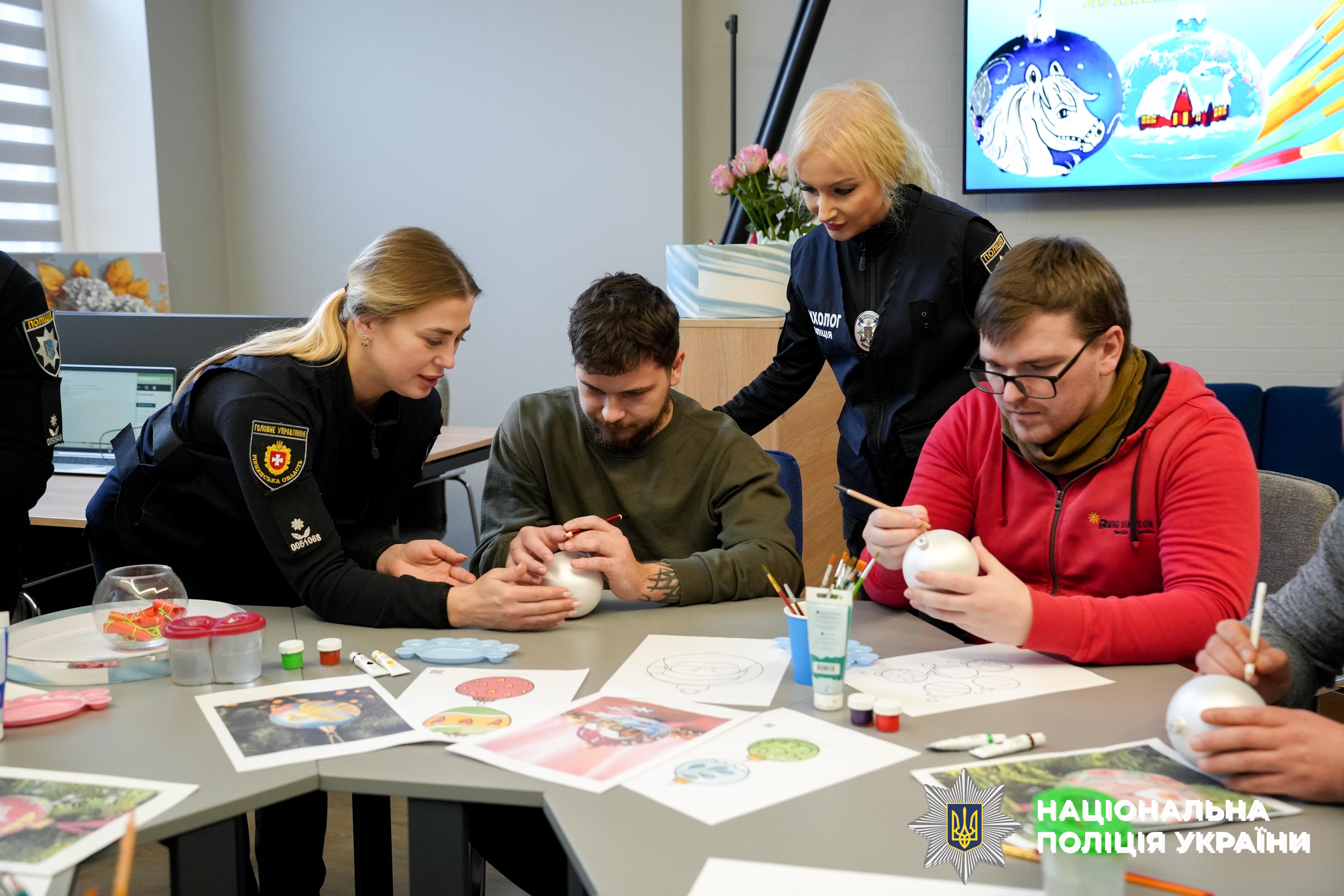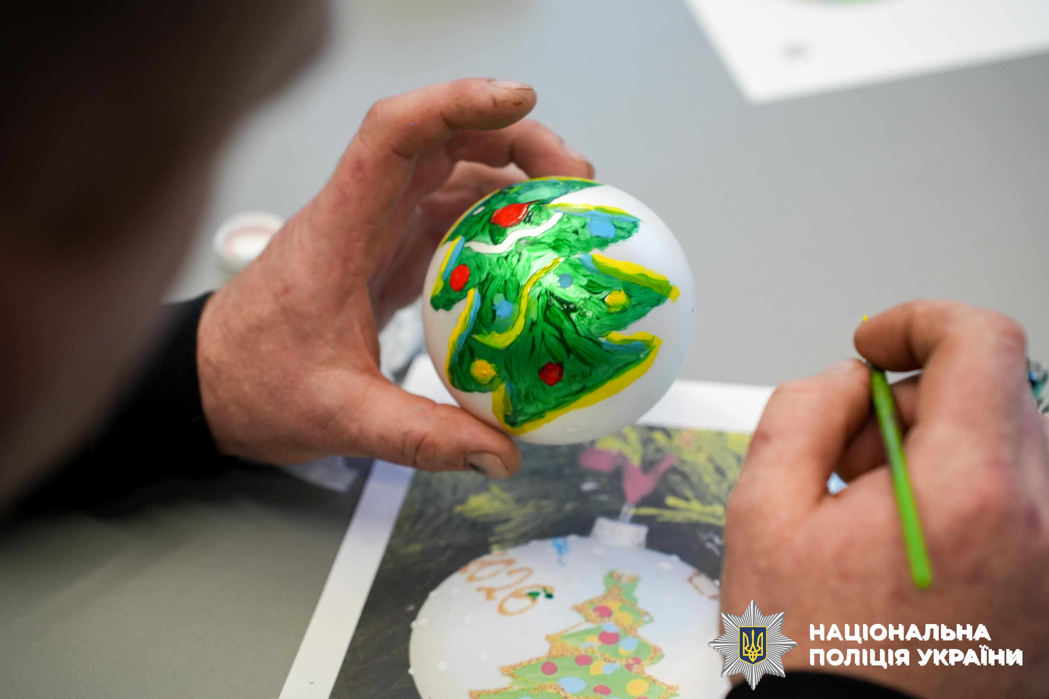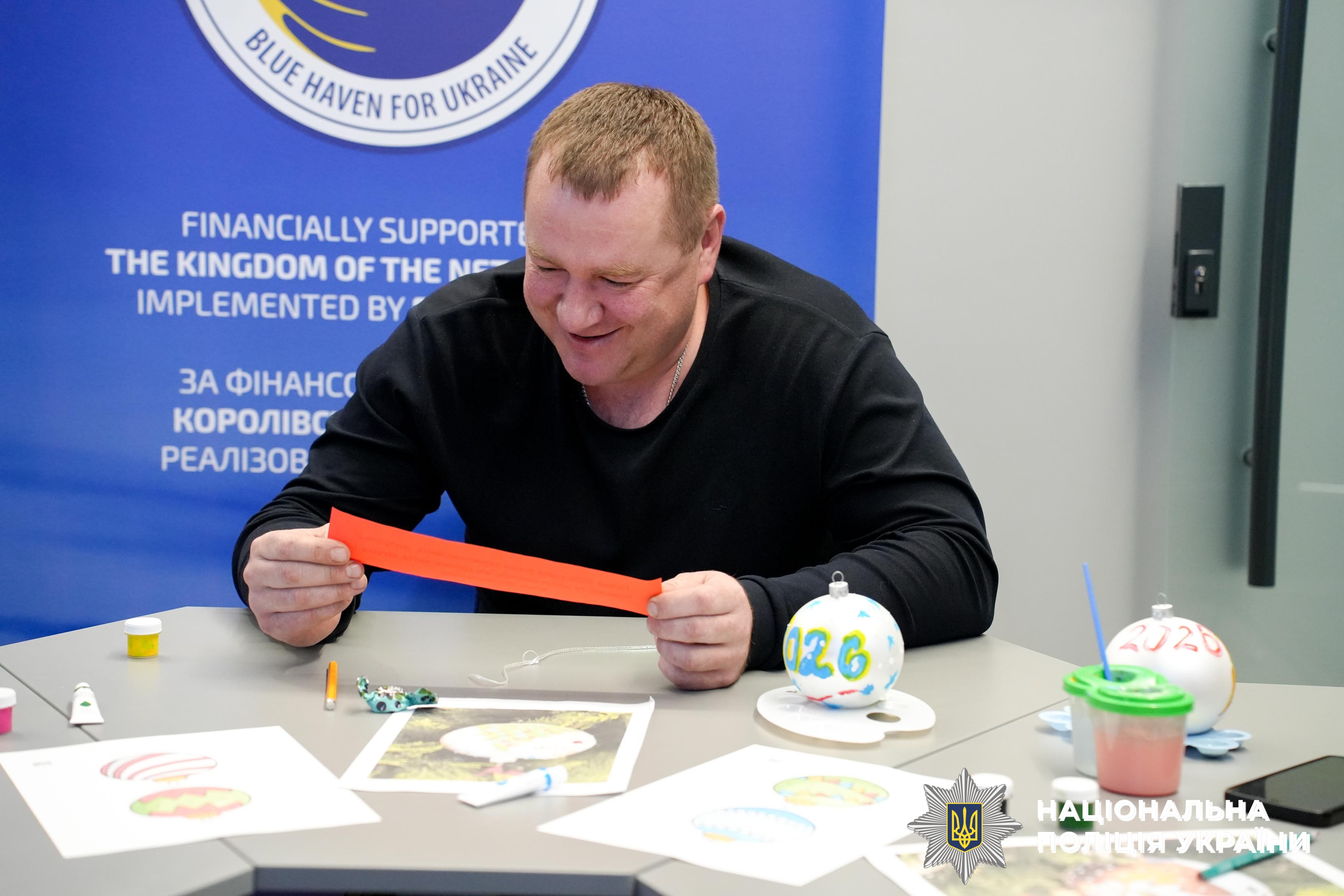 Так, у просторі соціально-психологічної підтримки «Блакитне небо для України» бійці створювали унікальні ялинкові прикраси, вкладаючи у кожну кульку власні емоції та мрії. Дехто з поранених обирав елементи, пов’язані з образом Коня — символом прийдешнього 2026 року. Ці риси надзвичайно відгукуються нашим поліцейським, адже саме наполегливість, воля та незламність допомагають їм рухатися вперед.