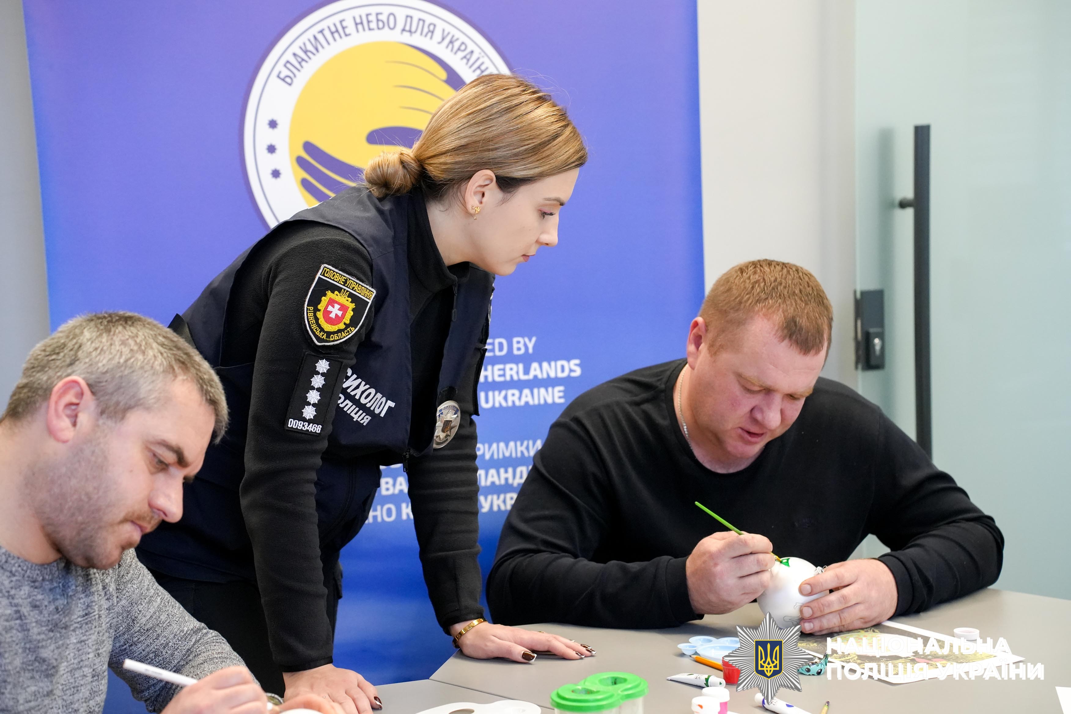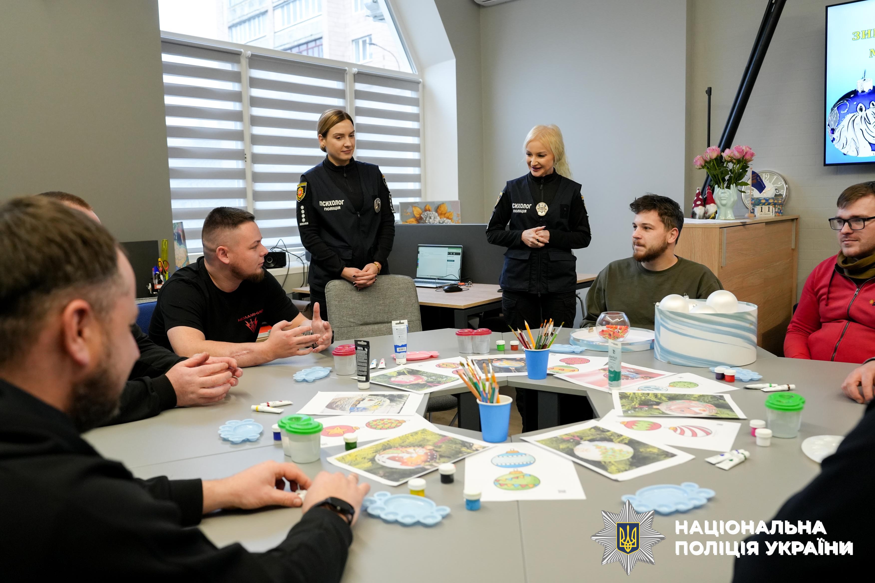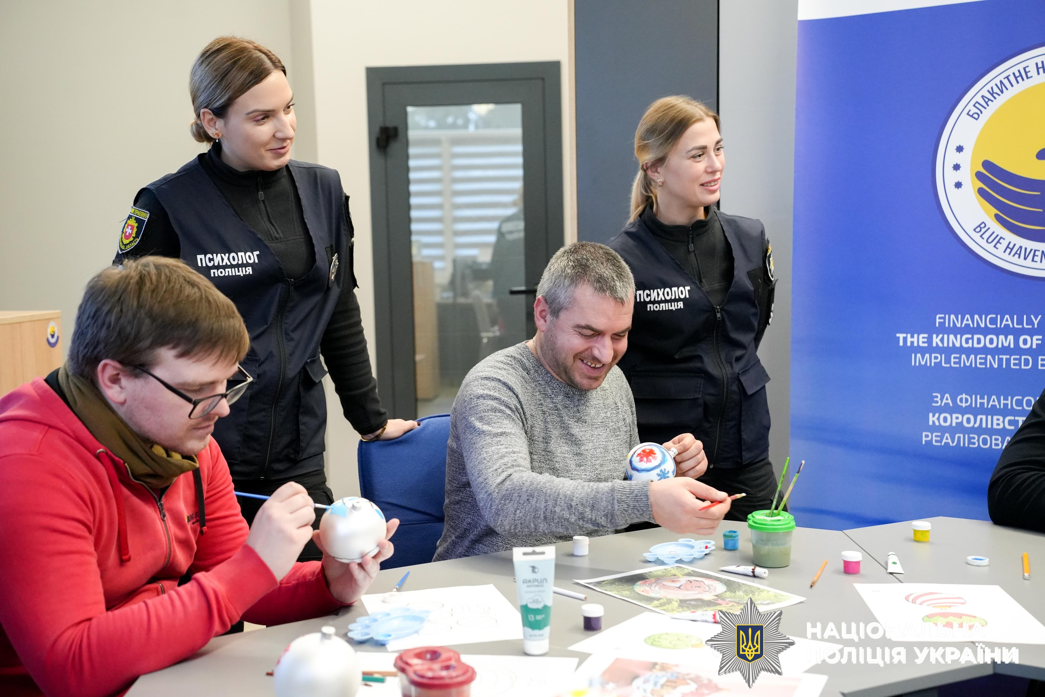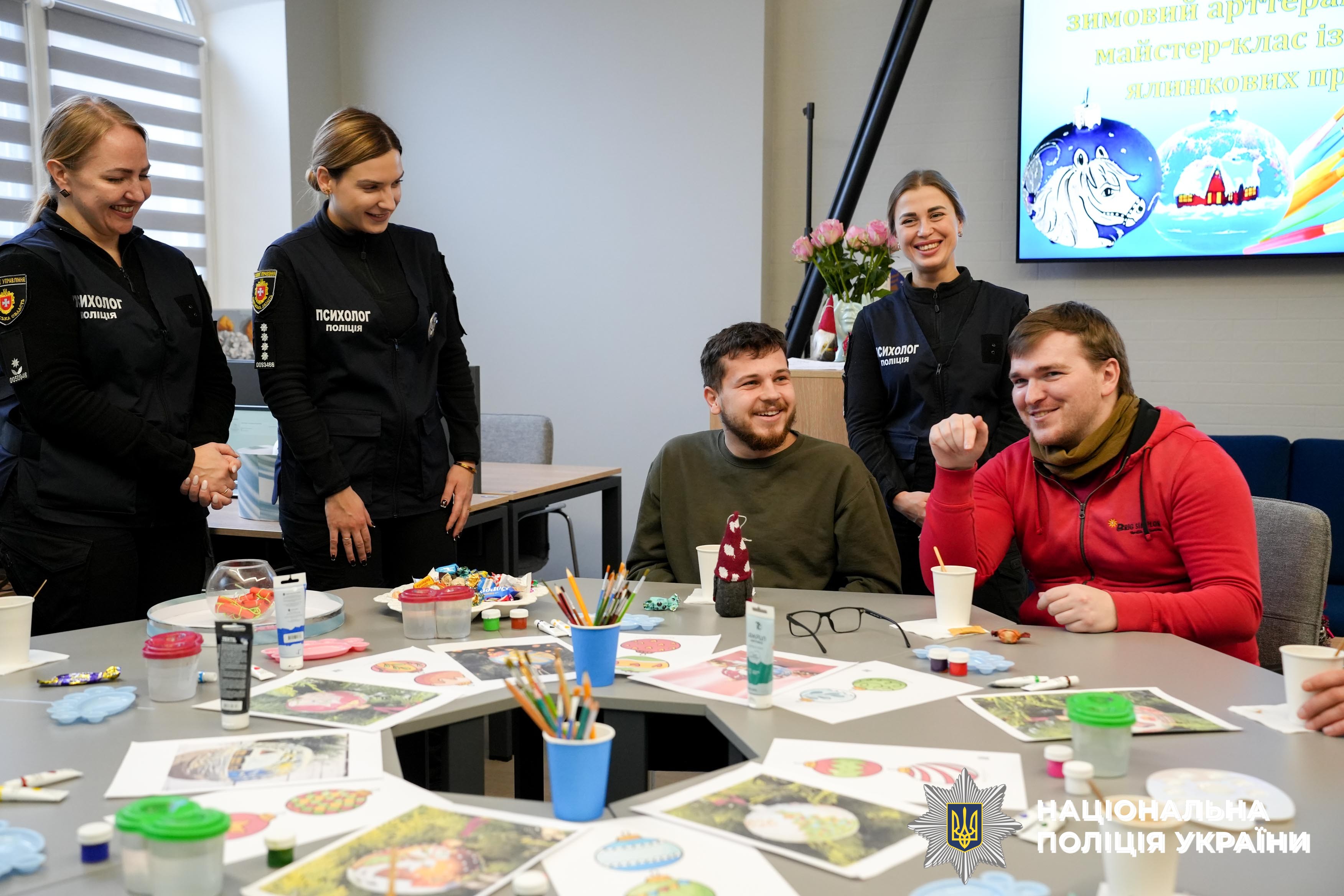 Так, у просторі соціально-психологічної підтримки «Блакитне небо для України» бійці створювали унікальні ялинкові прикраси, вкладаючи у кожну кульку власні емоції та мрії. Дехто з поранених обирав елементи, пов’язані з образом Коня — символом прийдешнього 2026 року. Ці риси надзвичайно відгукуються нашим поліцейським, адже саме наполегливість, воля та незламність допомагають їм рухатися вперед.