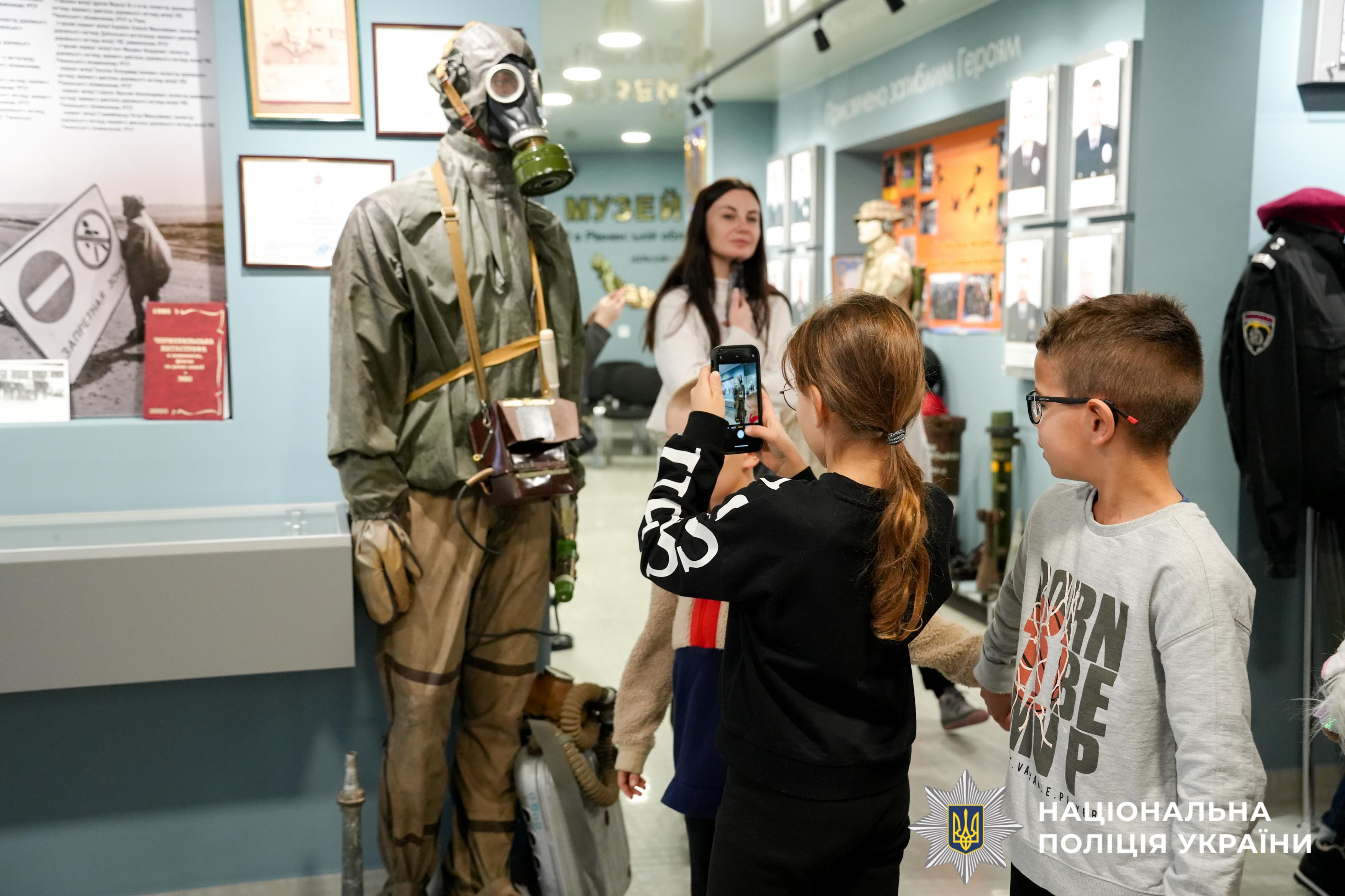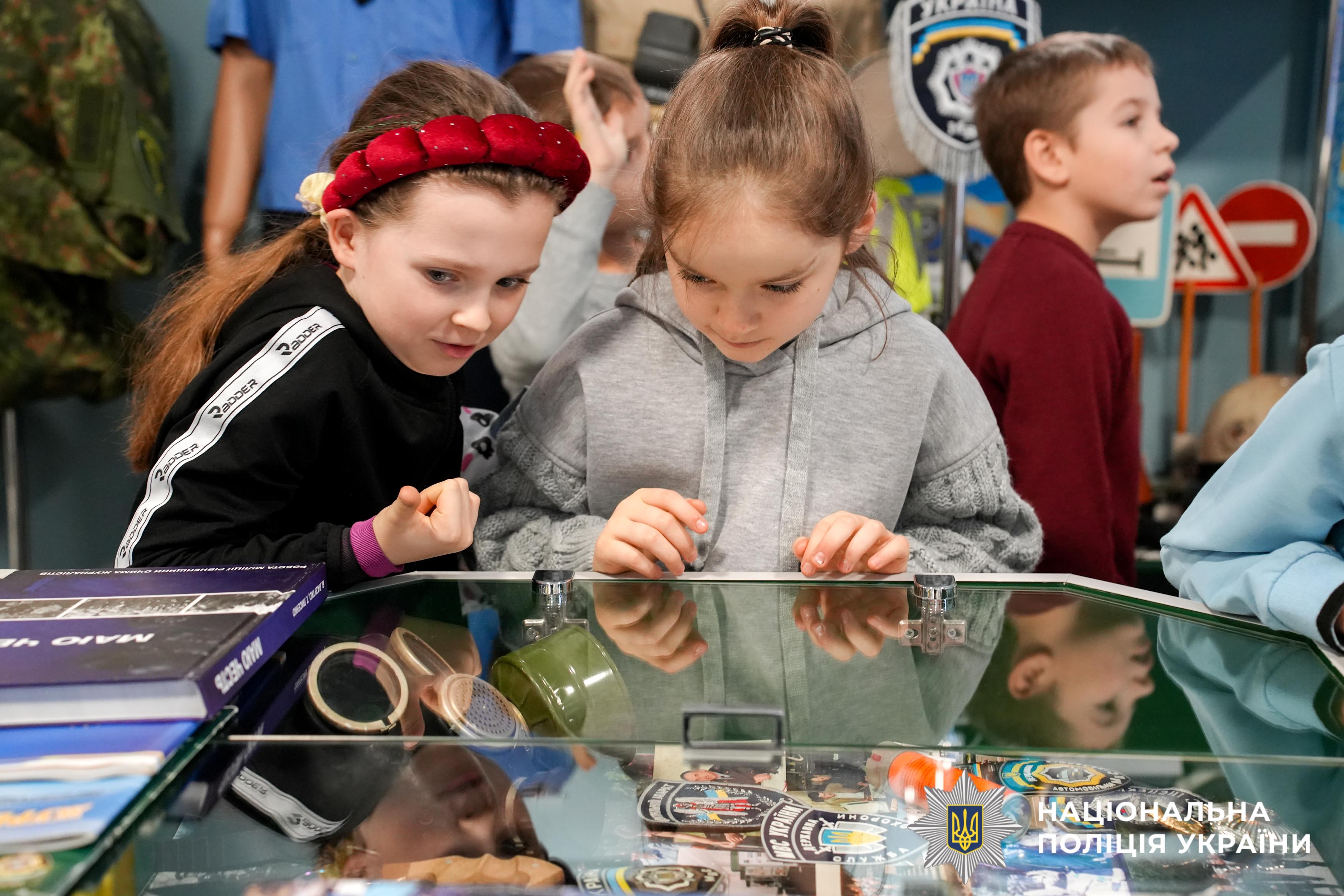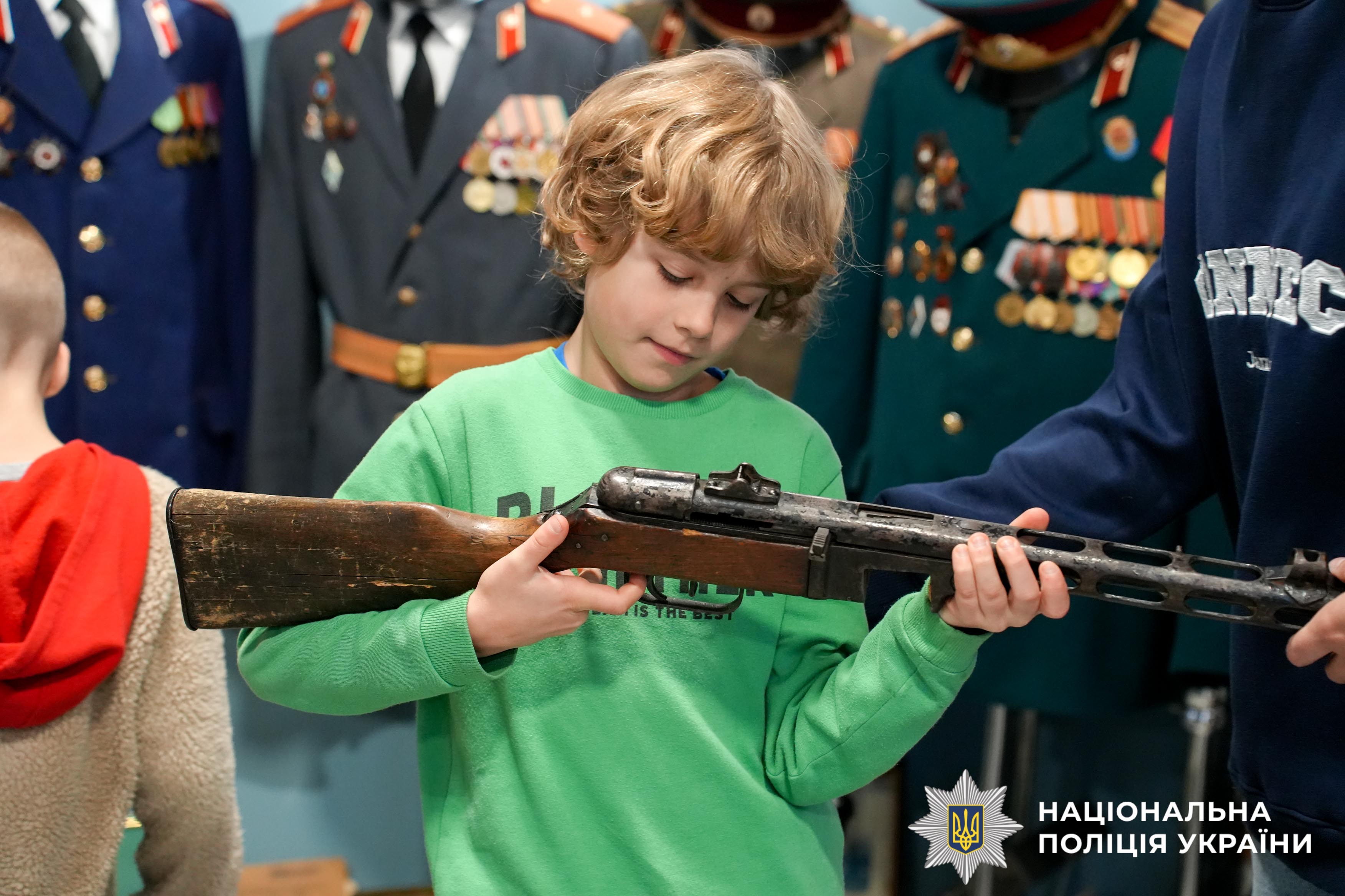 Під час екскурсії до відомчого музею поліції Рівненщини діти ознайомилися зі специфікою роботи правоохоронних органів у різні часи. Найбільший інтерес викликали раритетні експонати — техніка, яку використовували працівники органів внутрішніх справ минулих поколінь. Крім того, малеча із цікавістю розглядала сучасне озброєння, що використовується як окупантами, так і українськими бійцями під час війни.