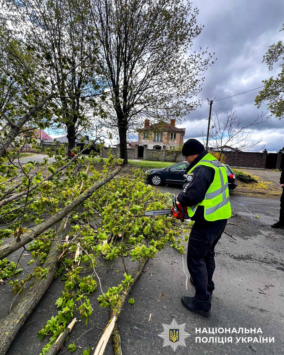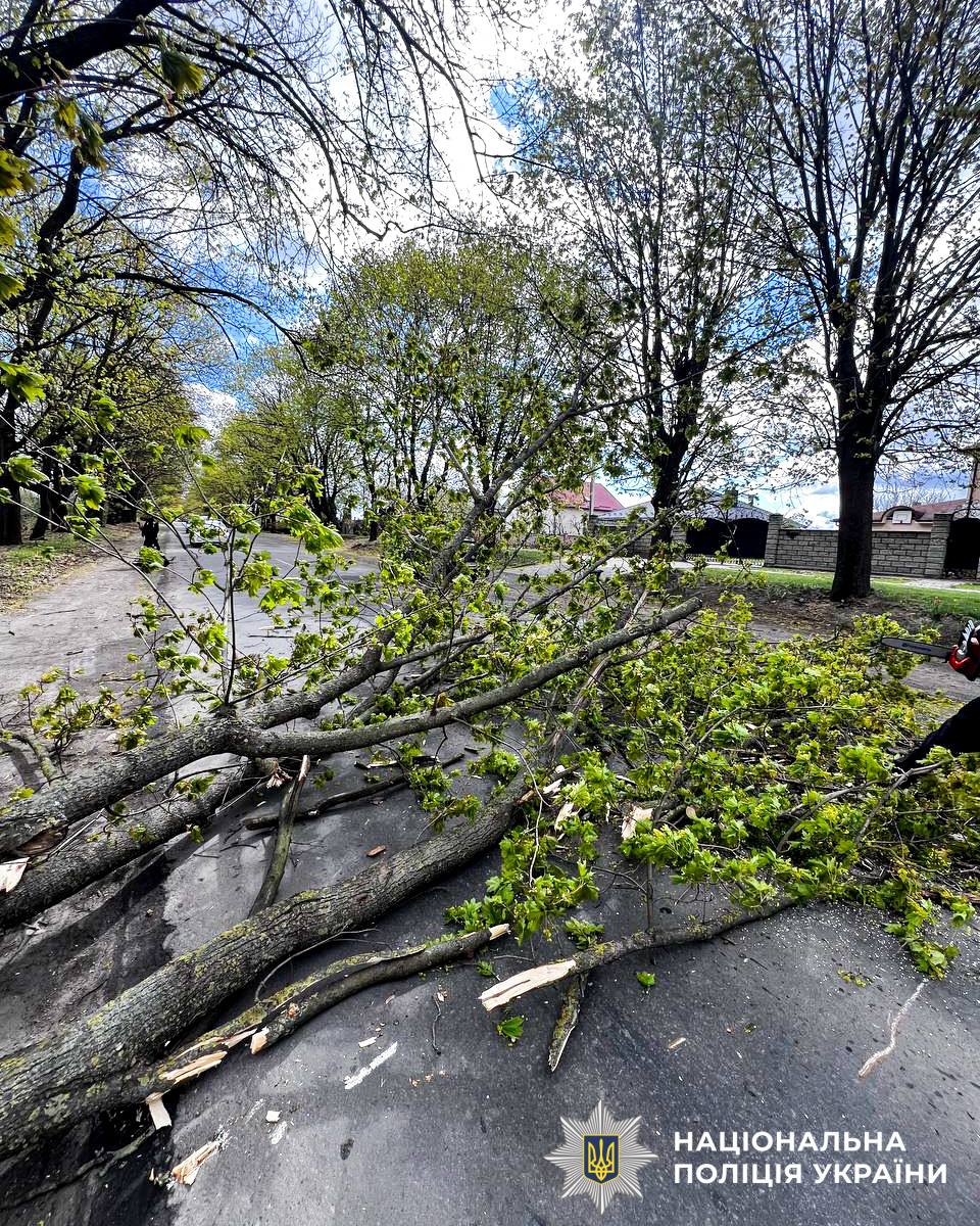 В області вирує потужний буревій: сильні пориви вітру та дощі призвели до падіння дерев, що заблокували рух на деяких автошляхах та вулицях населених пунктів. Поліцейські офіцери громад оперативно долучаються до ліквідації наслідків стихії.