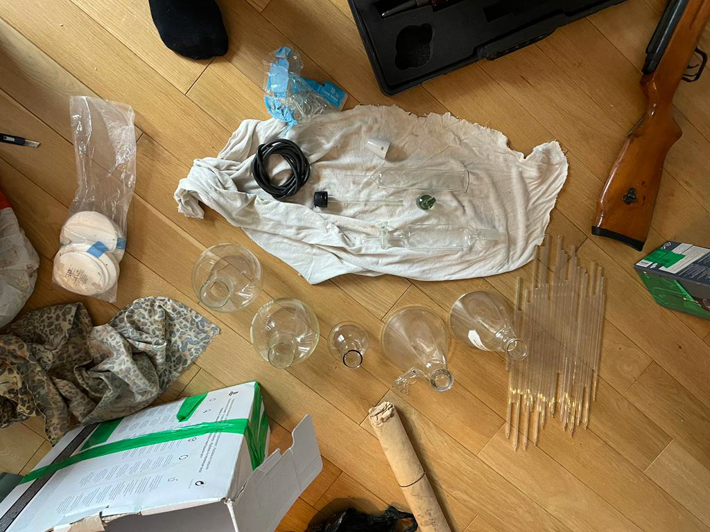 У рамках провадження, відкритого за ознаками кримінального правопорушення, передбаченого ч. 2 ст. 307 КК України за місцем проживання 38-річного жителя Рівного правоохоронці виявили і вилучили обладнання, прекурсори, призначені для виготовлення метамфетаміну, електронні ваги, скляні колби та трубки різної форми та об’єму, предмети із залишками речовин наркотичного походження, змиви та інші докази його протиправної діяльності.