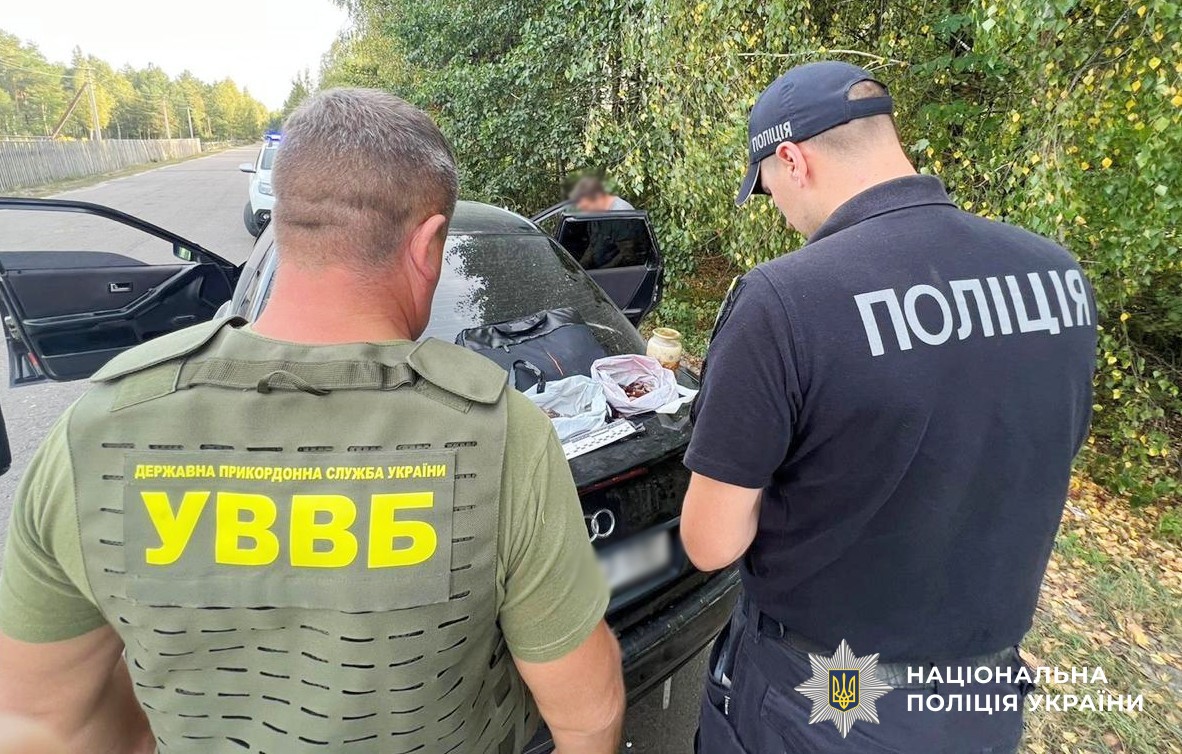 Під час огляду транспортного засобу за задніми сидіннями поліцейські виявили два пакети із бурштином, вагою близько одного кілограма.