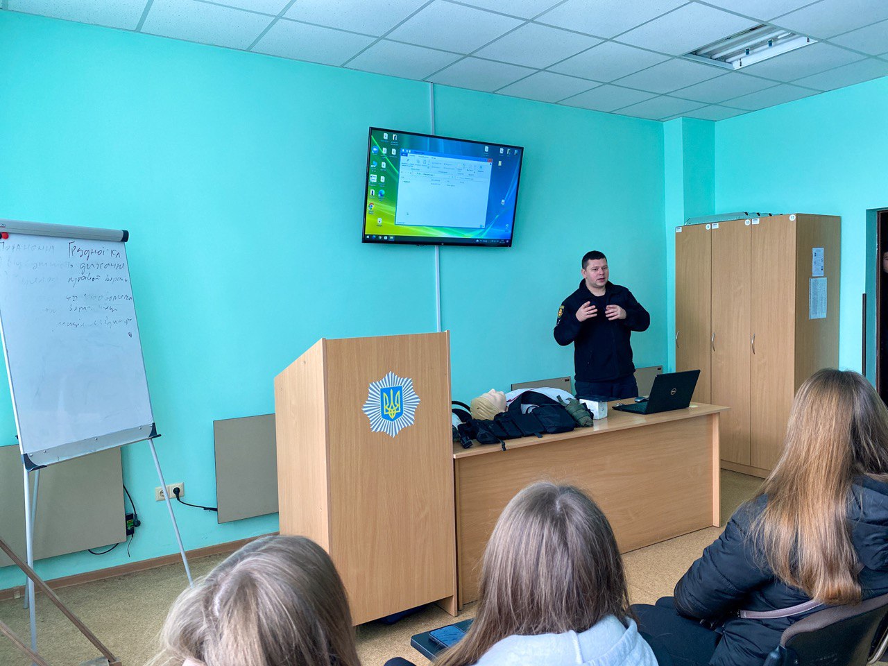 Викладачі Центру розповіли підліткам, як діяти при втраті свідомості, кровотечах, травмах, опіках, обмороженнях, інших невідкладних станах, зокрема розпізнавати ознаки при інфаркту чи інсульту та наголосили на правилах власної безпеки.