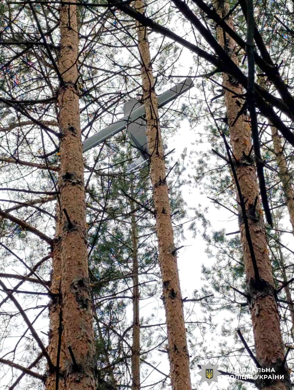 Крім того, поліцейські виявили ще один підозрілий предмет: безпілотник, який застряг в кроні дерев на висоті 15 метрів. Його також знешкоджено.