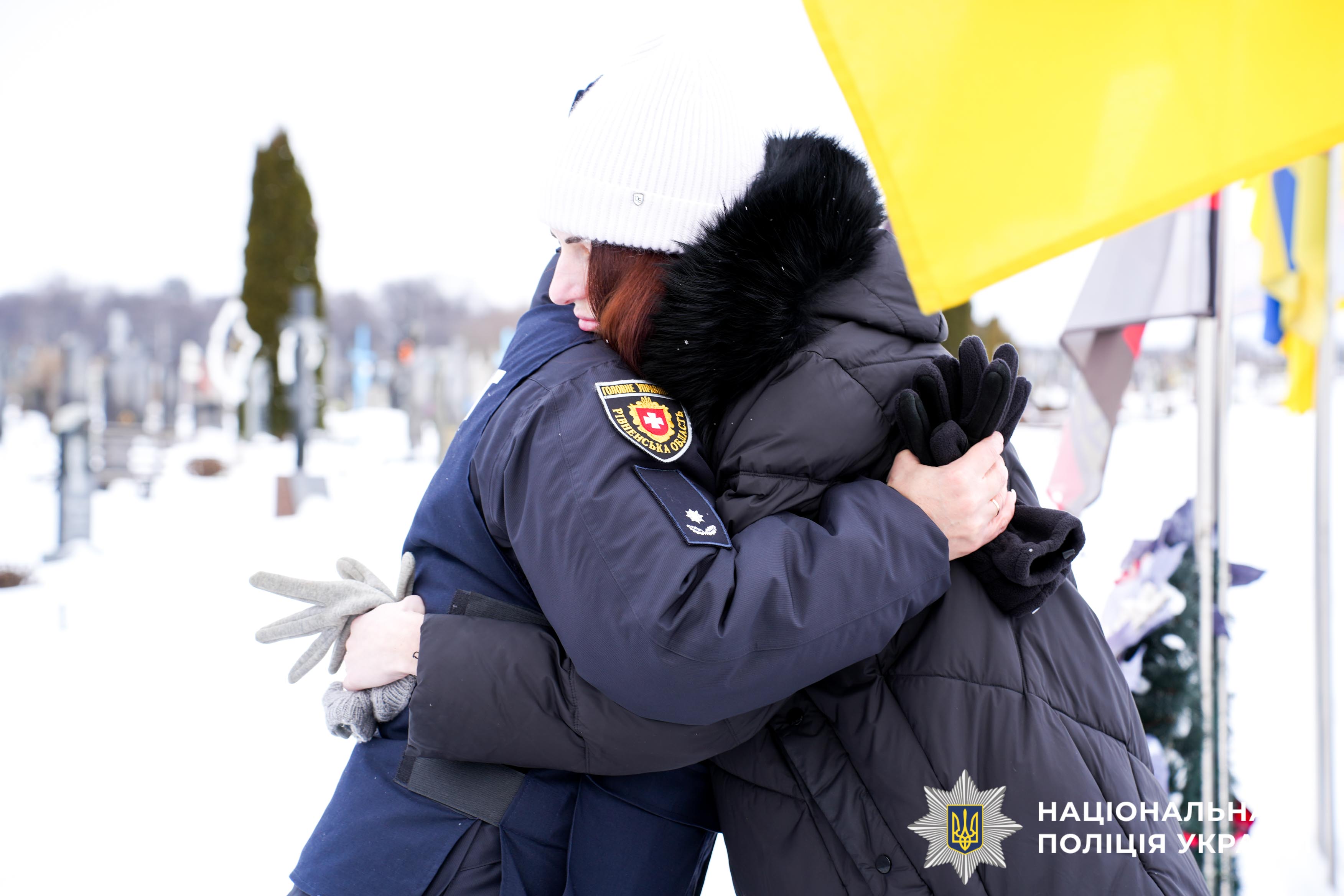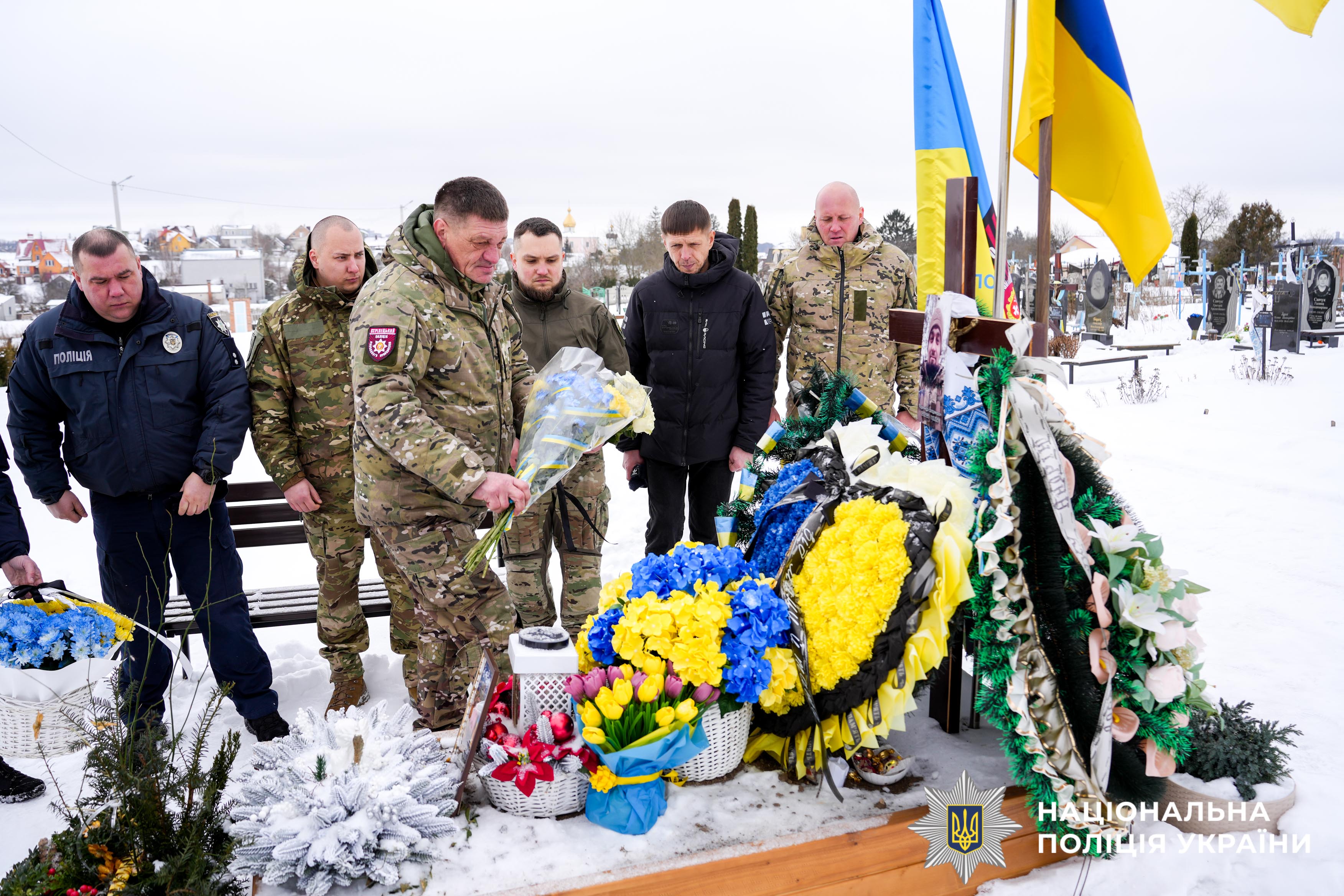Серед засніжених могил добре видніється одна… Уся встелена синьо-жовтими квітами, а над нею майорить два прапори. Саме тут знайшов вічний спочинок один з Героїв — боєць стрілецького батальйону Рівненщини, який загинув на передовій, вирушаючи на допомогу пораненим…
