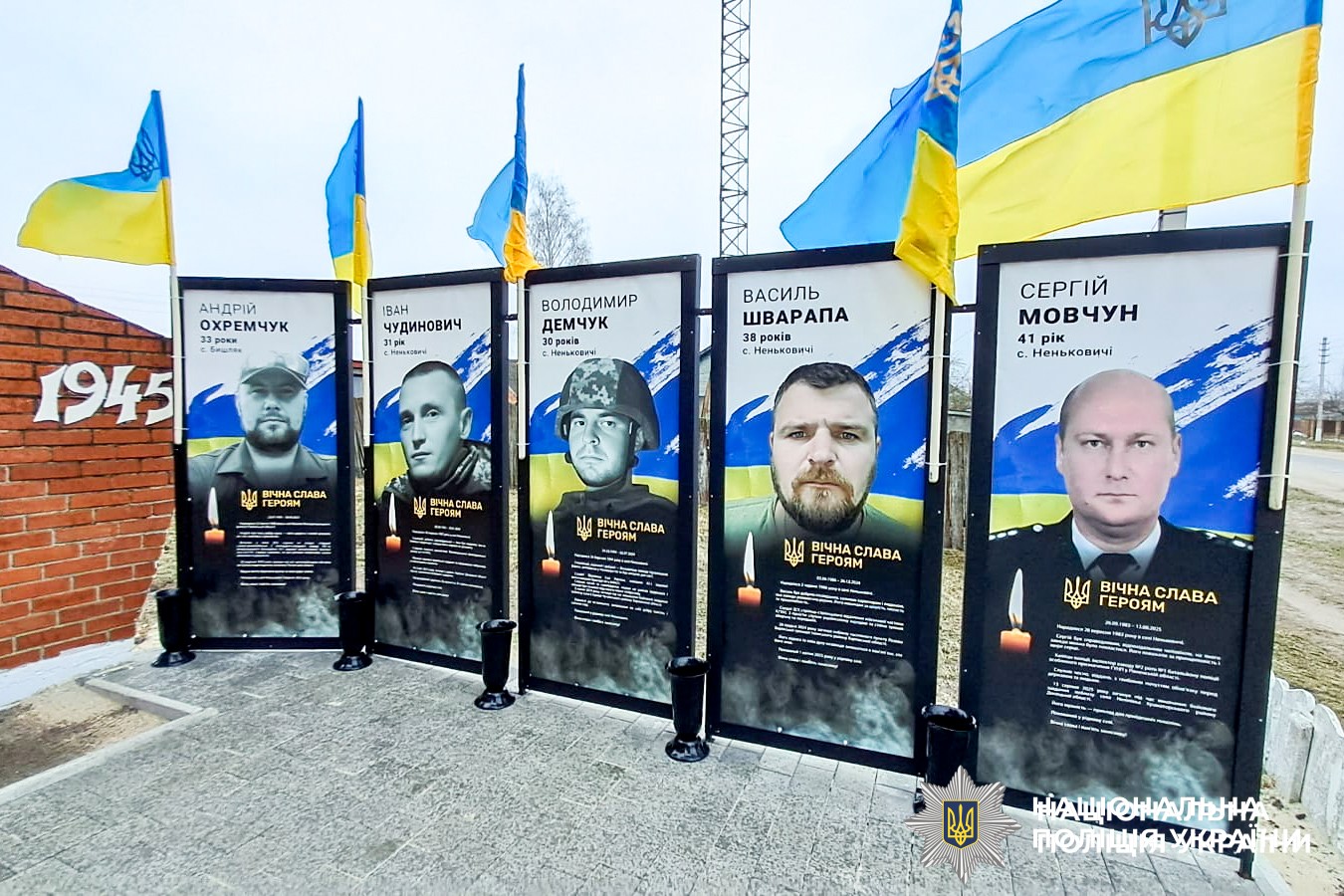 Учора на фасаді рідного ліцею села Неньковичі навіки закарбували пам’ять капітана поліції Сергія Мовчуна. А поруч розмістили банер із зображенням захисника на синьо-жовтому прапорі. Щоб цей стяг майорів над вільною і незалежною Україною, поліцейський і віддав своє життя.