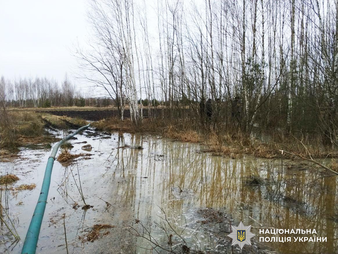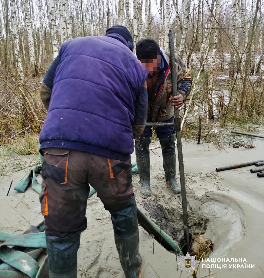 Під час відпрацювання території колишнього Зарічненського району вчора, 16 лютого, близько 11 години у лісовому масиві поблизу села Кухітська Воля поліцейські спільно із прикордонниками виявили двох чоловіків, які за допомогою мотопомпи кустарного виробництва видобували бурштин.