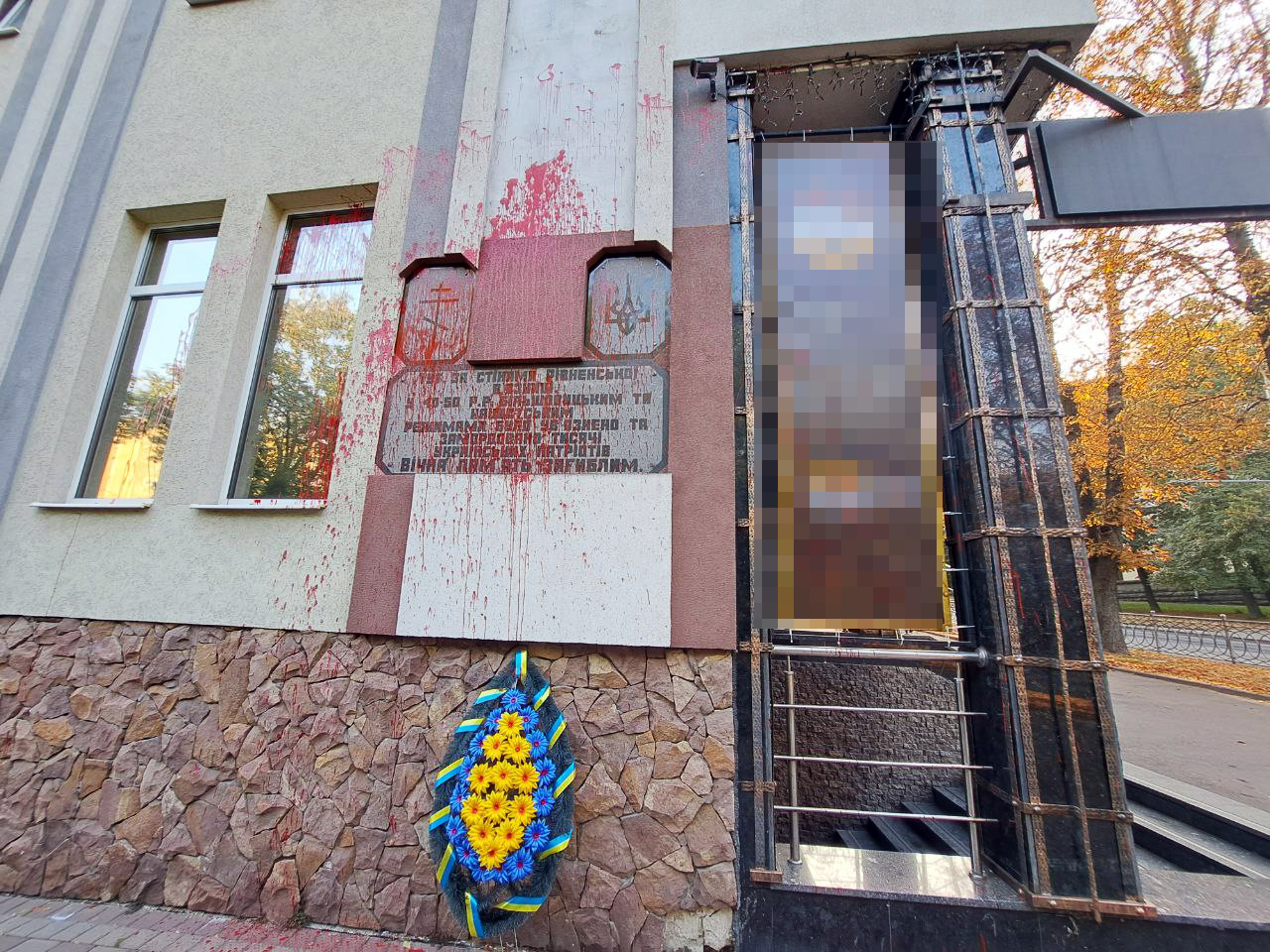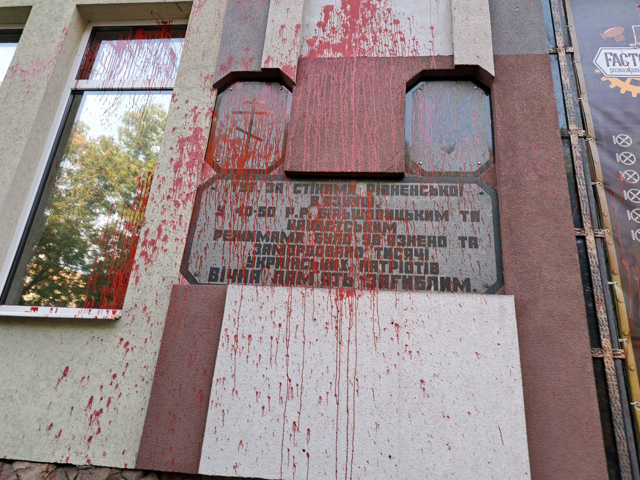 Жінка повідомила, що невідомий чоловік облив червоною фарбою меморіальну дошку, яка знаходиться на фасаді будинку по вулиці Соборній і присвячена тисячам українських патріотів, які у 40-50 рр. були ув’язнені та замордовані більшовицьким та нацистським режимами.