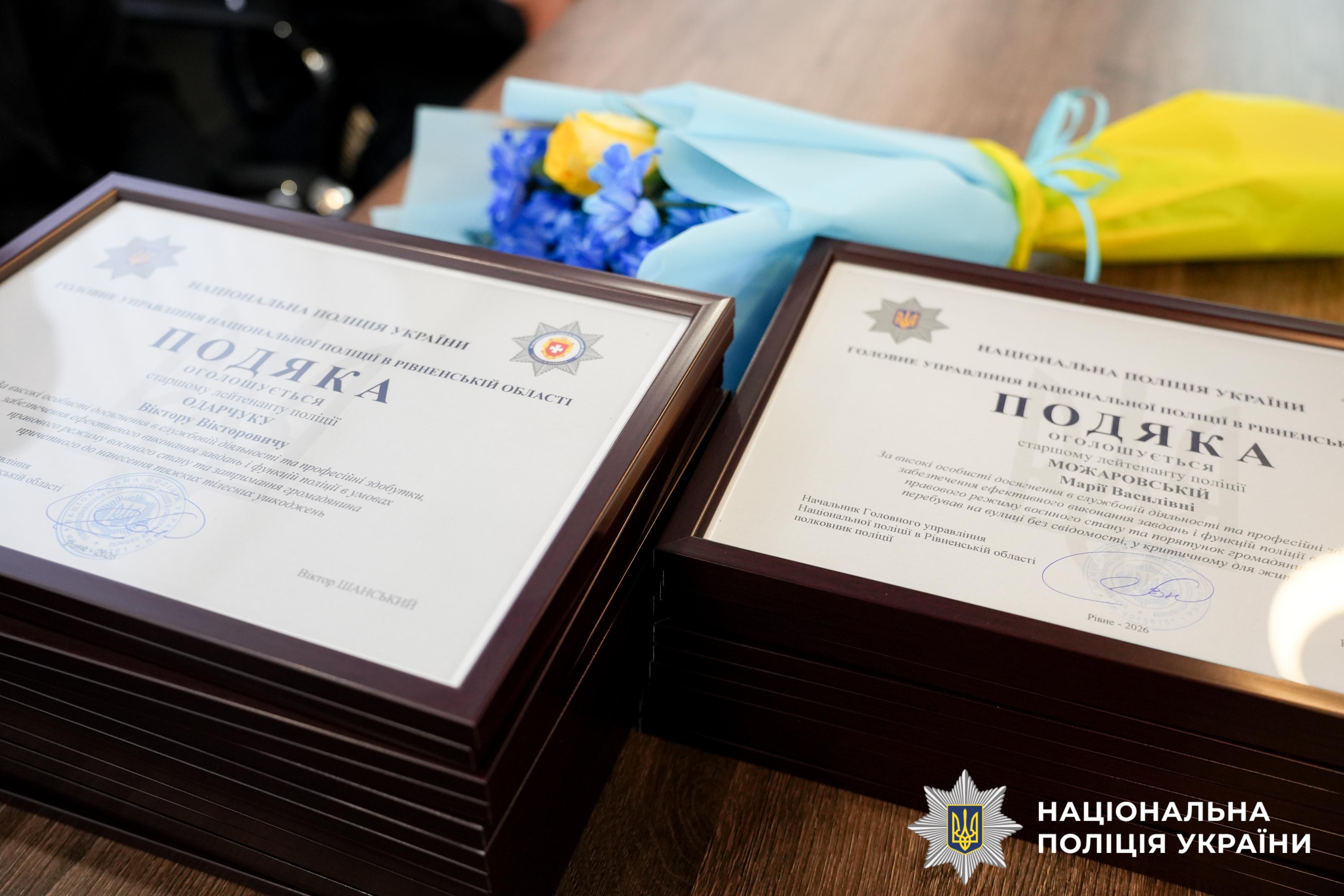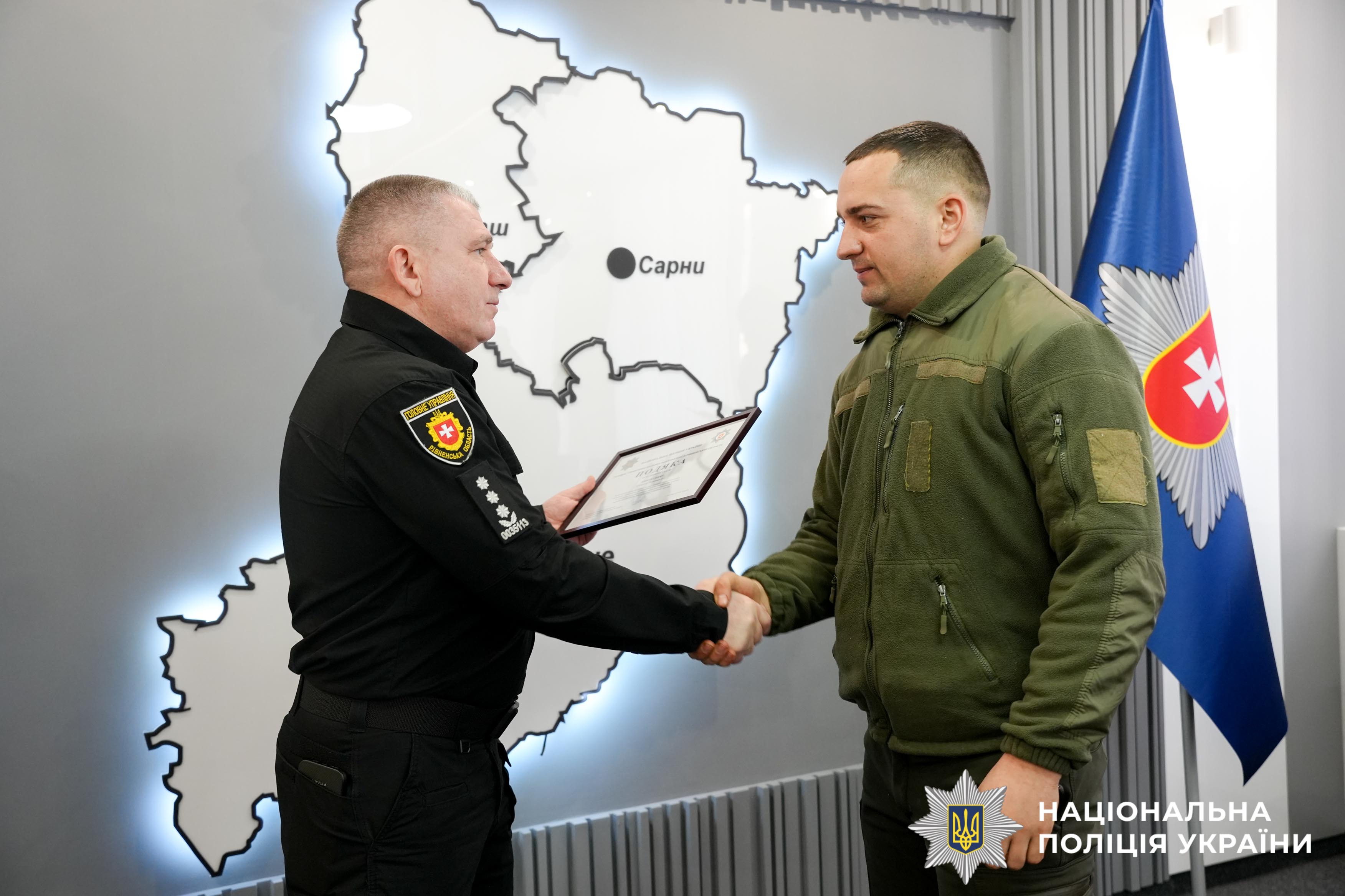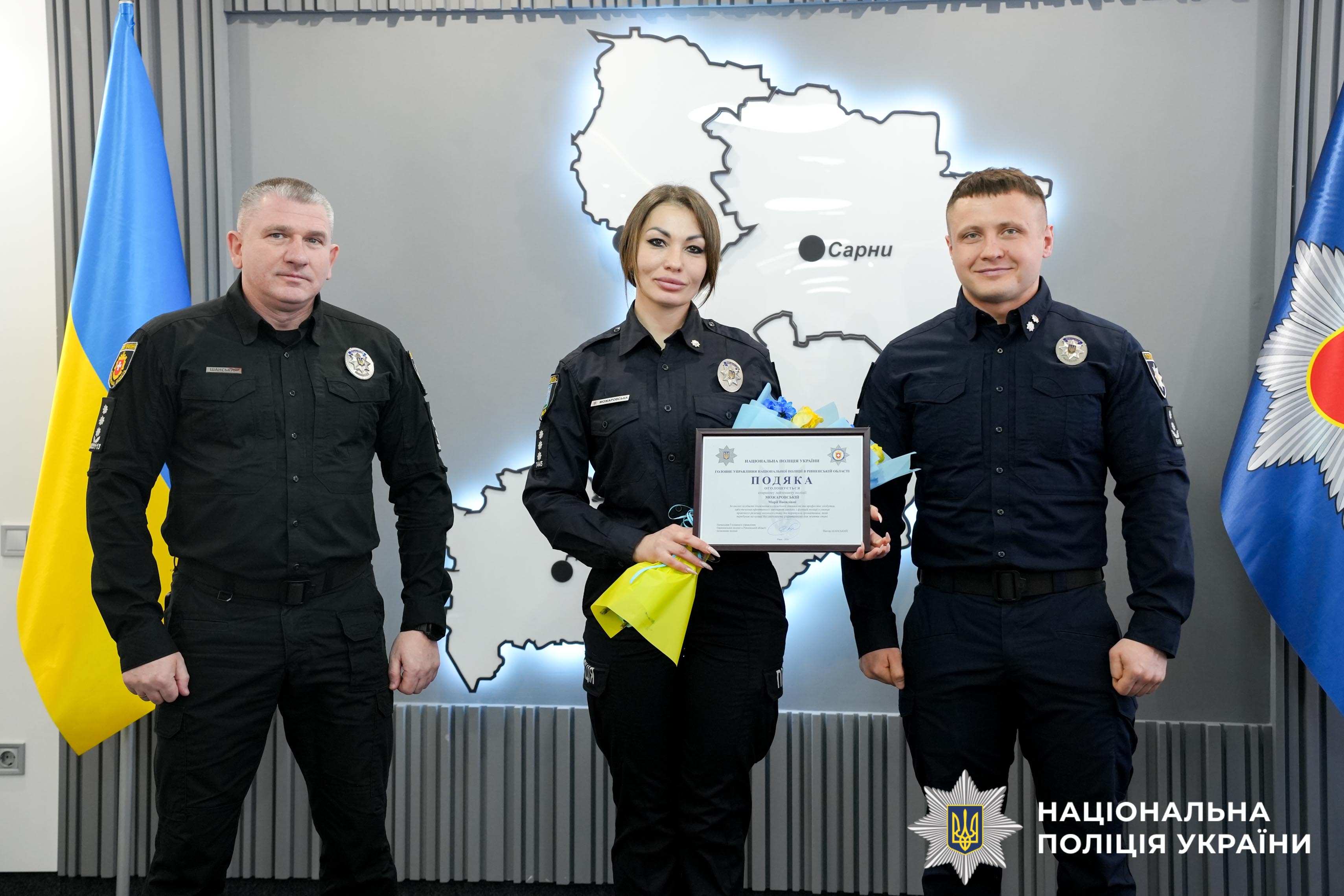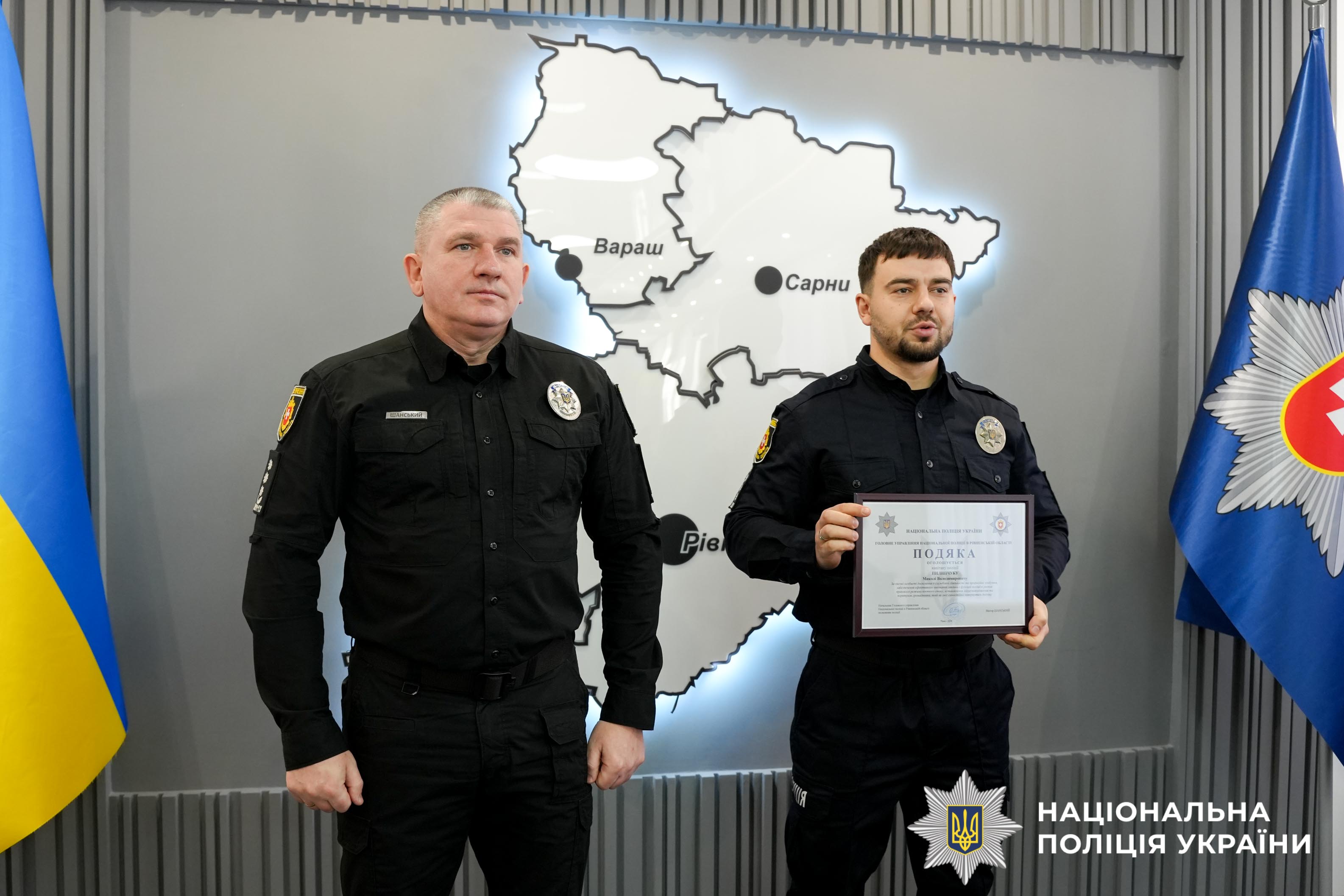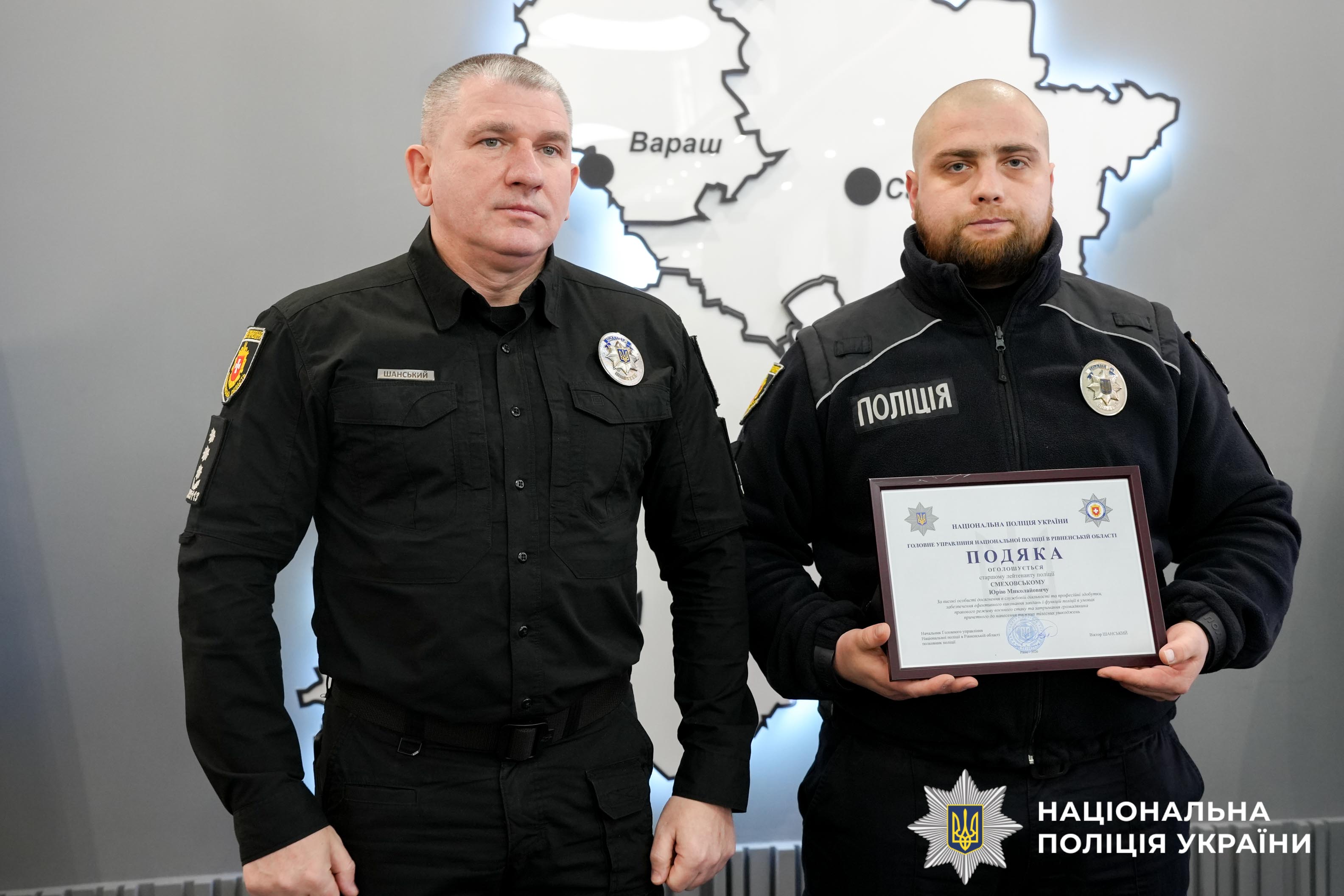 - працівники сектору реагування патрульної поліції ВП №1 (с-ще Володимирець), які врятували двох чоловіків з палаючого будинку; (https://t.me/NPU_Rivne/36377)