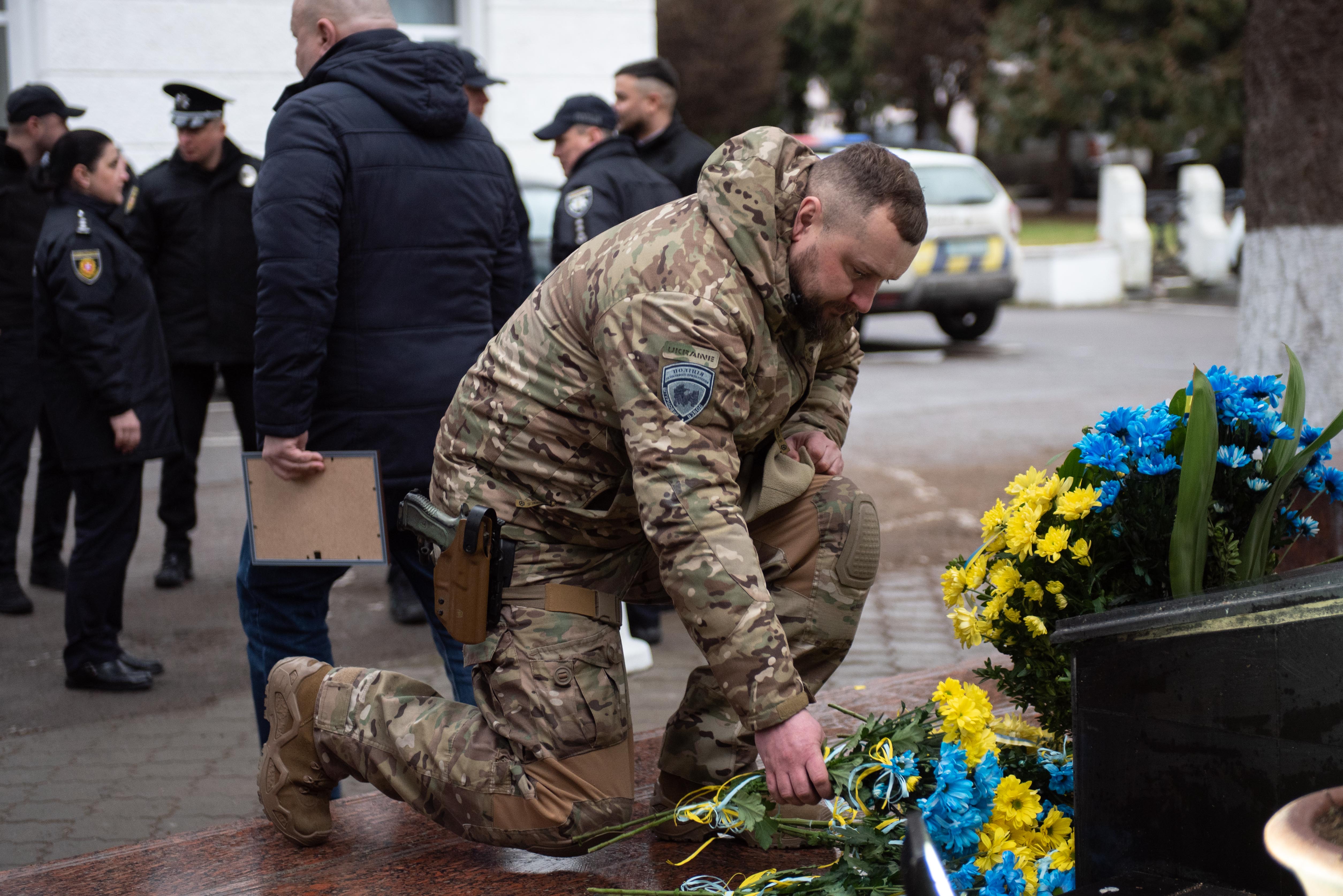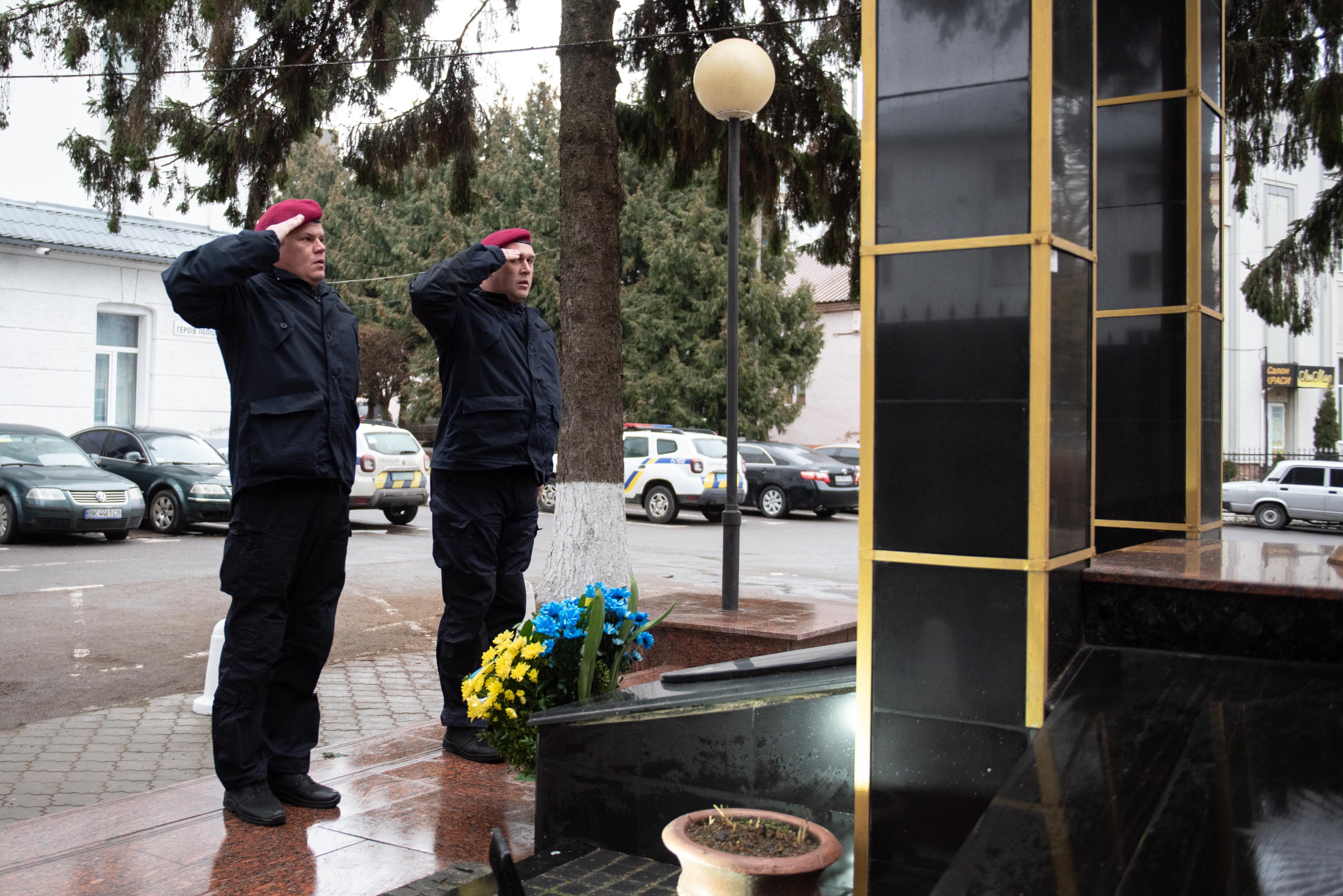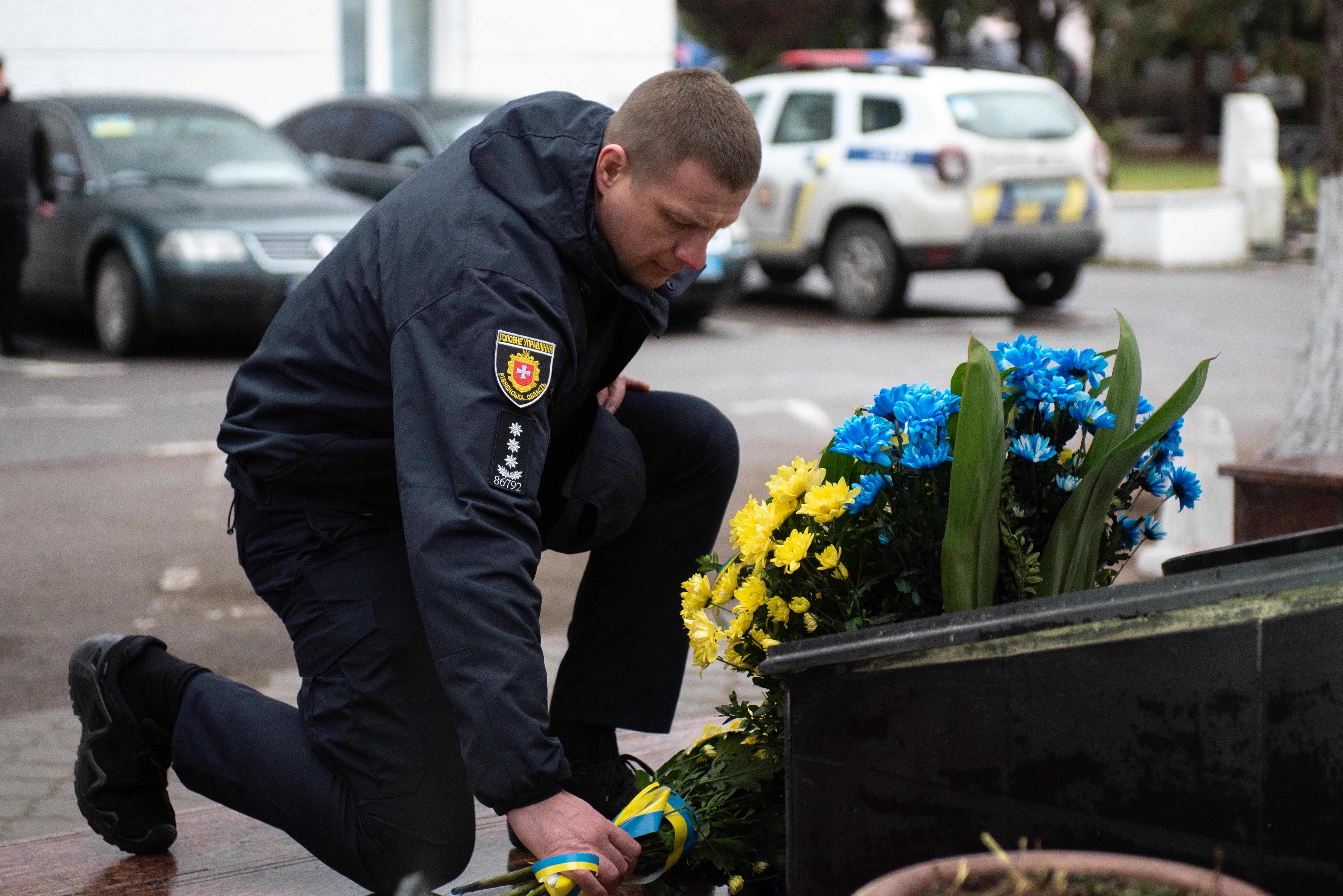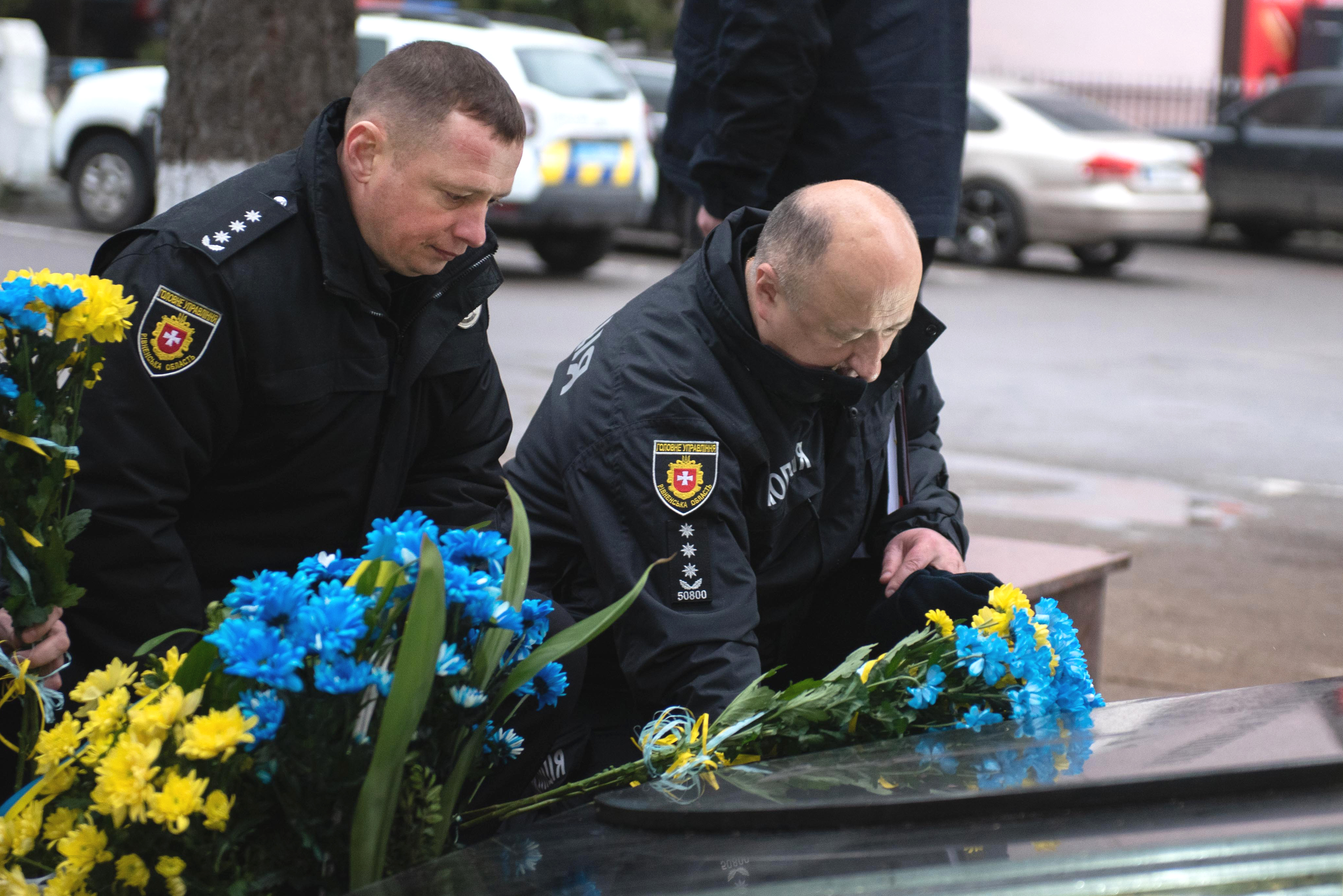 Разом із керівництвом поліції області, поліцейські та ветерани ОВС поклали квіти до пам’ятника загиблим правоохоронцям і вшанували полеглих бойових побратимів хвилиною мовчання.