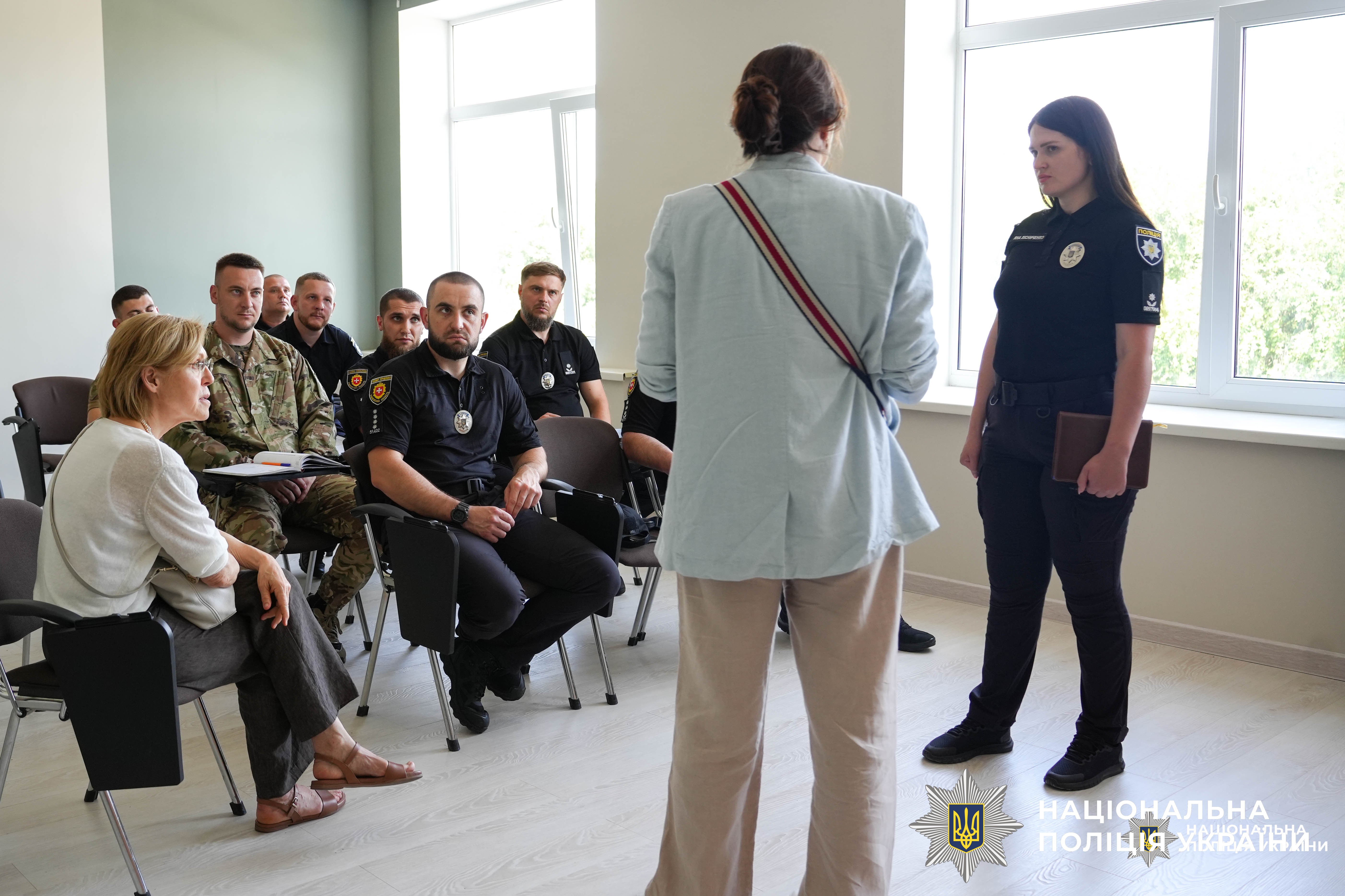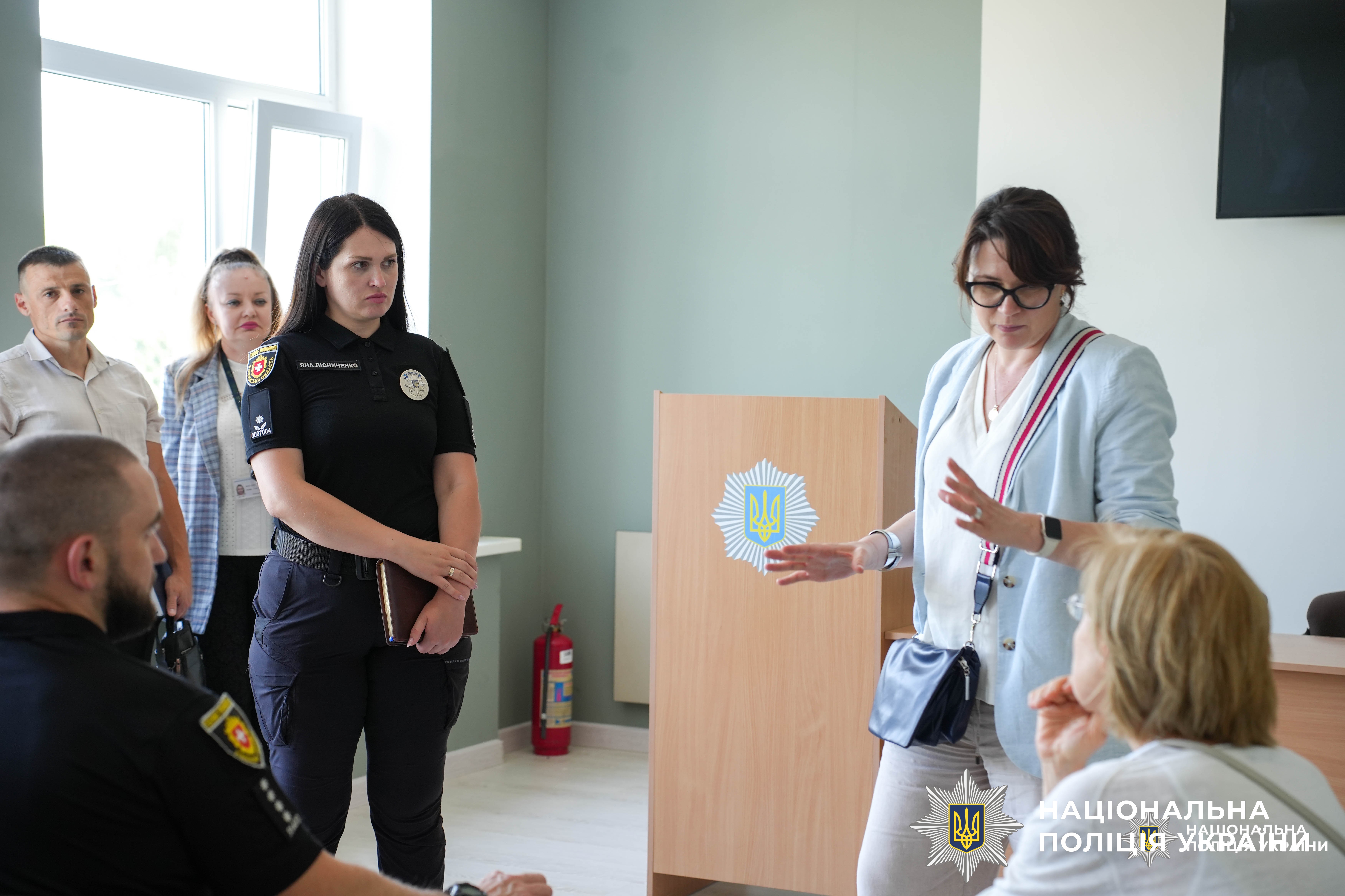 Представникам КМЄС керівниця кадрового забезпечення Яна Лісниченко продемонструвала приміщення, де працівники поліції підвищують фаховий рівень, аби гідно виконувати службові обов’язки як в тилу, так і на передовій.