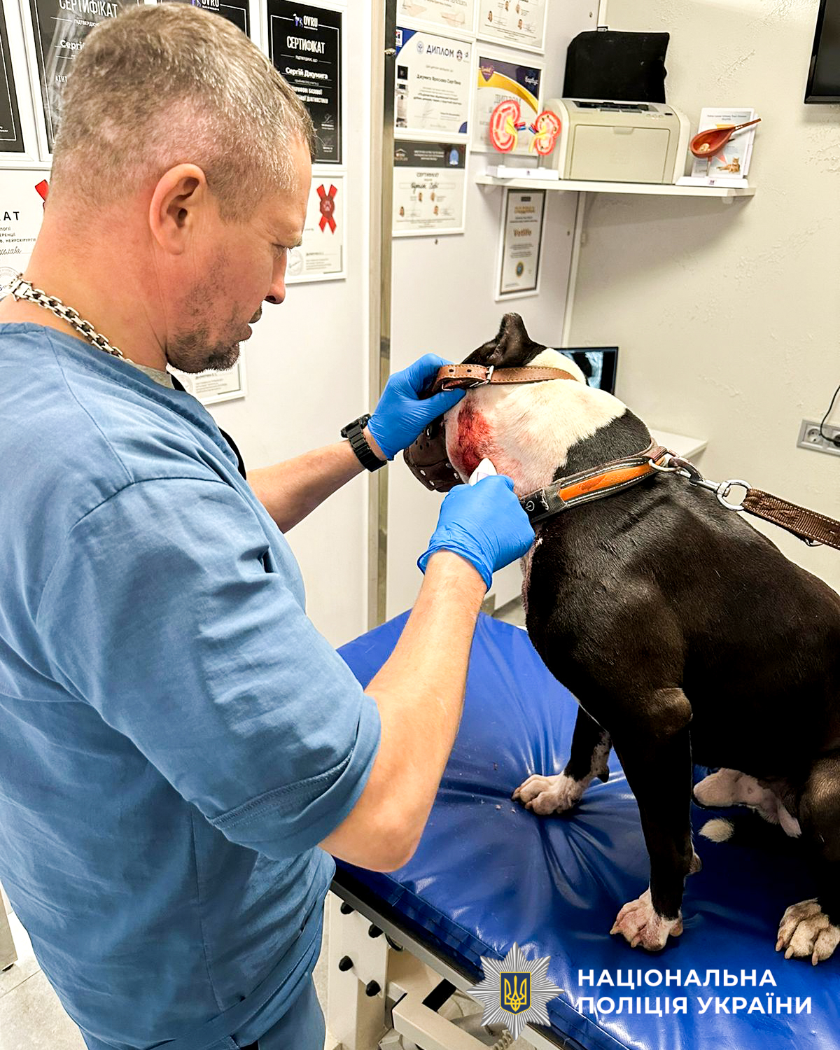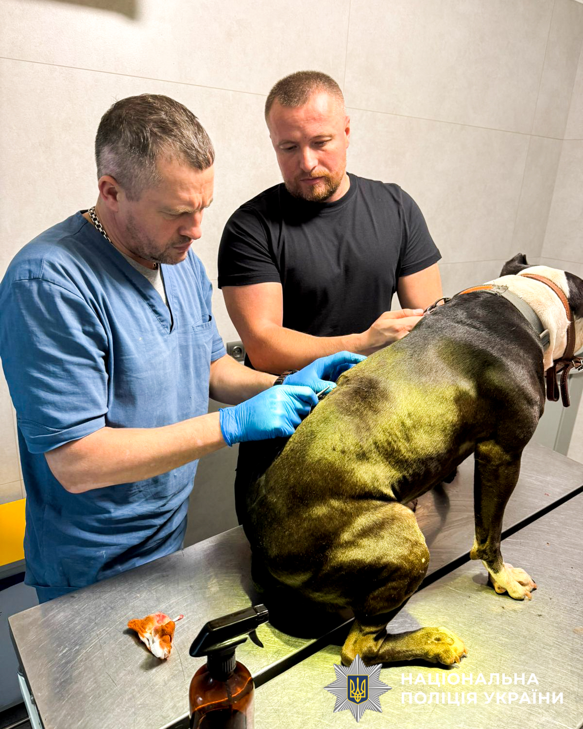 Закривавленого та змореного стафф тер’єра виявило керівництво ВП №1 (м. Рівне), яке також прибуло на місце події. Чотирилапого негайно відвезли до ветклініки, де діагностували три колото-ріжучі рани, глибиною 1-3 см в області грудопоперекового відділу.