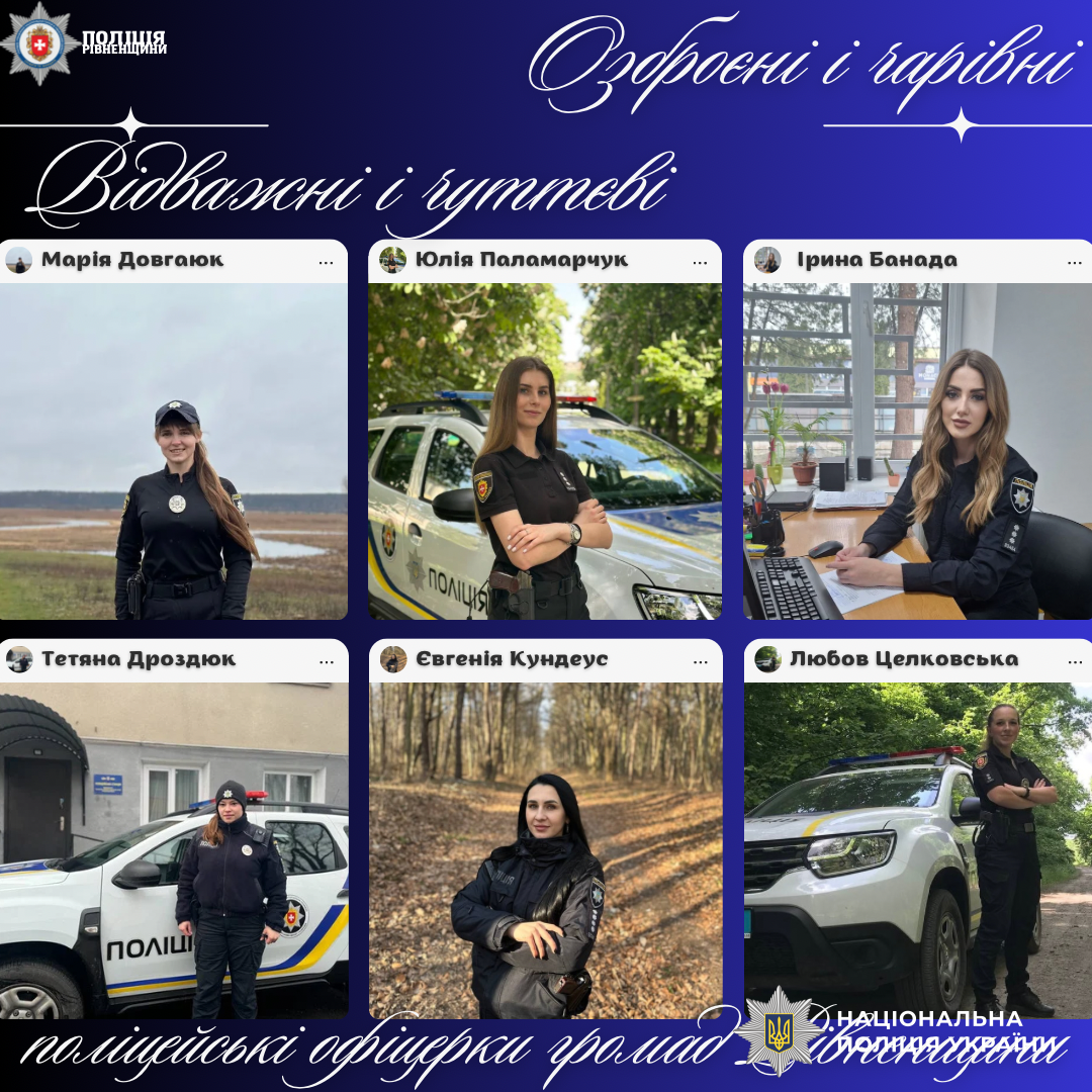 На Рівненщині нині працюють 102 поліцейських офіцери громад і серед них — шестеро офіцерок. Кожна з них любить свою роботу, в якій доводиться допомагати і рятувати, втихомирювати і піклуватися про своїх мешканців. Утім, для них жодні випробовування не страшні, коли вдома чекають рідні. А ще, як і всі українці, вони мріють про довгоочікувану Перемогу.
