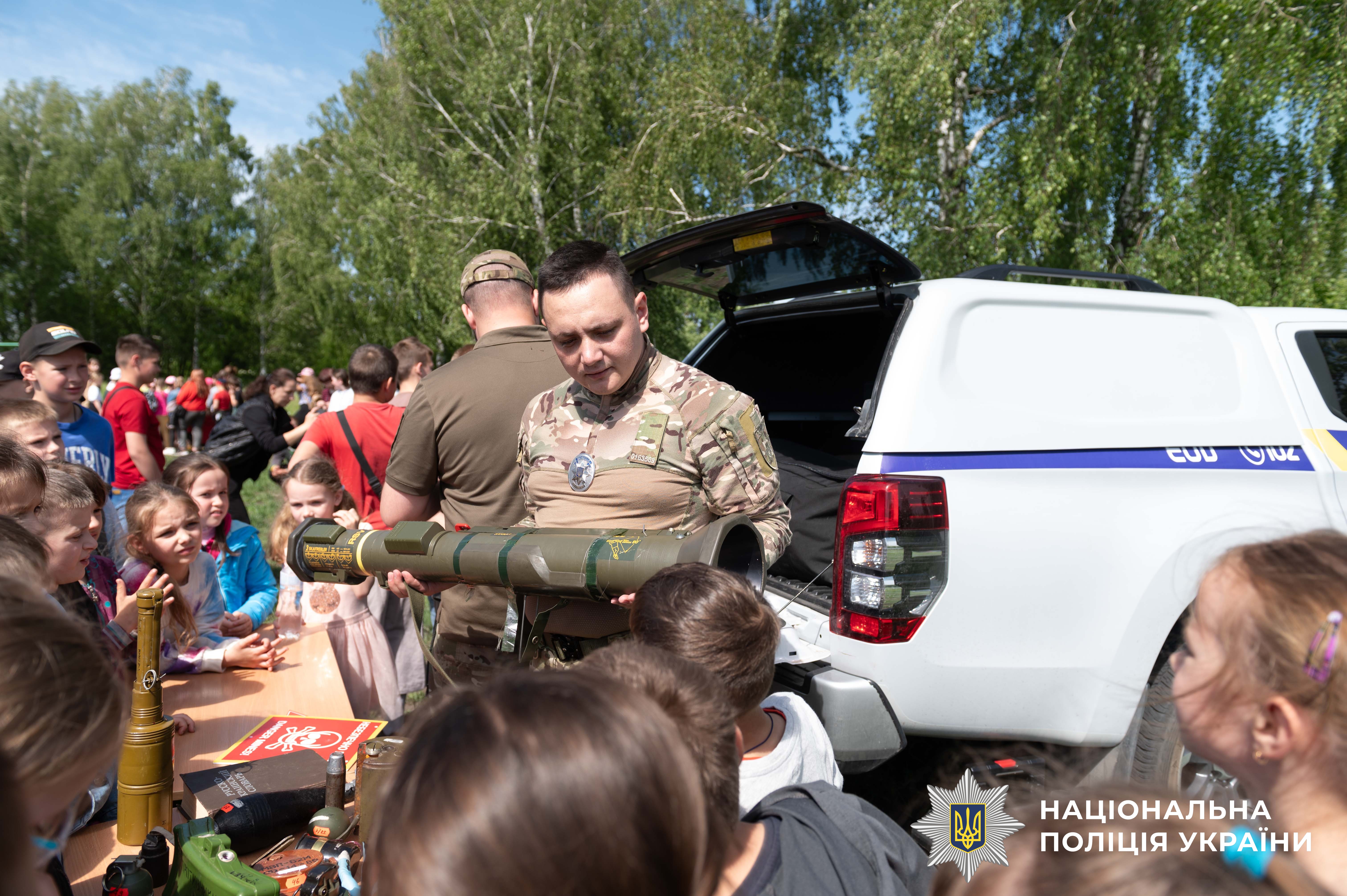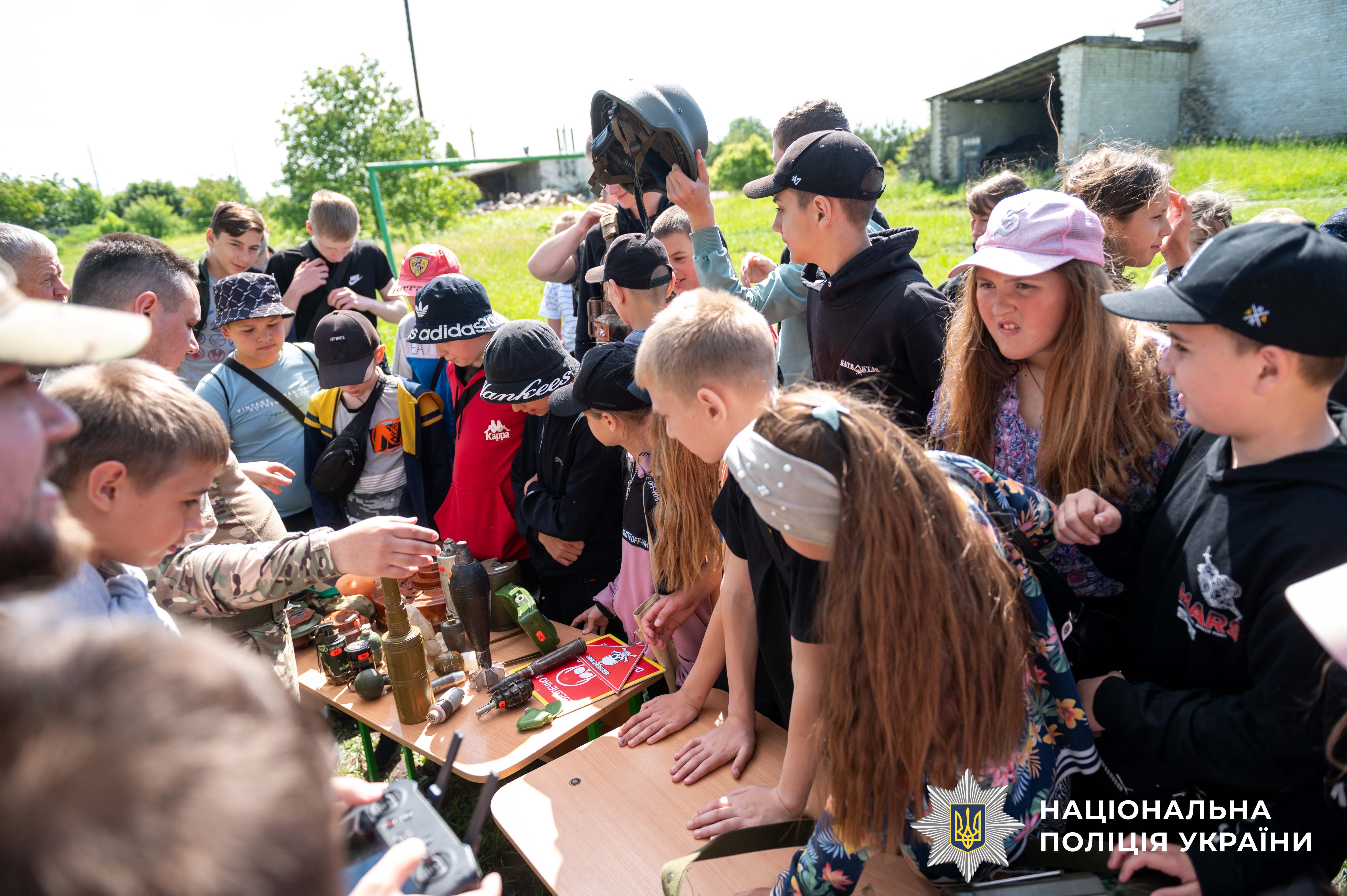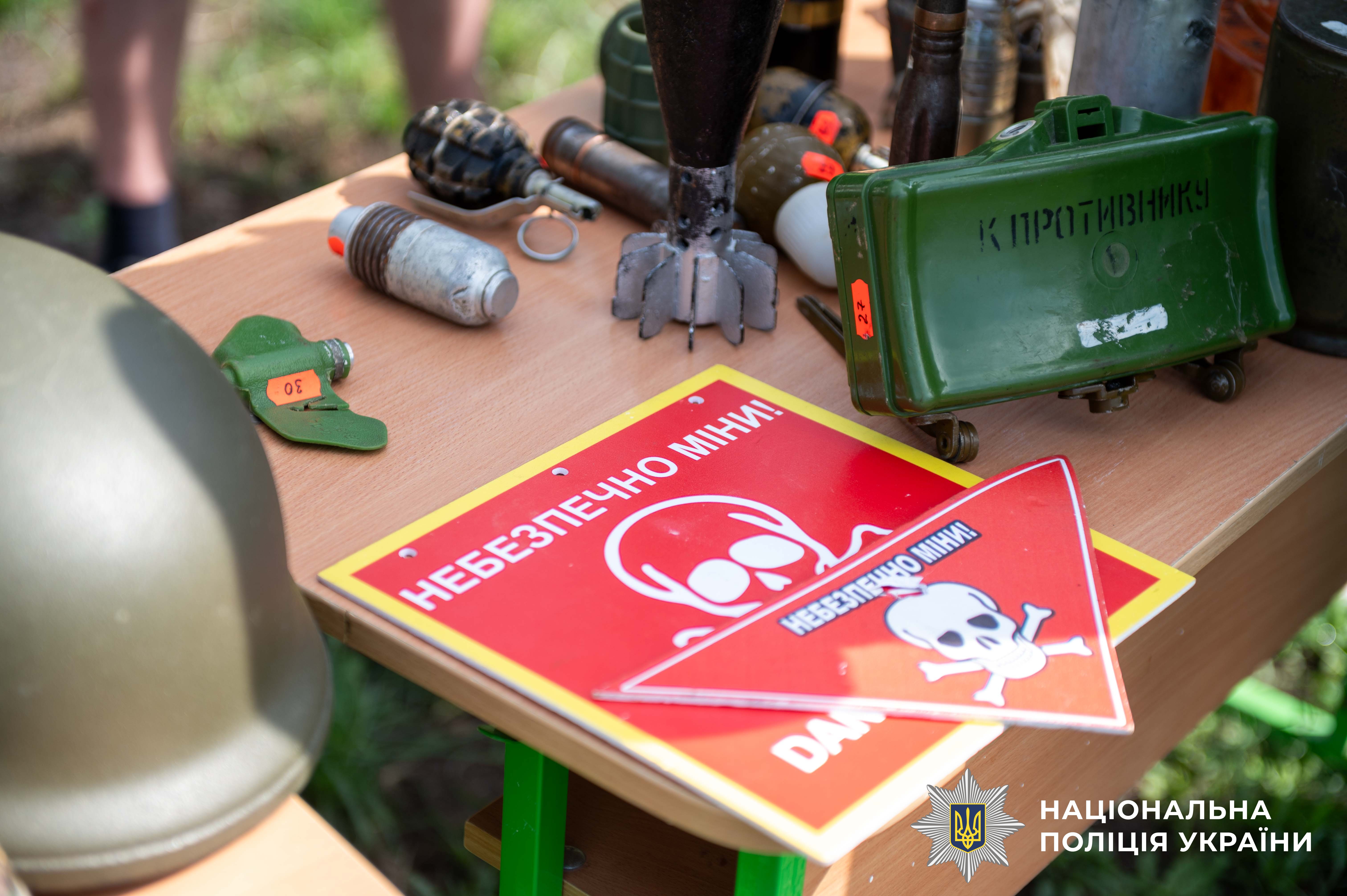 Поліцейські-вибухотехніки показали дітям макети снарядів, мін, гранат, набоїв і розповіли про те, яку небезпеку вони становлять для оточуючих. Також нагадали порядок дій у разі виявлення підозрілого предмету.