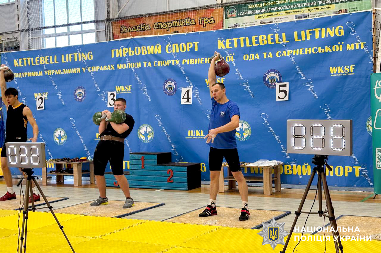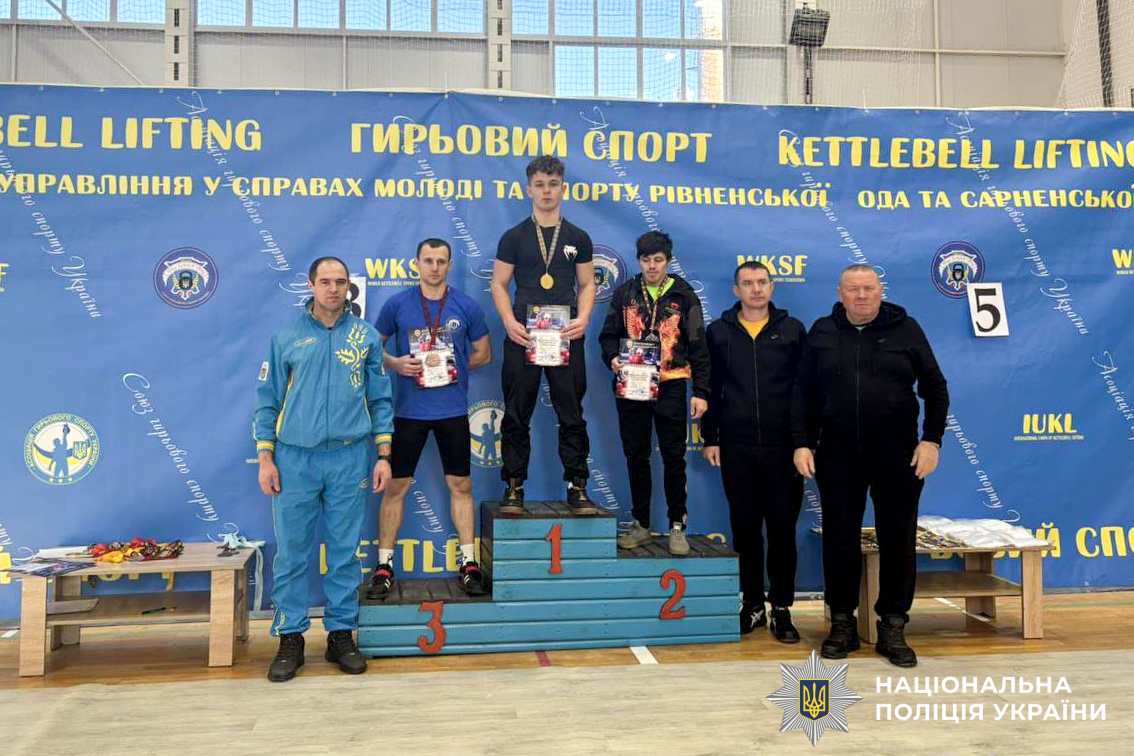 Інспекторка служби освітньої безпеки Вараського РВП Дарія Павицька здобула перемогу у ваговій категорії 60 кг. У загальній сумі триборства поліцейська підняла 252,5 кг. Також золото здобув старший інспектор ювенальної превенції Вараського РВП Василь Чабан: у ваговій категорії 125 кг у тій ж вправі він підняв 507,5 кг.