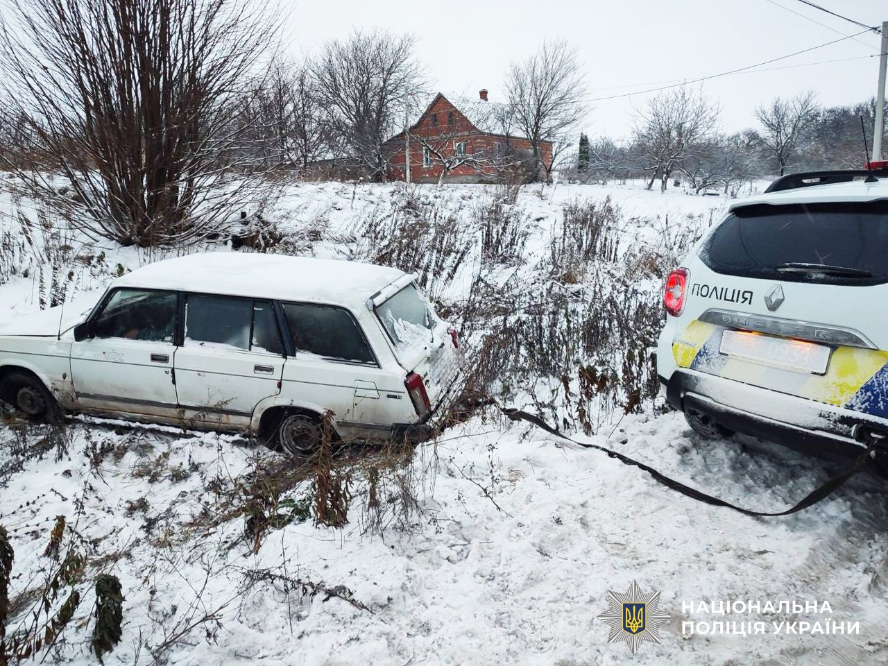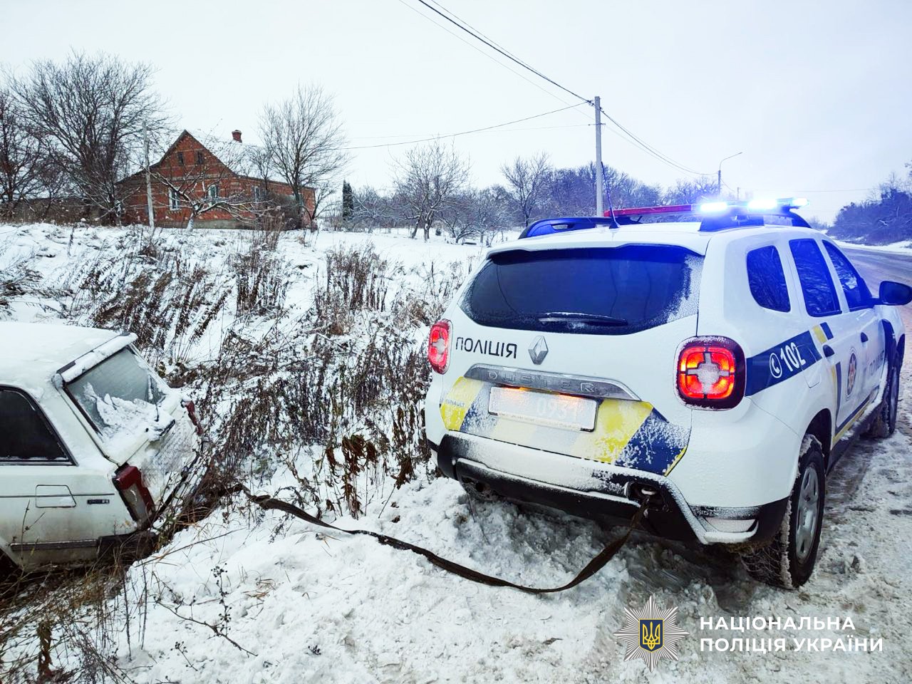 Поліцейський службовим автомобілем за допомогою троса витягнув легковик. На щастя, кермувальник не травмувався, а авто — не пошкодилось.