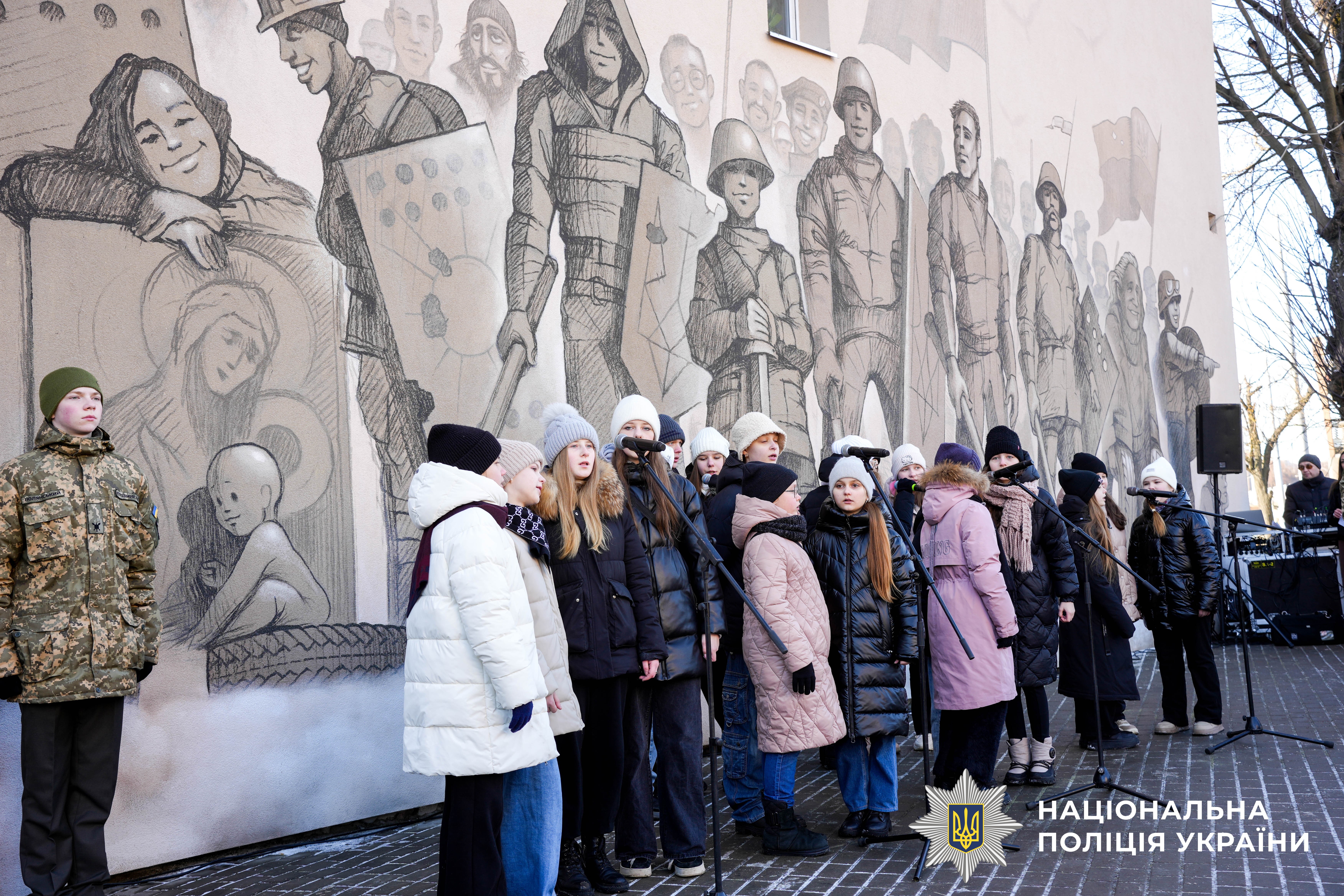 Присутні біля муралу Героїв Небесної сотні у спільній молитві пом'янули загиблих учасників Революції Гідності та в пам'ять про їхню самовідданість і мужність символічно поклали квіти.
