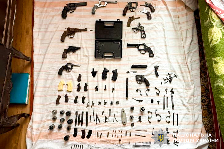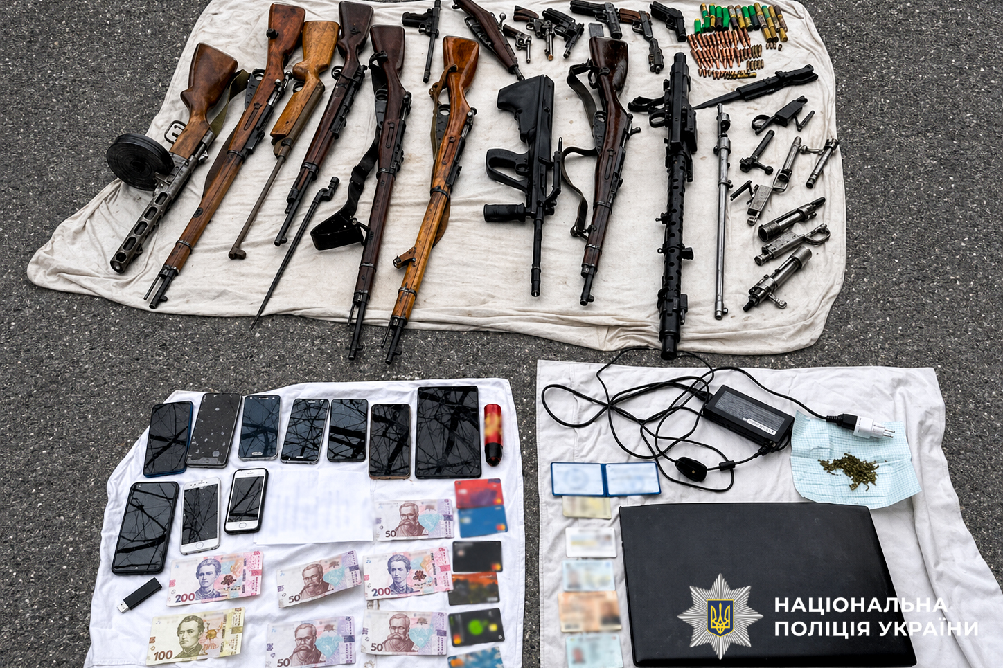 Поліцейські провели 8 санкціонованих обшуків за місцями проживання зловмисників, під час яких виявили та вилучили арсенал зброї: 4 пістолети, 6 револьверів, 5 гвинтівок, автомат, карабін і 82 набої різного калібру. Крім того, вилучено грошові кошти (700 гривень та 2100 доларів), банківські картки, мобільні телефони та канабіс.