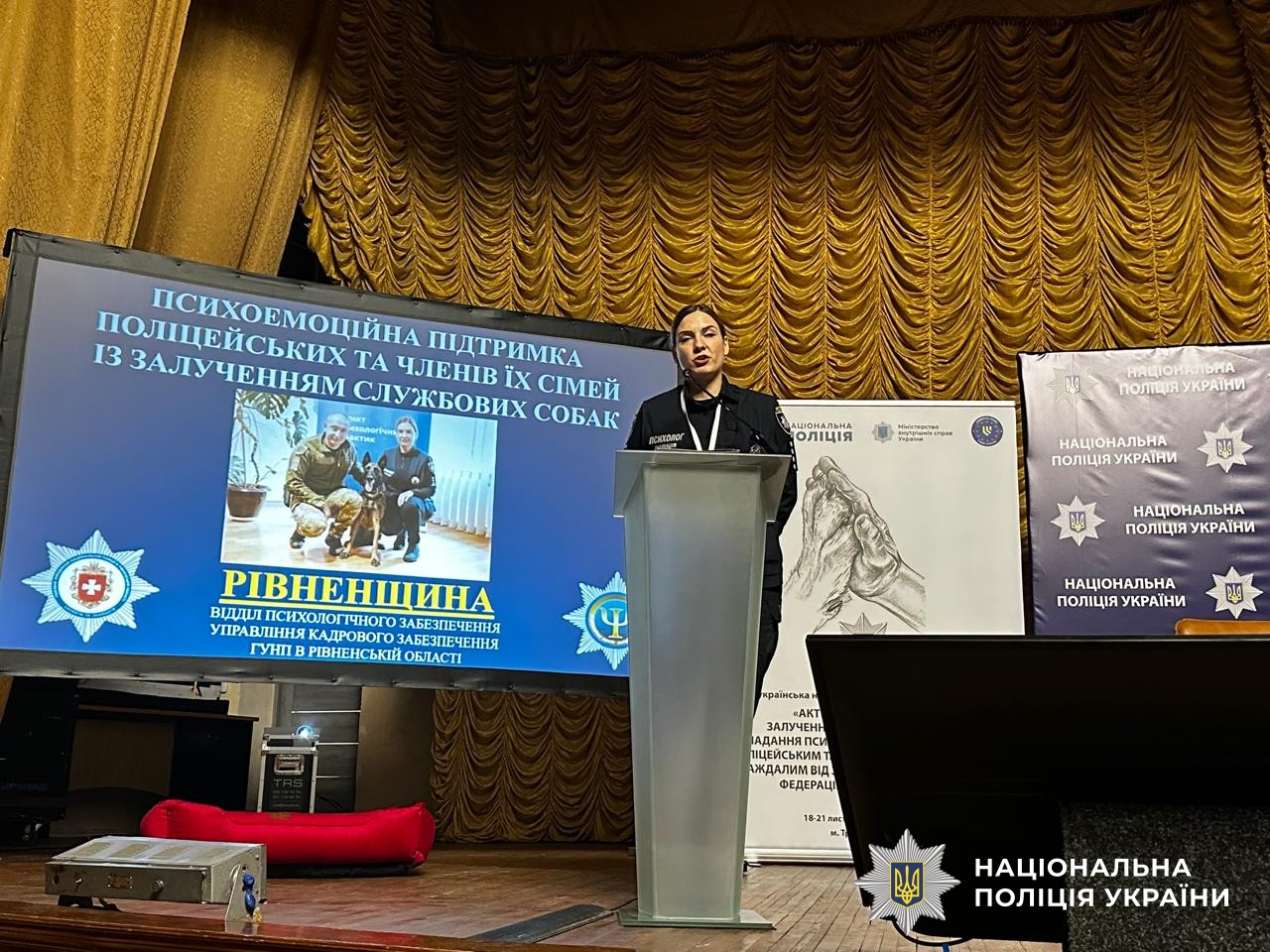 Рівненська делегація у складі начальника відділу психологічного забезпечення УКЗ Світлани Демидової, психологині Тетяни Ващишиної та кінолога Віталія Полтавченкадолучилася до тематичних семінарів і майстер-класів.Також поліцейські презентували власний регіональний досвід реалізації програми підтримки поліцейських за участю службових собак.