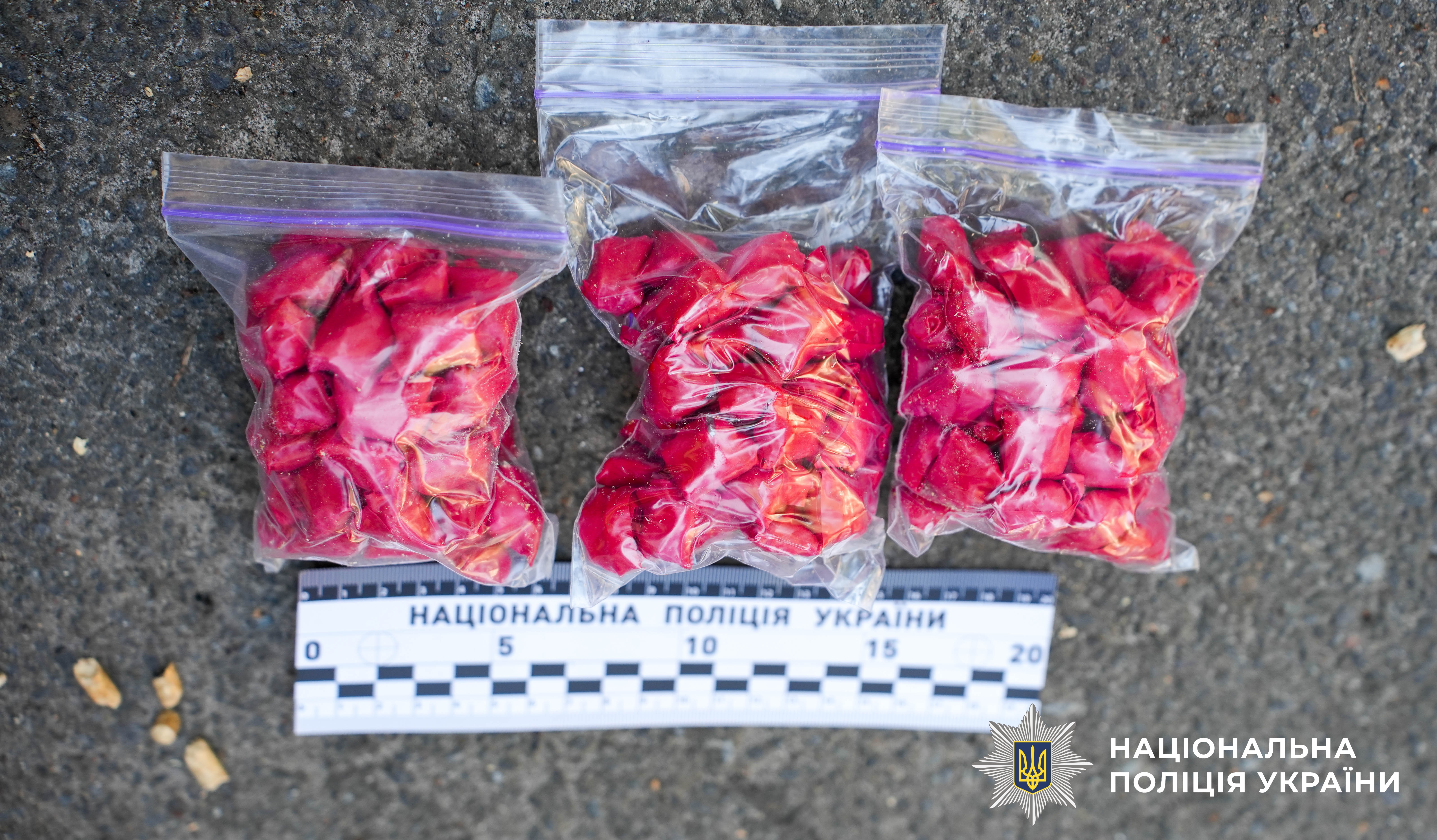Під час поверхневої перевірки у наркозбувача виявили та вилучили: 148 закладок особливо небезпечної психотропної речовини загальною вагою близько 250 грам та два мобільних телефони.