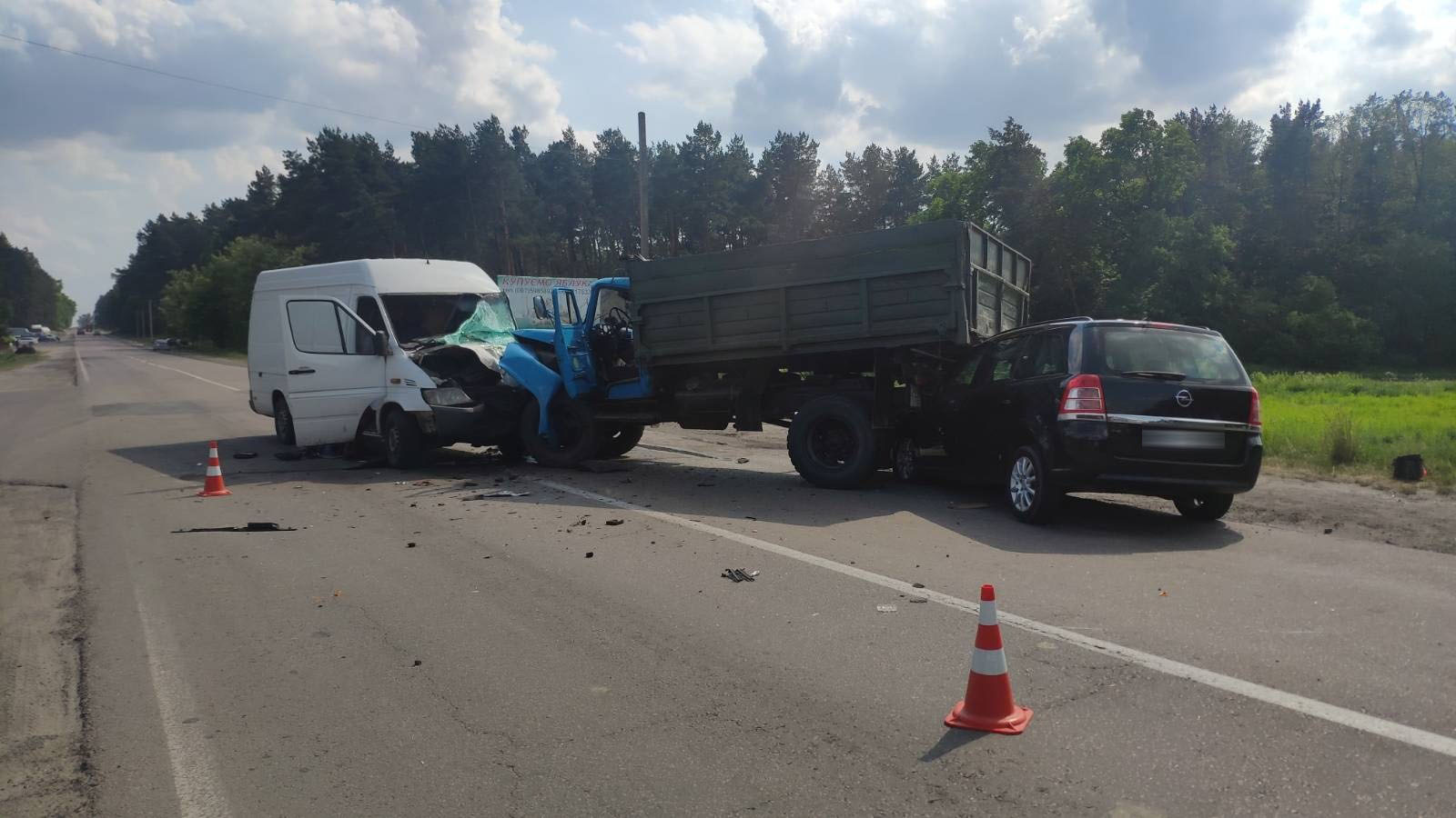 Внаслідок ДТП до лікарні доставили чотирьох осіб: водія та пасажира буса, кермувальника вантажівки та пасажирку легковика.