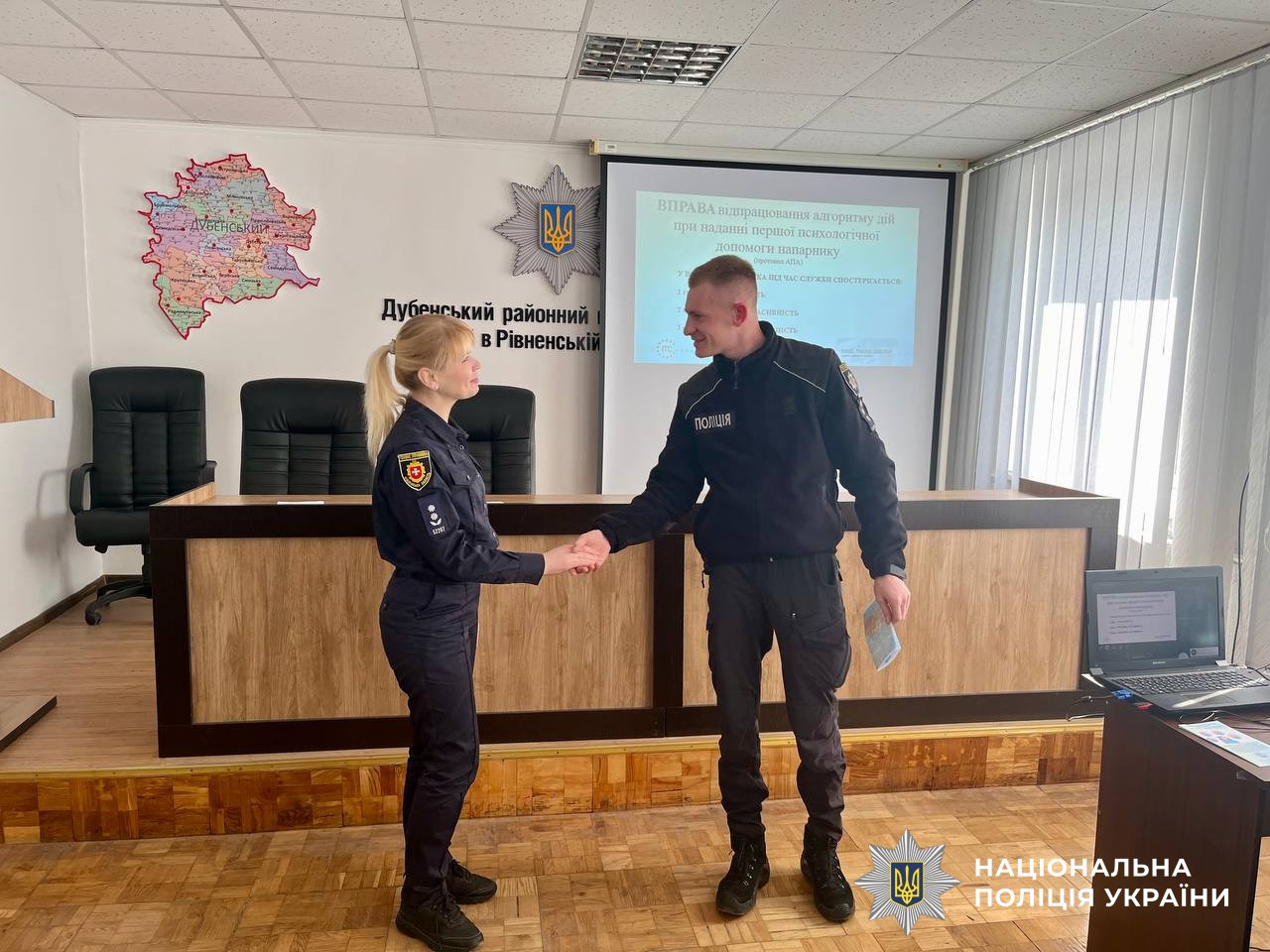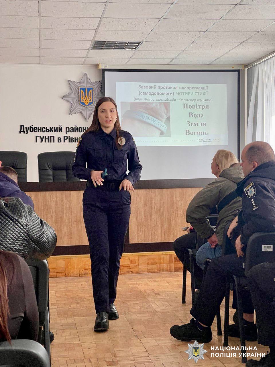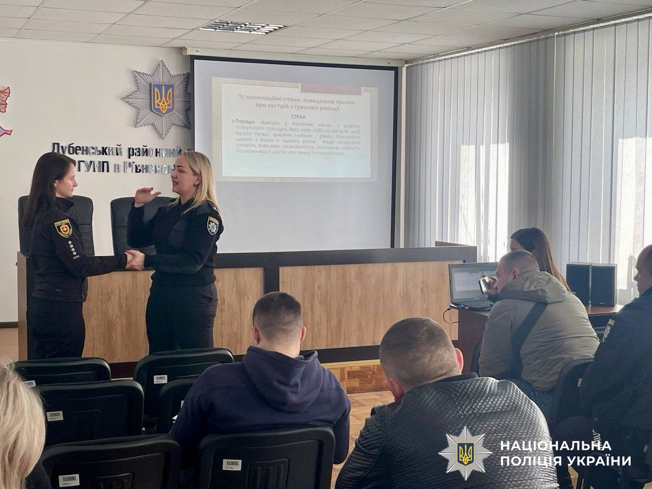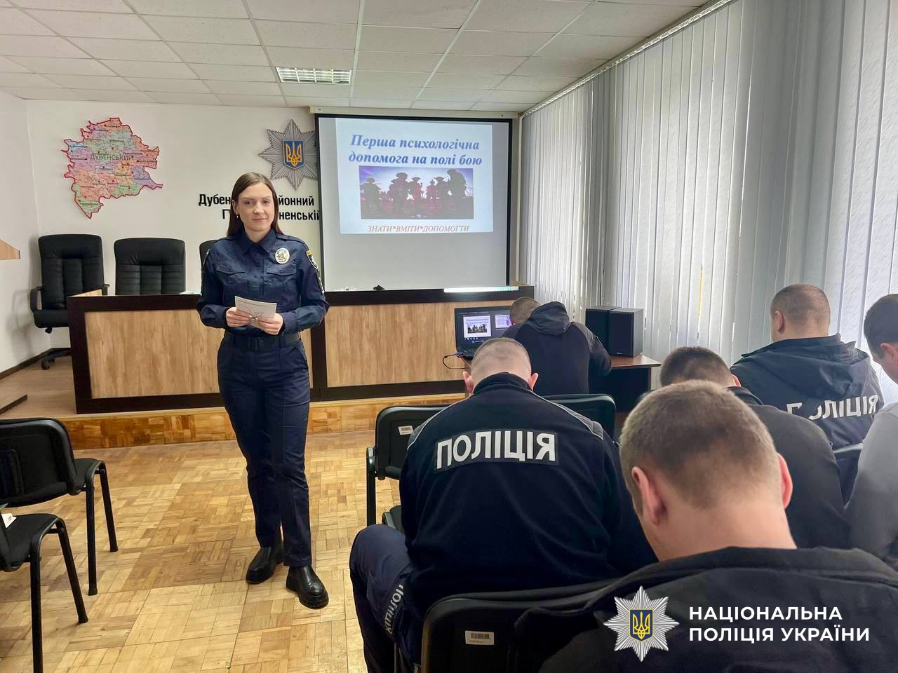 22 березня фахівці служби психологічного забезпечення провели практичний психоедукаційний захід із поліцейськими Дубенського районного відділу поліції ГУНП, у відповідності із програмою «Основи психологічної самодопомоги та роботи з особовим складом з підвищення стресостійкості під час виконання службових обов’язків».
