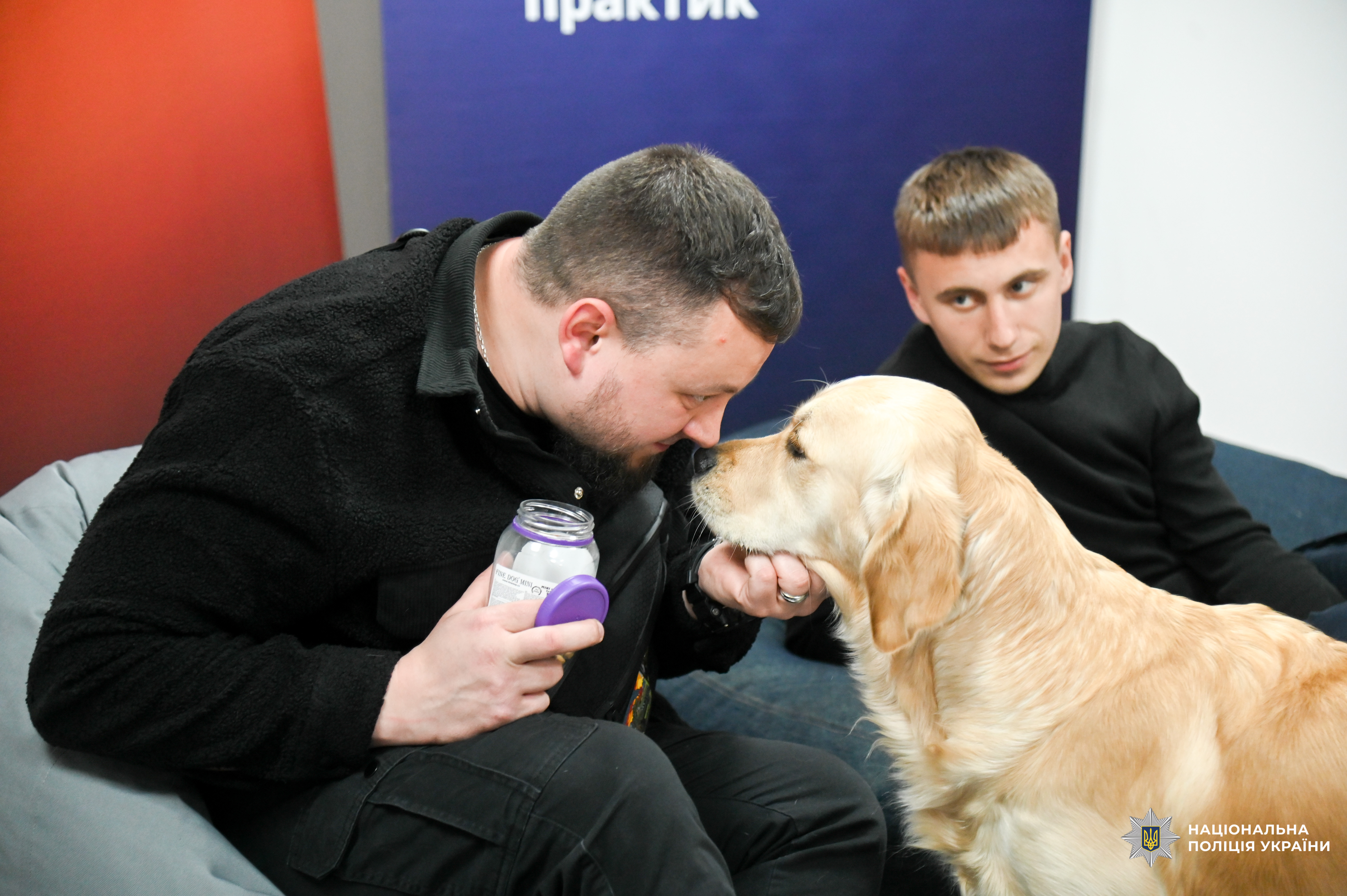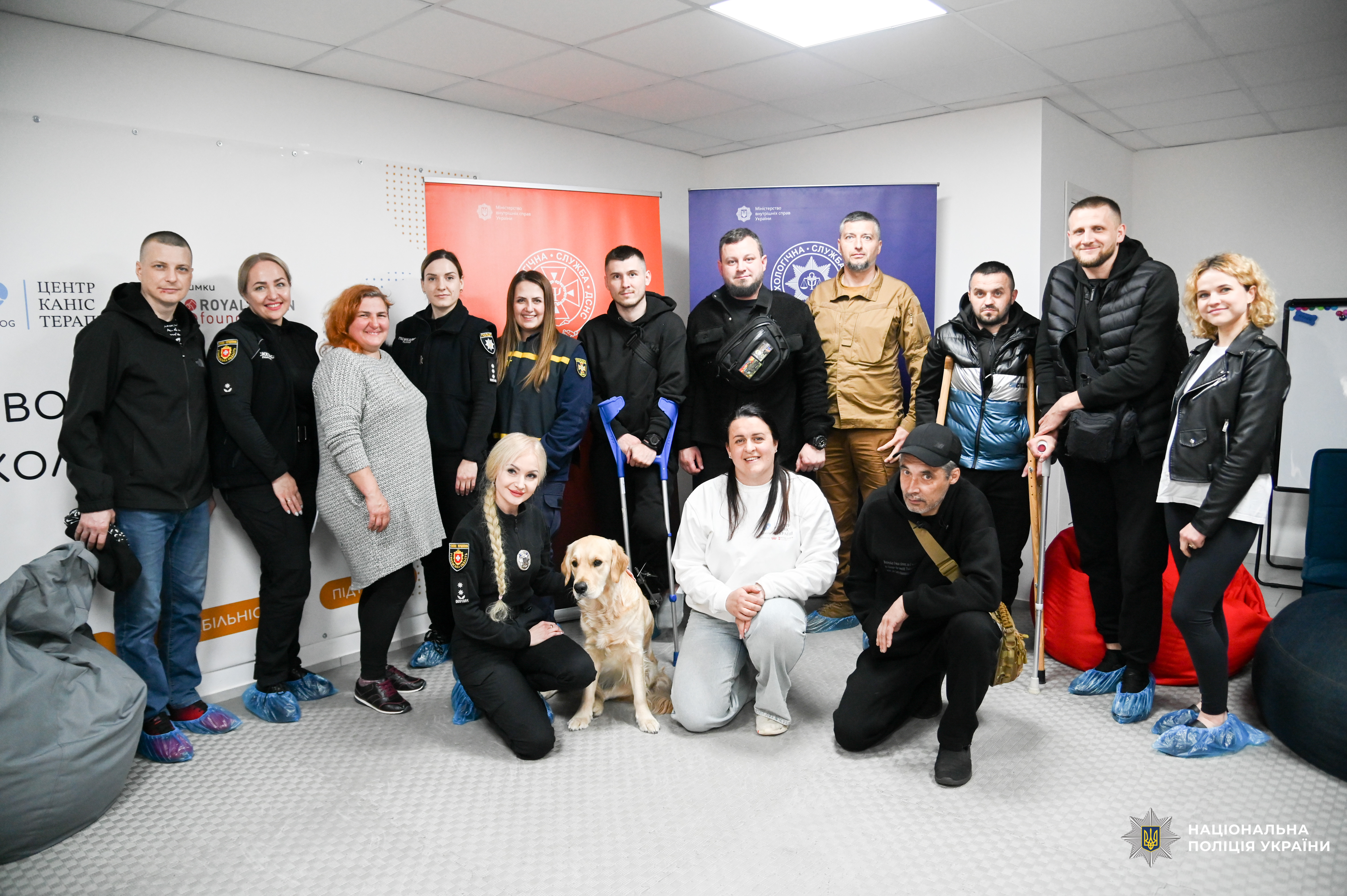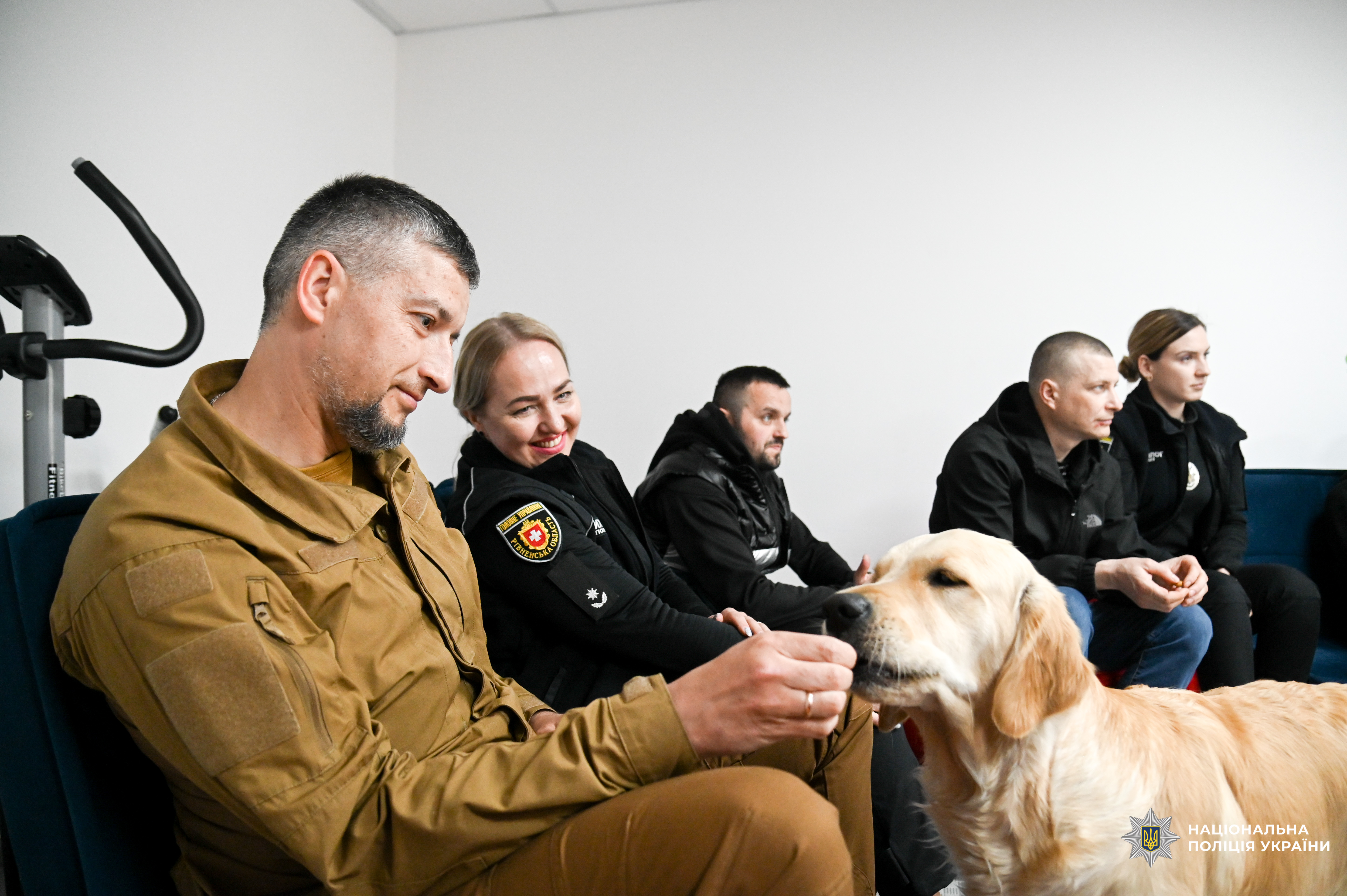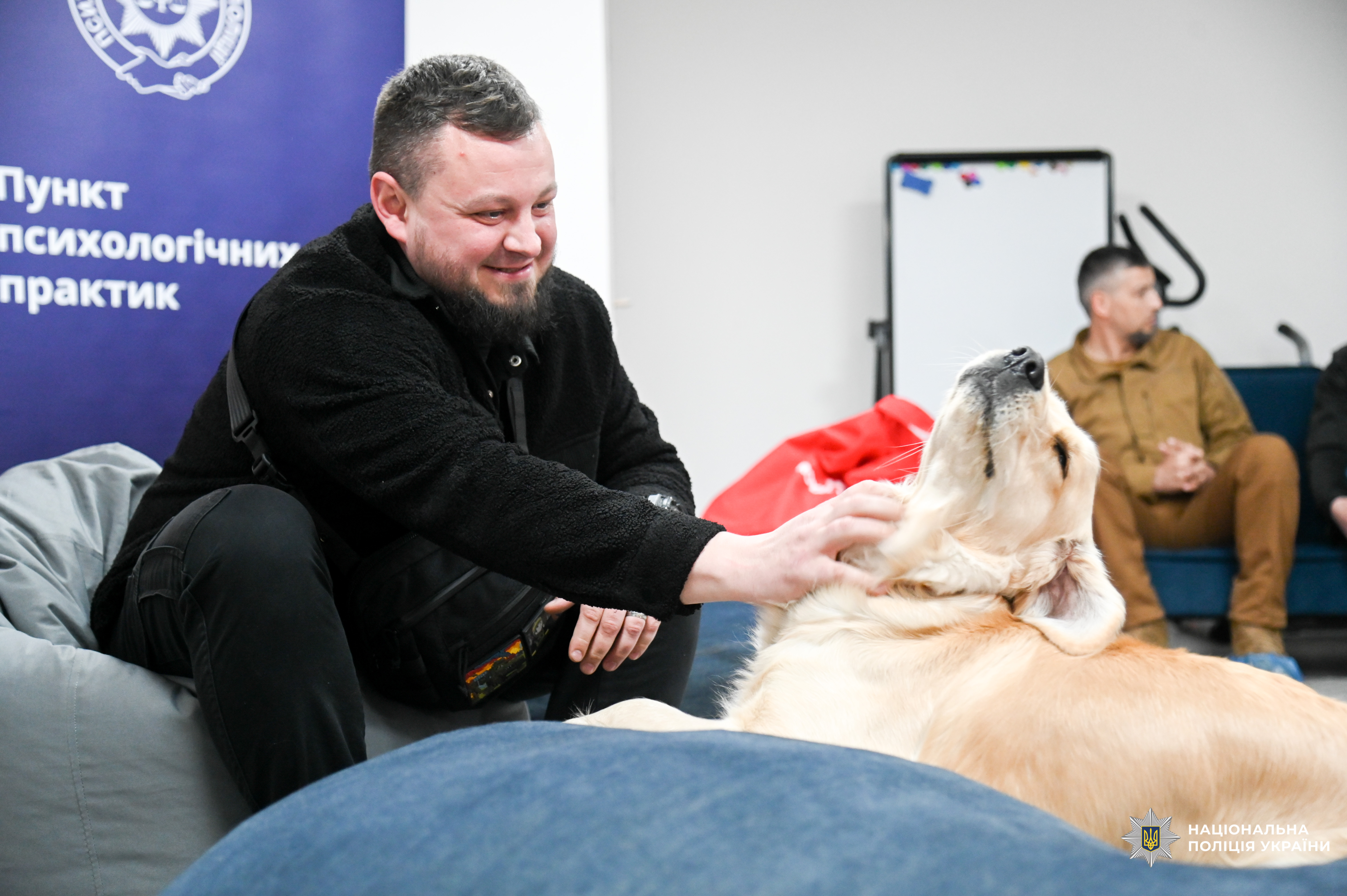 У межах спільного проєкту МВС «Пункт психологічних практик» у співпраці з центром «ДОКАДОГ» фахівці провели для захисників сеанс каністерапії. Вони уважно стежили за динамікою емоційного стану учасників, зчитували невербальні сигнали та використовували реакції собаки як додатковий індикатор внутрішнього стану бійців.