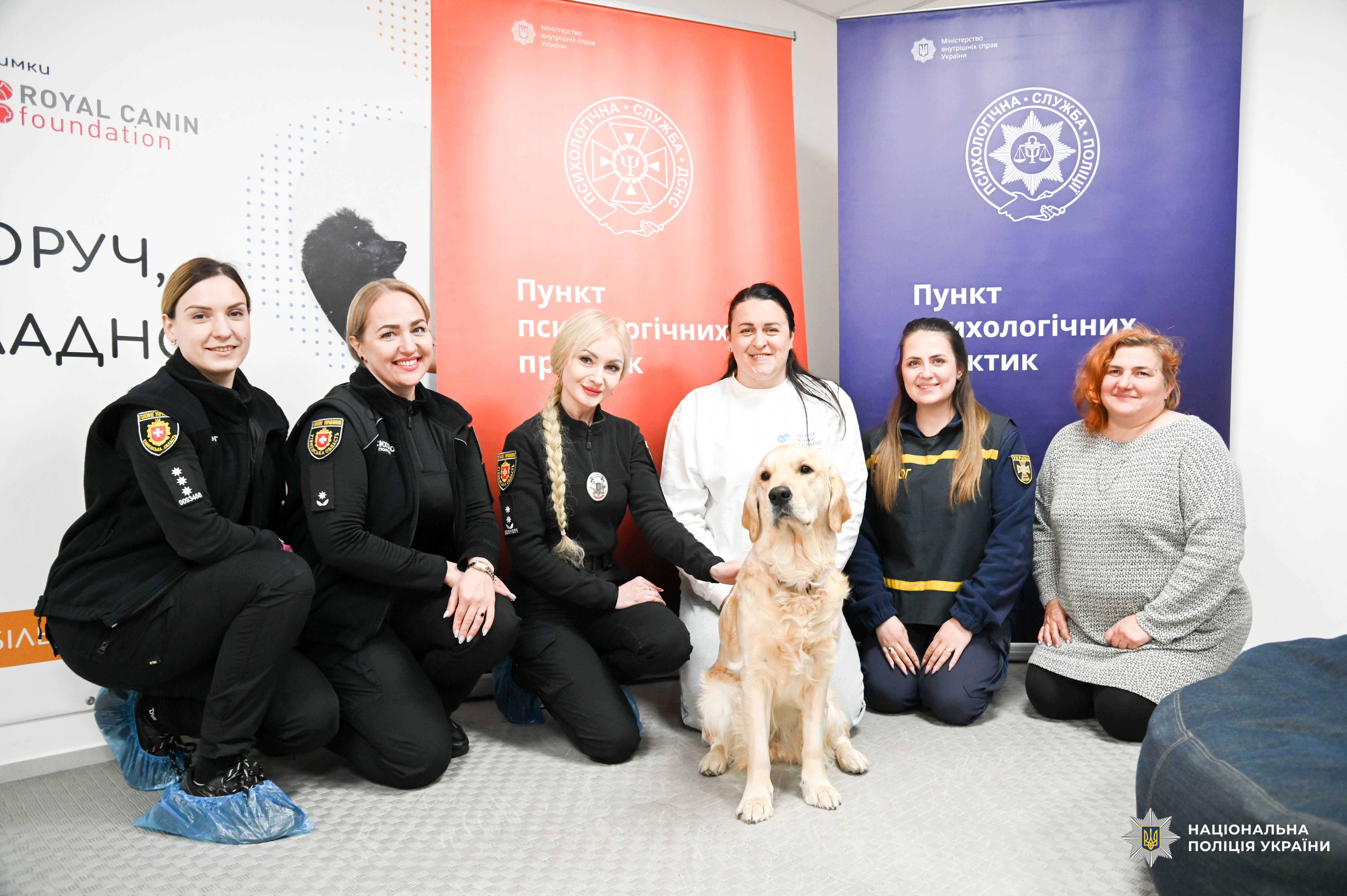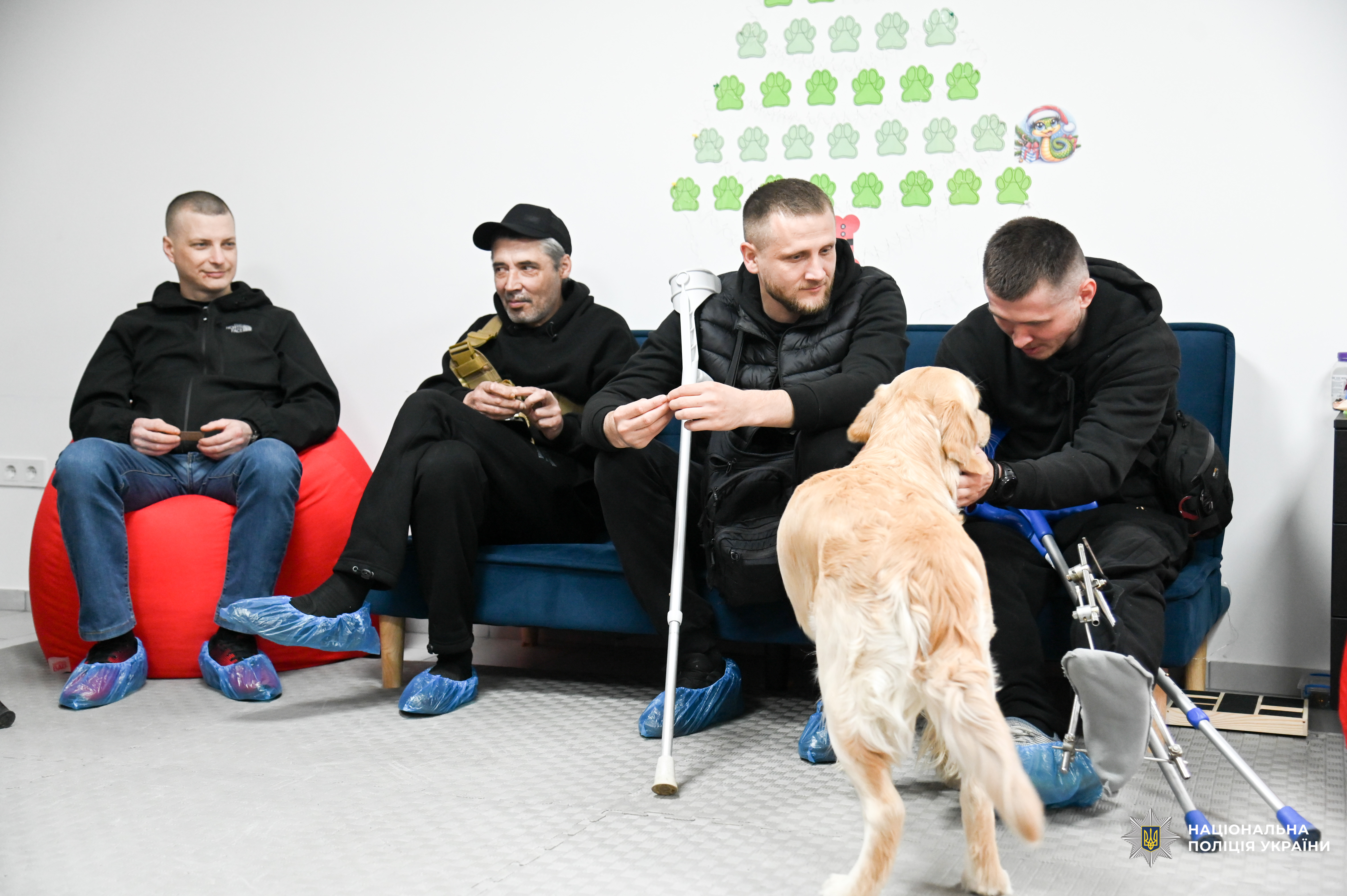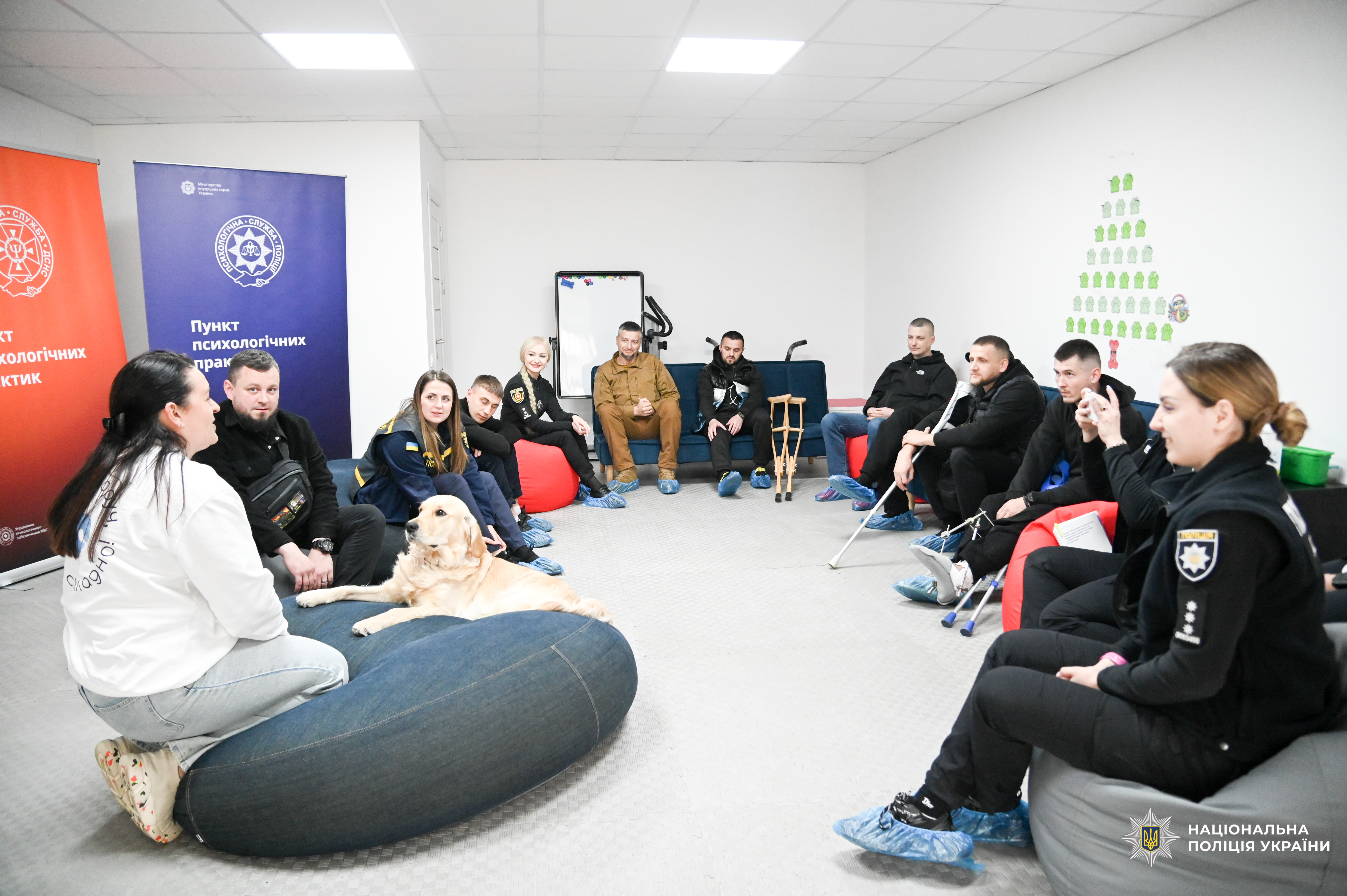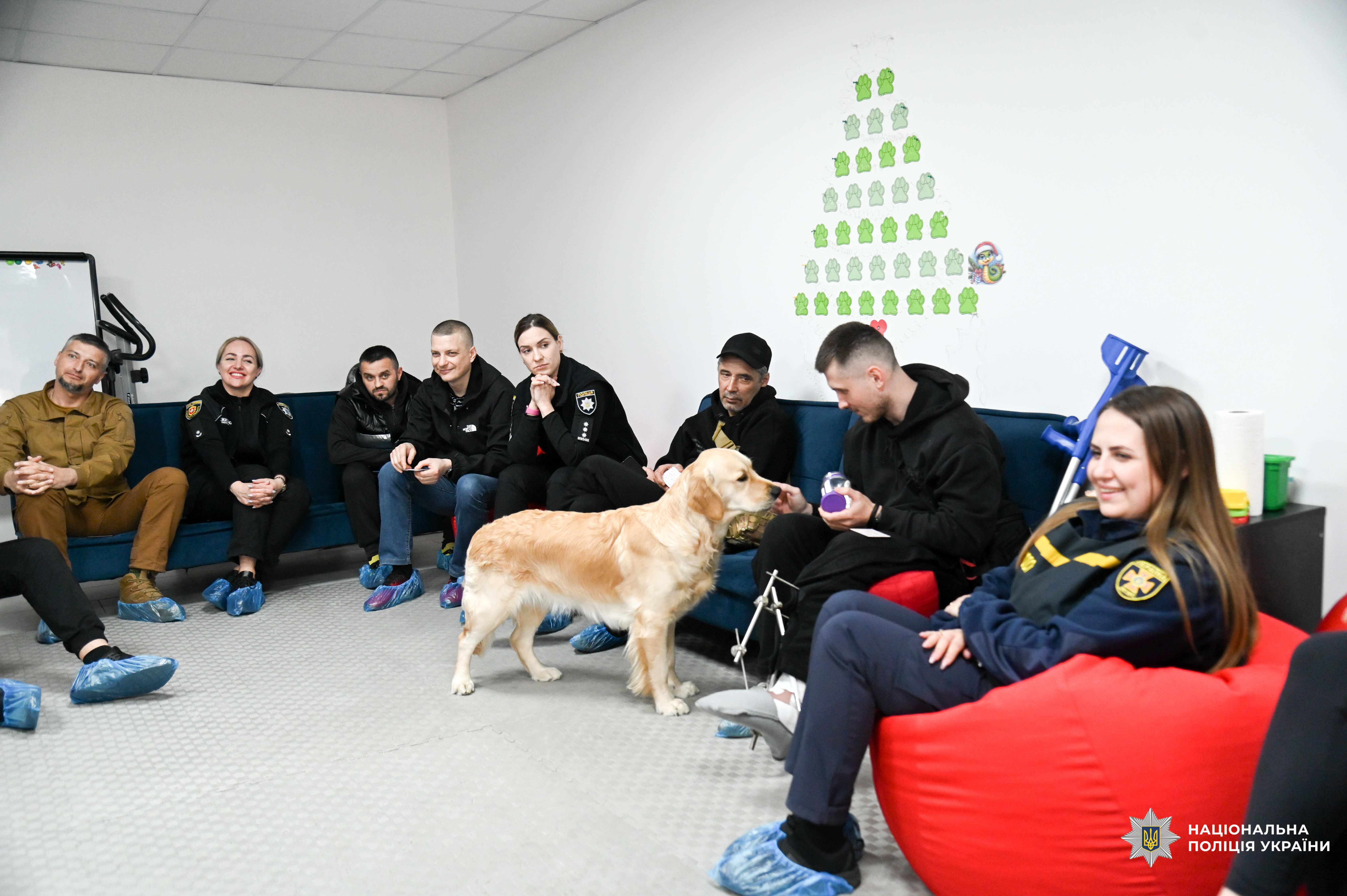 У межах спільного проєкту МВС «Пункт психологічних практик» у співпраці з центром «ДОКАДОГ» фахівці провели для захисників сеанс каністерапії. Вони уважно стежили за динамікою емоційного стану учасників, зчитували невербальні сигнали та використовували реакції собаки як додатковий індикатор внутрішнього стану бійців.