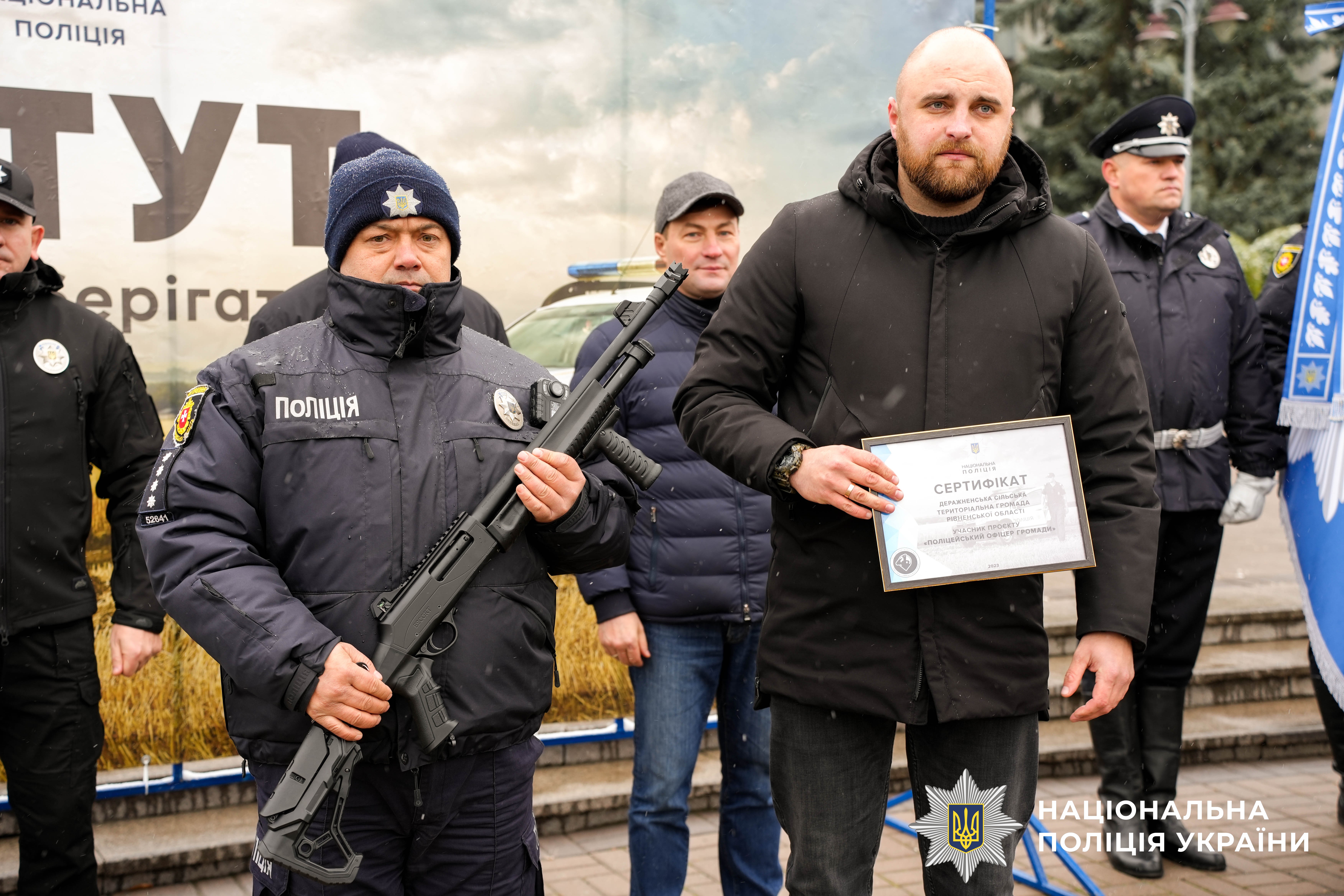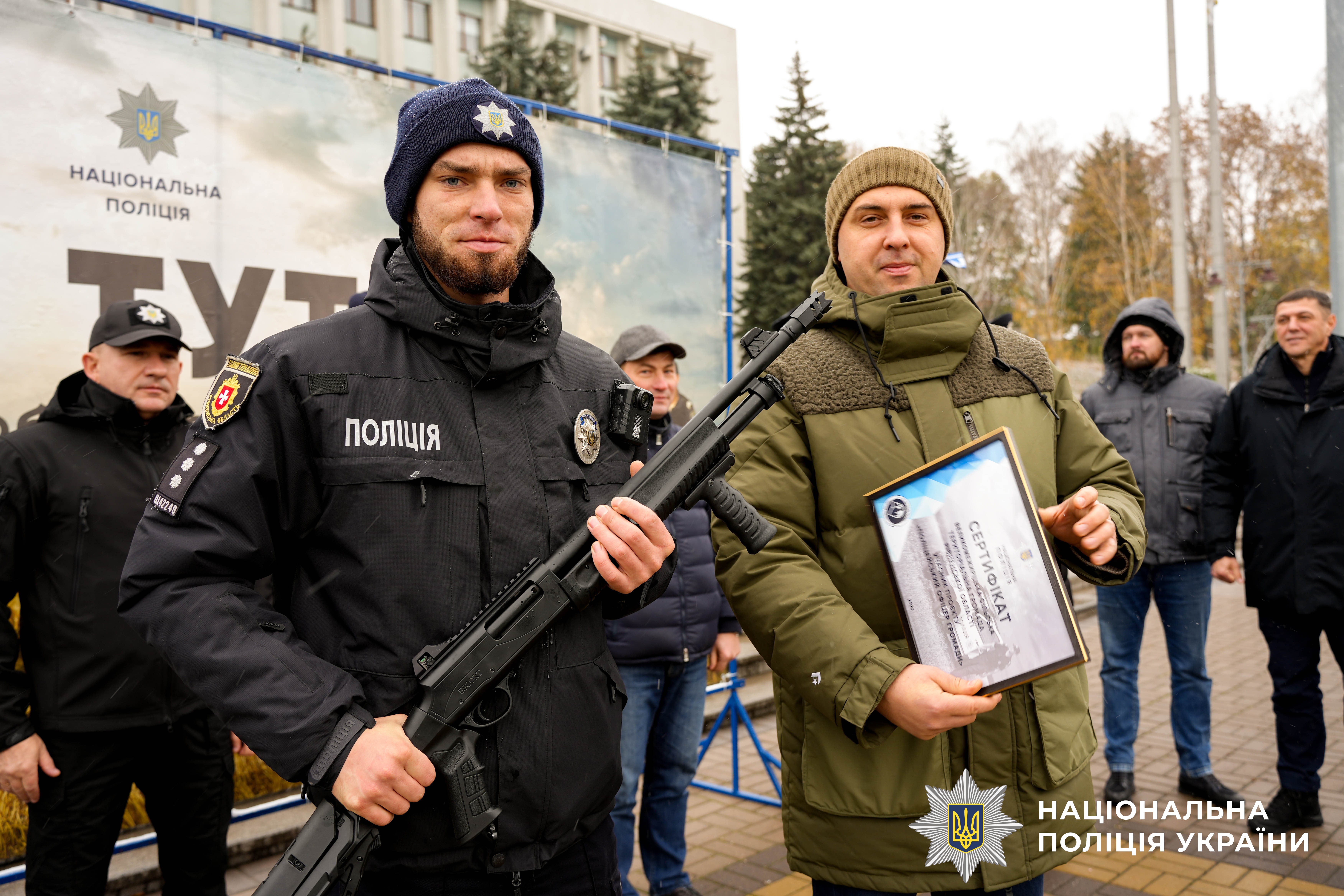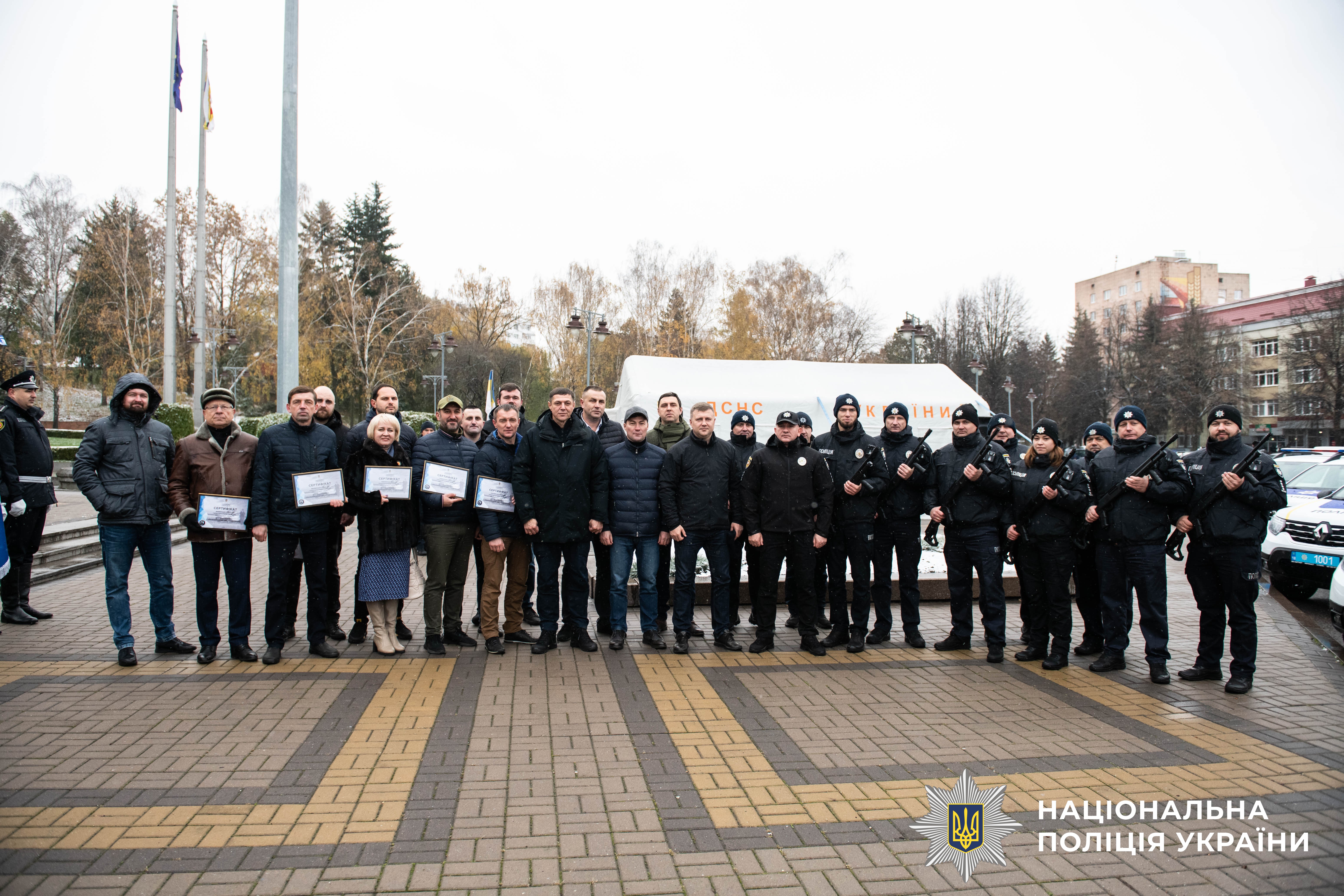 Після вітальних слів Віталій Коваль, Андрій Карауш та керівник поліції області Віктор Шанський вручили очільникам громад сертифікати та ключі від транспортних засобів, а поліцейським — помпові рушниці.