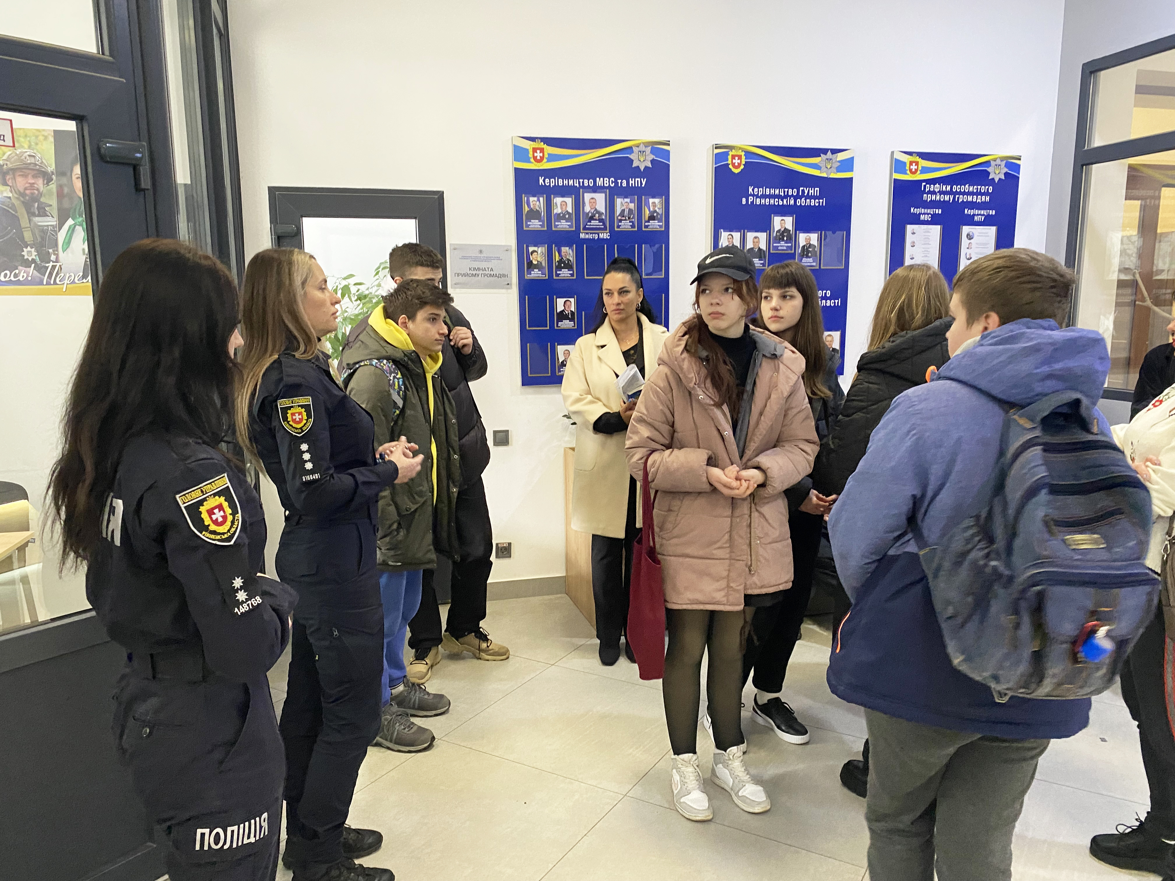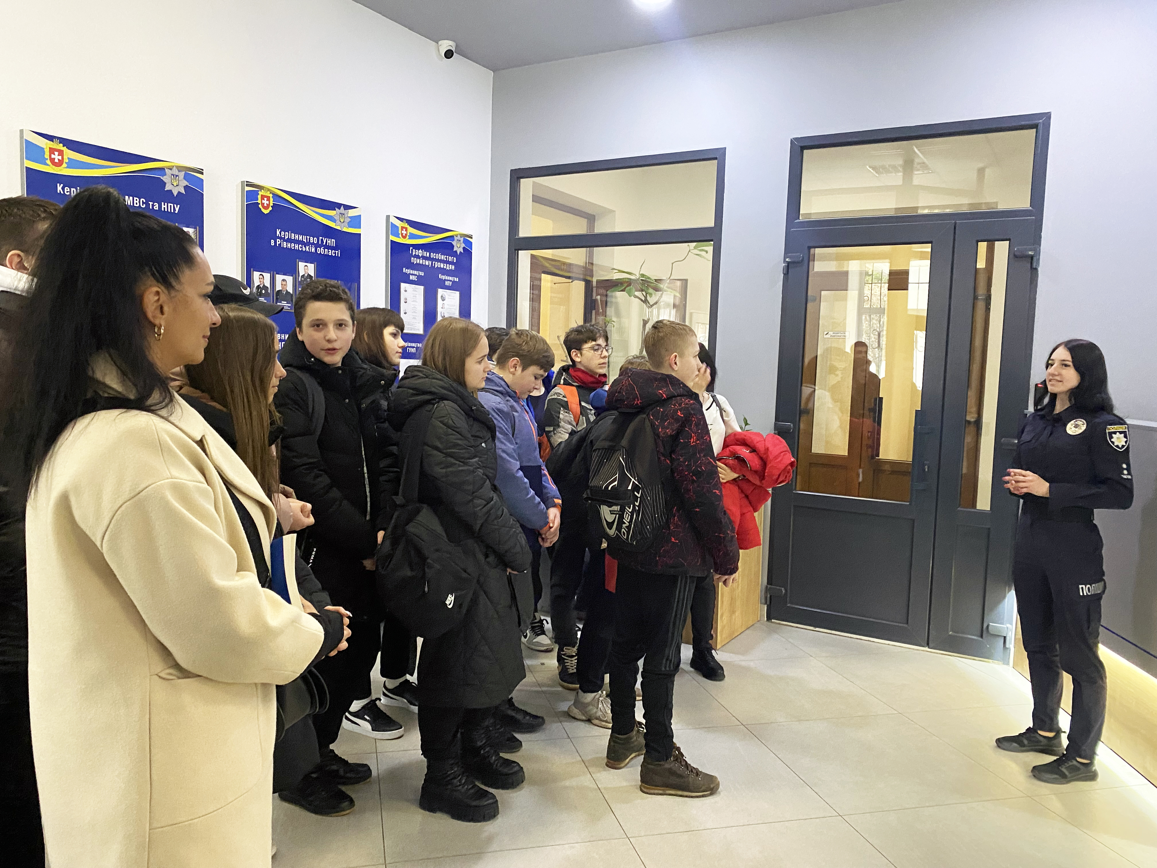 Сьогодні, восьмикласники Рівненського ліцею № 1 завітали у Рівненське районне управління поліції. Працівники ювенальної превенції спільно з представником Громадської організації «Ангели життя» організували їм екскурсію.