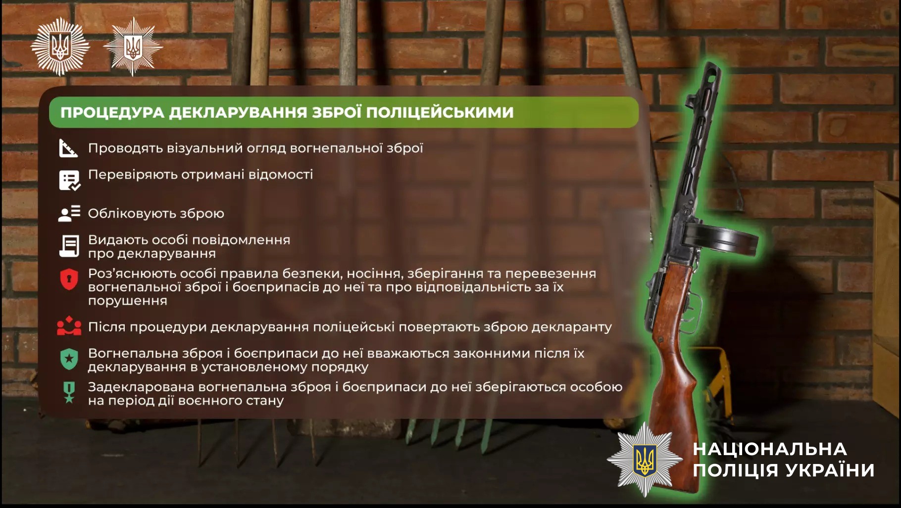 - Упродовж 24 годин прибути до найближчого підрозділу поліції за місцем Вашого перебування для декларування зброї або боєприпасів