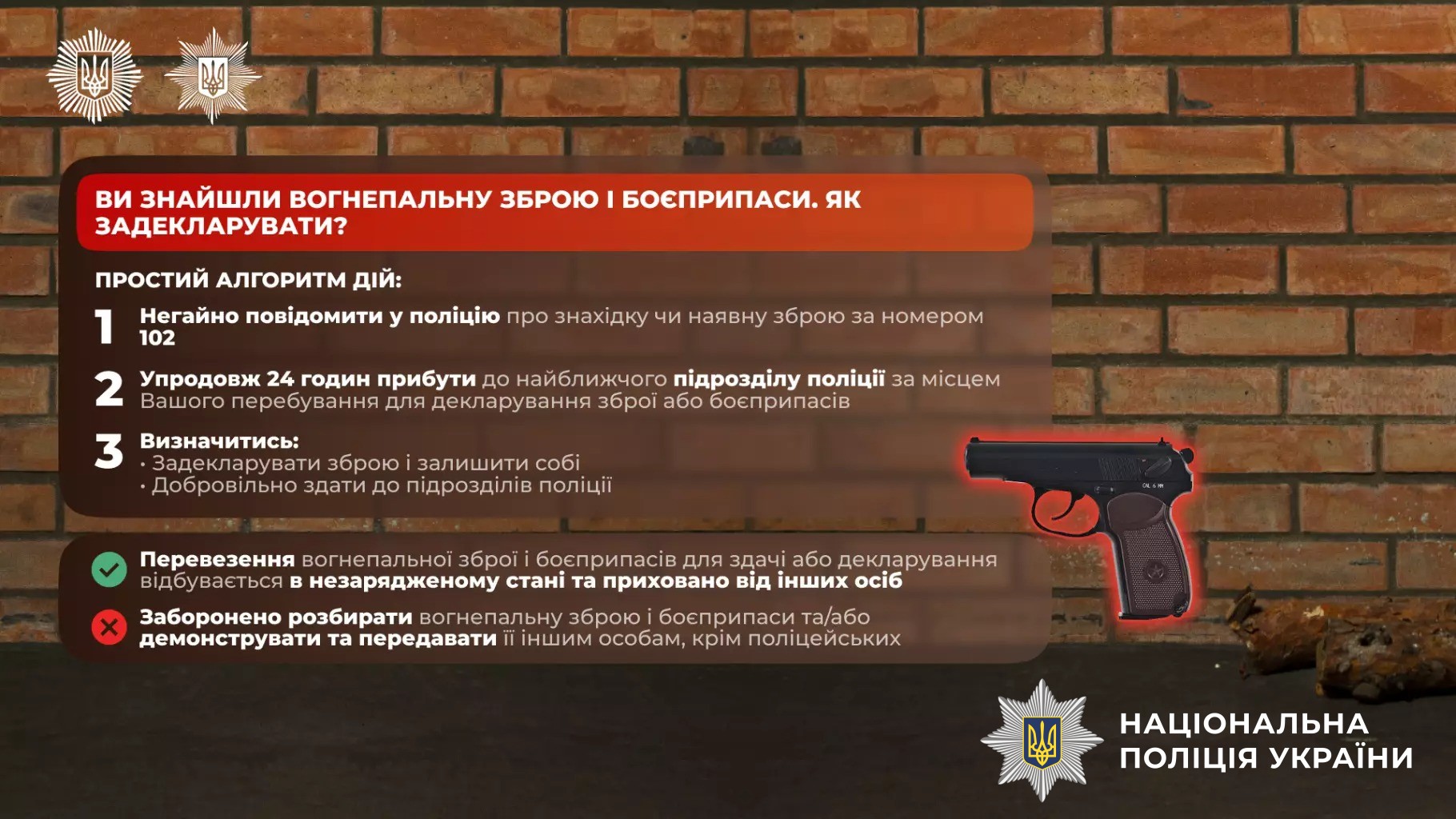 Якщо ви знайшли вогнепальну зброю та боєприпаси до неї, вам необхідно негайно їх задекларувати. Зробити це можна у підрозділах Національної поліції.