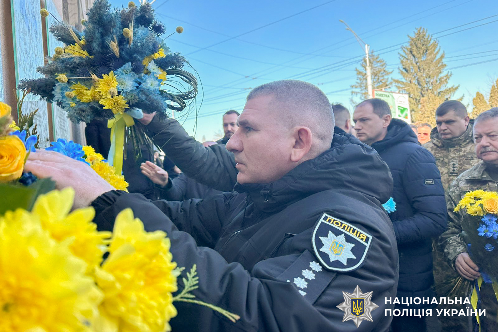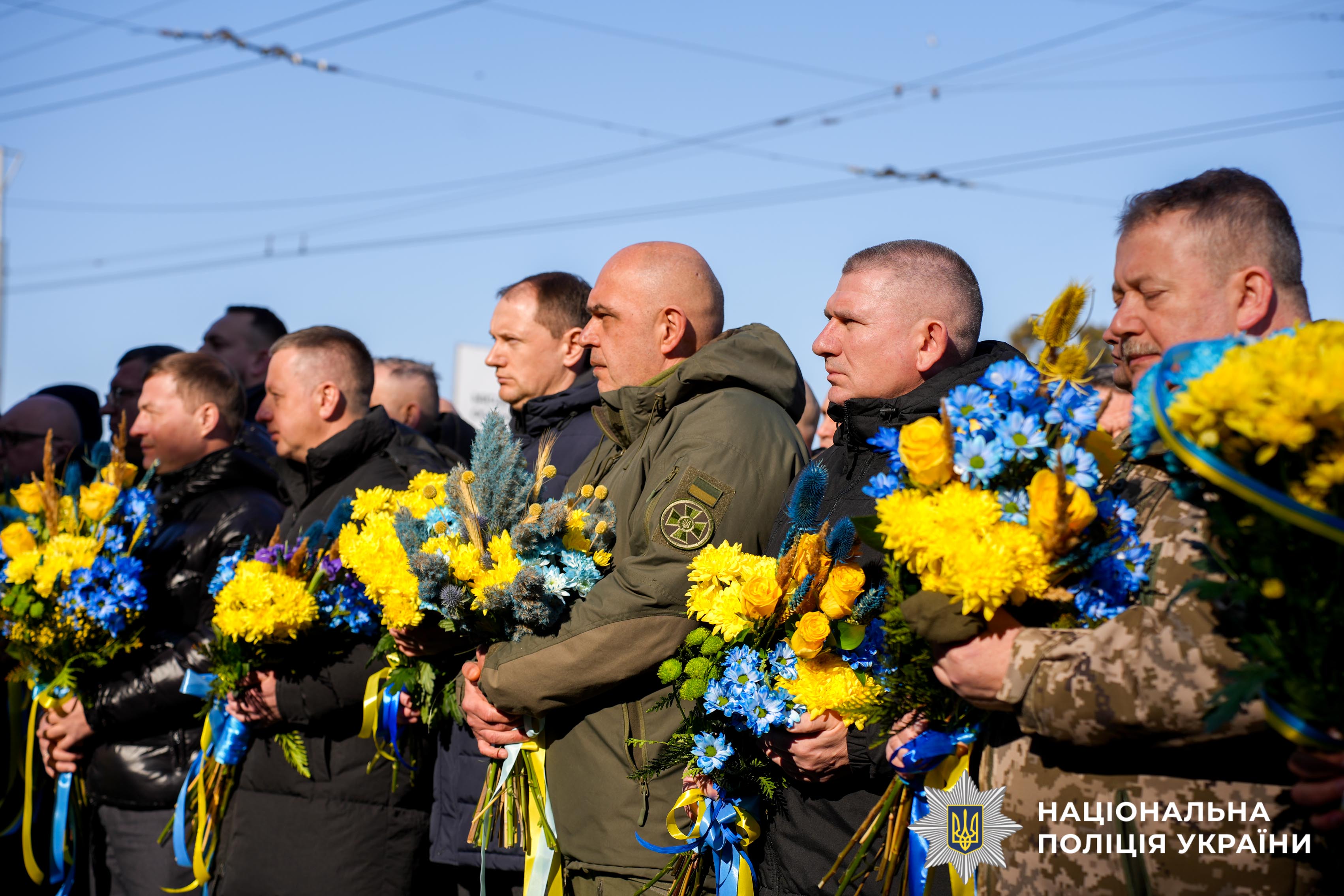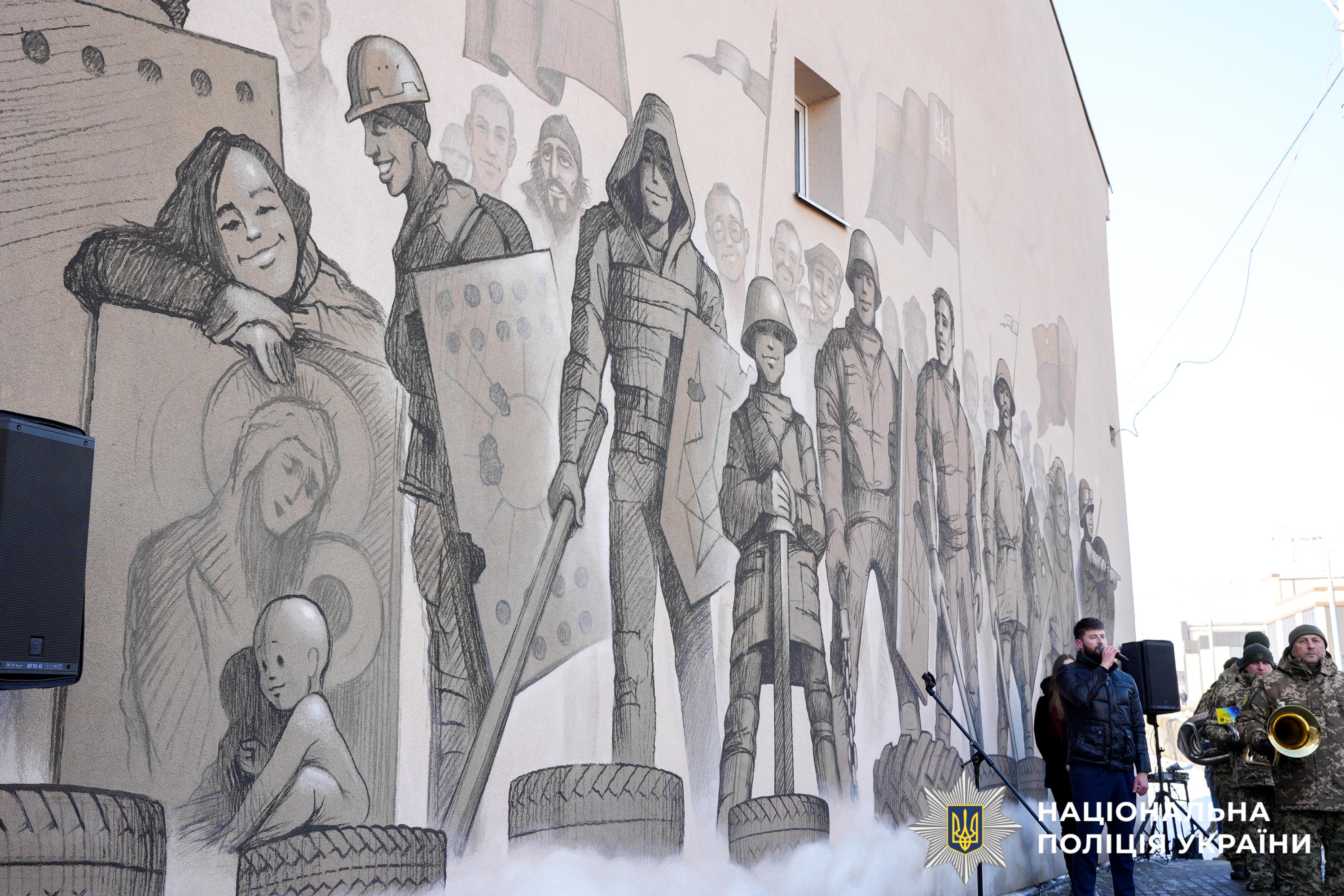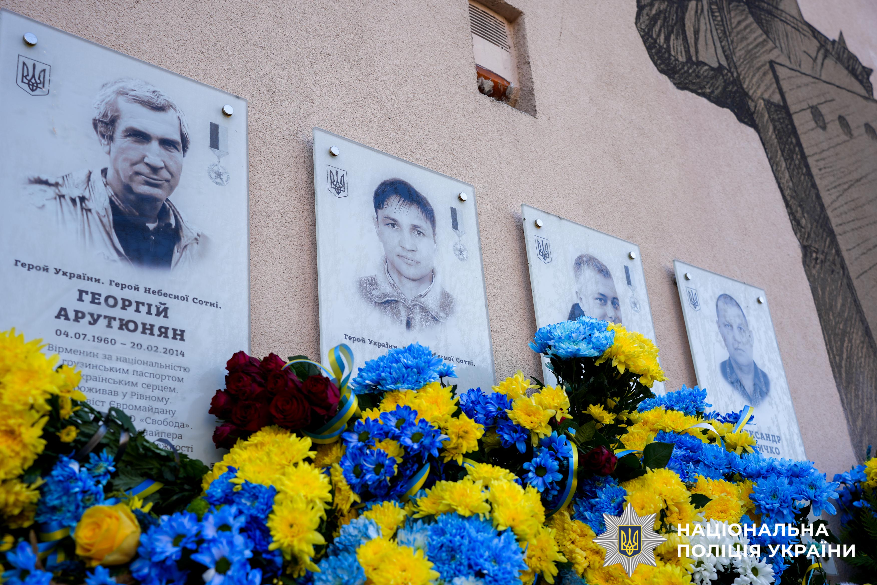 Очільник поліції Рівненщини Віктор Шанський разом із присутніми біля муралу Героїв Небесної Сотні хвилиною мовчання вшанували загиблих учасників Революції Гідності та в пам'ять про їхню самовідданість і мужність символічно поклали квіти.