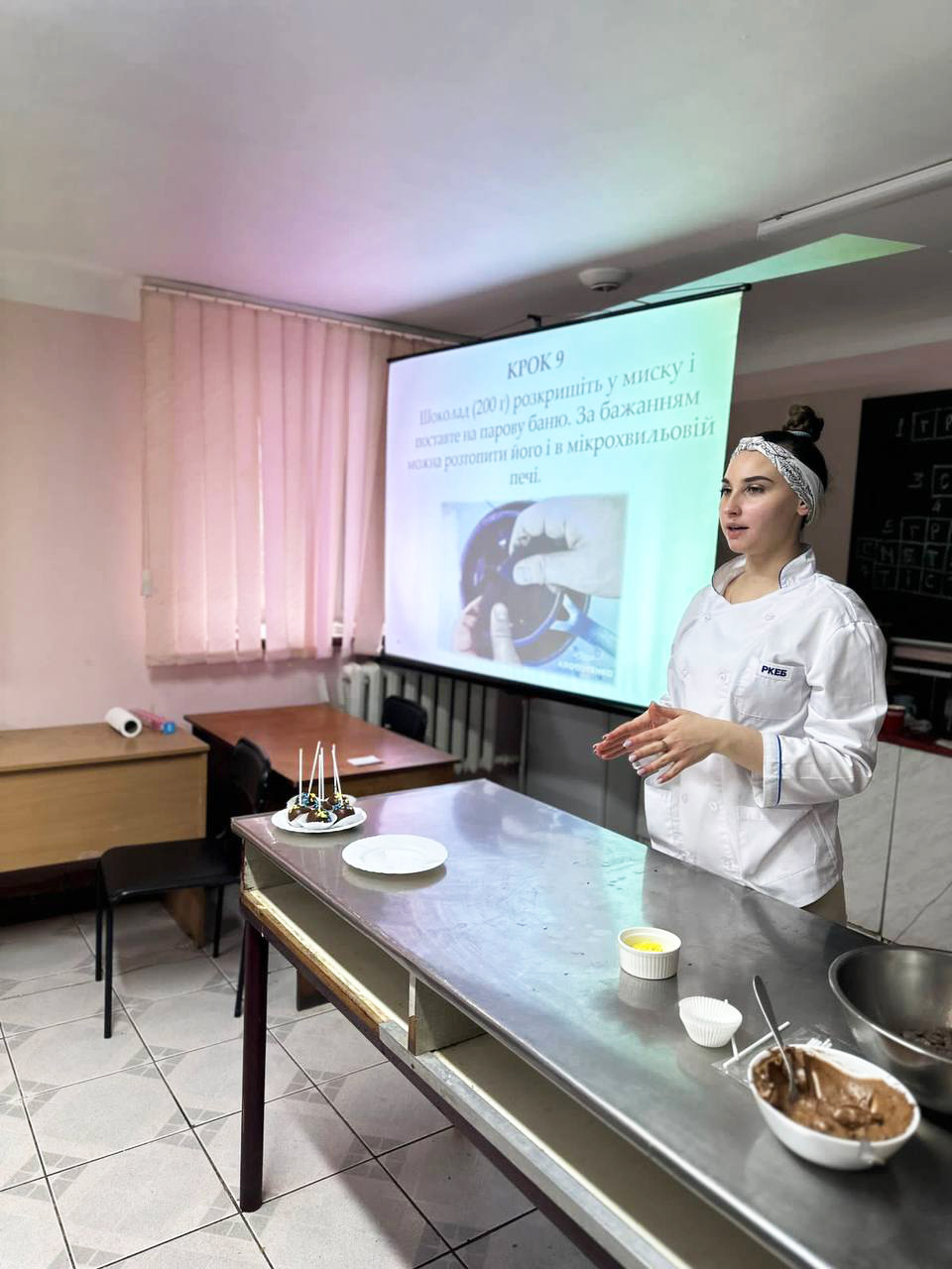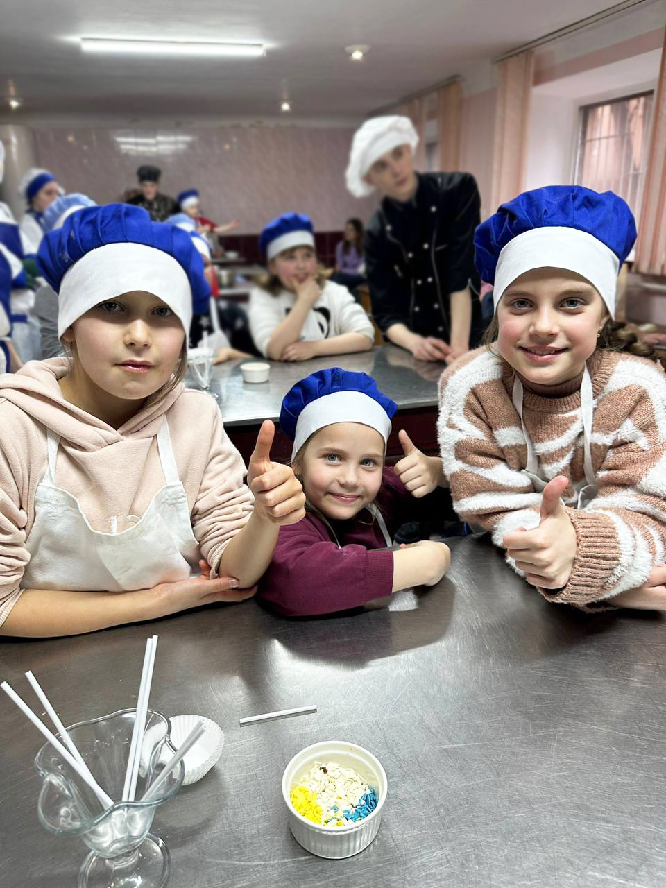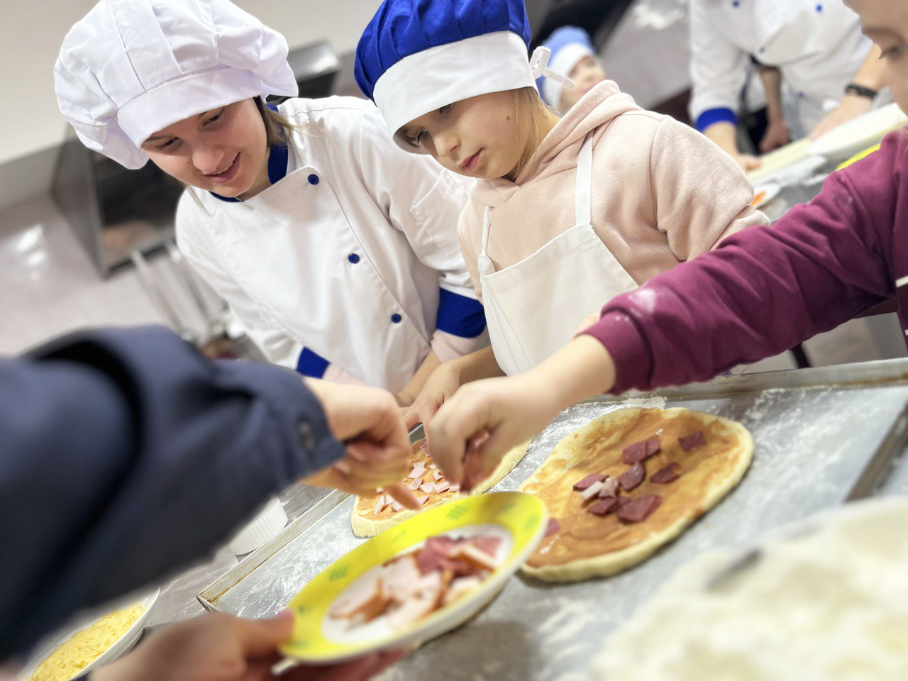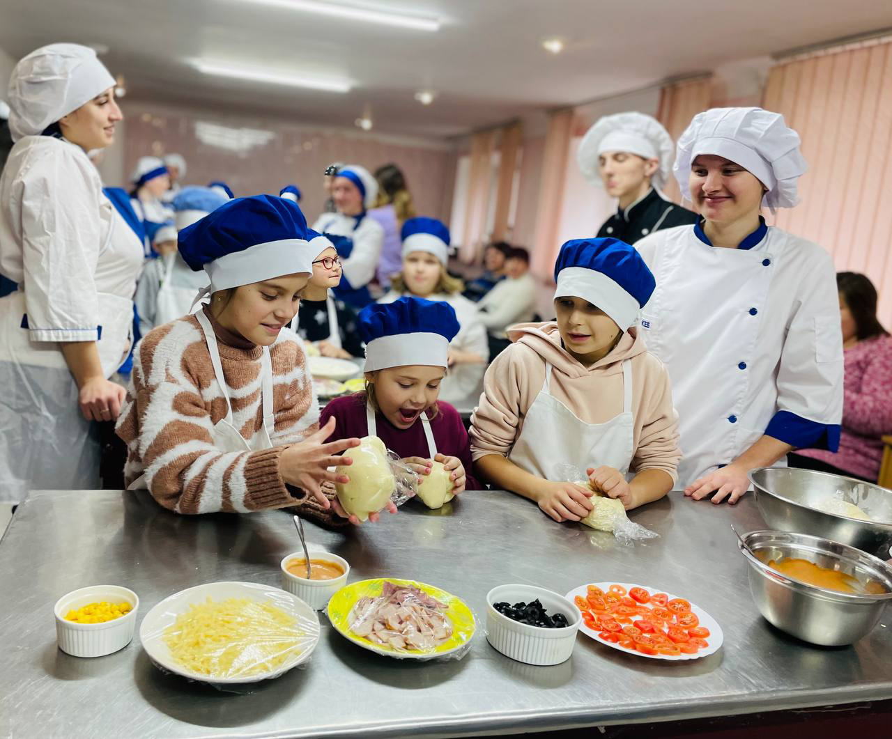 Одягнули кухарські фартухи, ковпаки і — до роботи. Юні кулінари під керівництвом студентів коледжу готували піцу та кейк-попси. Продумали усе, аби діткам було зручно – біля кожного робочого місця стояли окремі посудини з тістом та різноманітною начинкою.