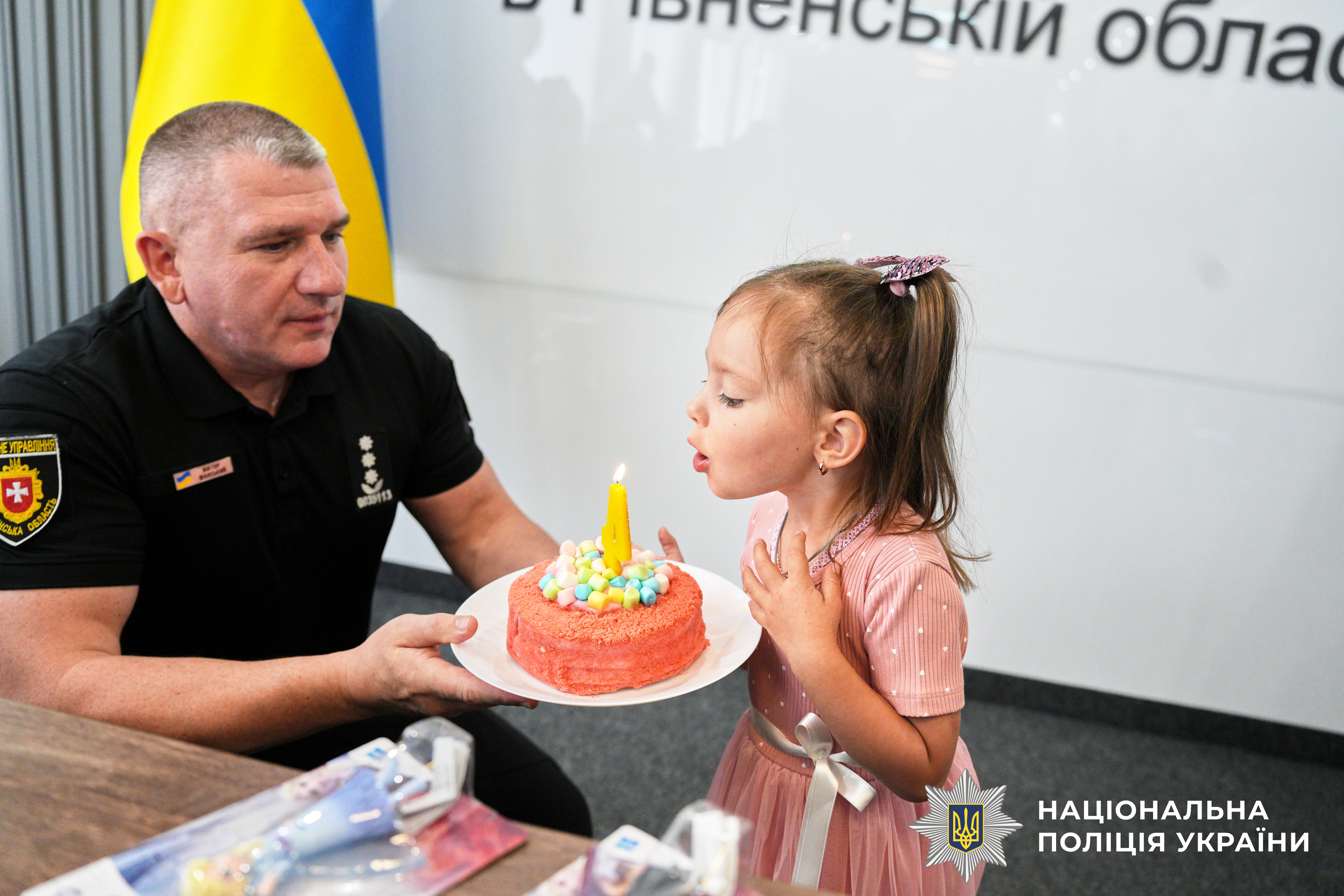 Нині Алінці виповнилось чотири роки, тож татові колеги підготували для неї сюрприз. Спочатку отримала від бійців КОРДу квіти та багато уваги, а потім разом із головним поліцейським області Віктором Шанським задмухала свічку на святковому торті.